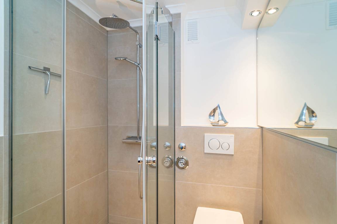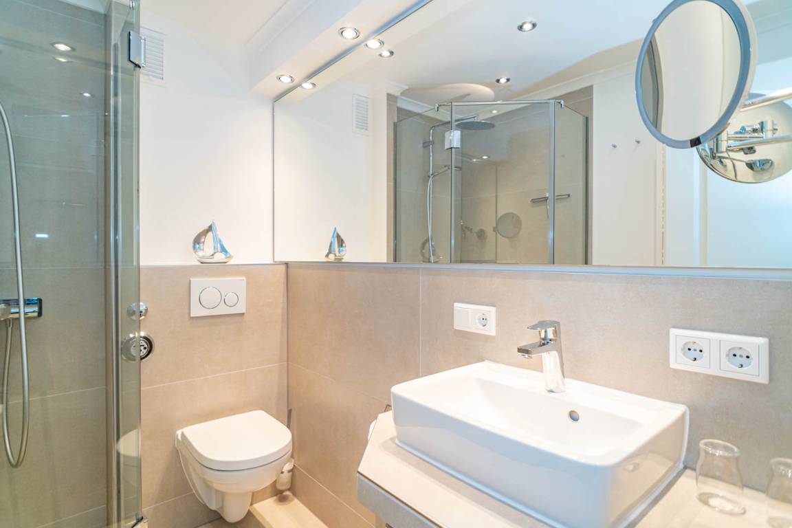 Das helle, moderne Duschbad/WC ist mit einem Waschtisch, Kosmetikspiegel, Handtuchtrockner sowie Fön ausgestattet.