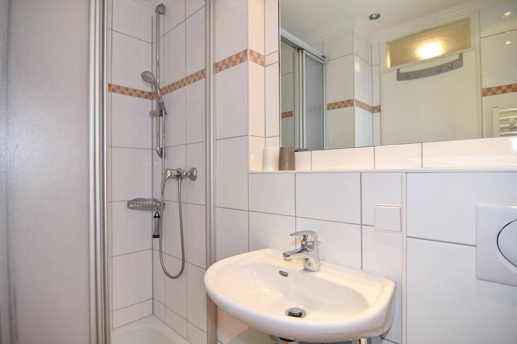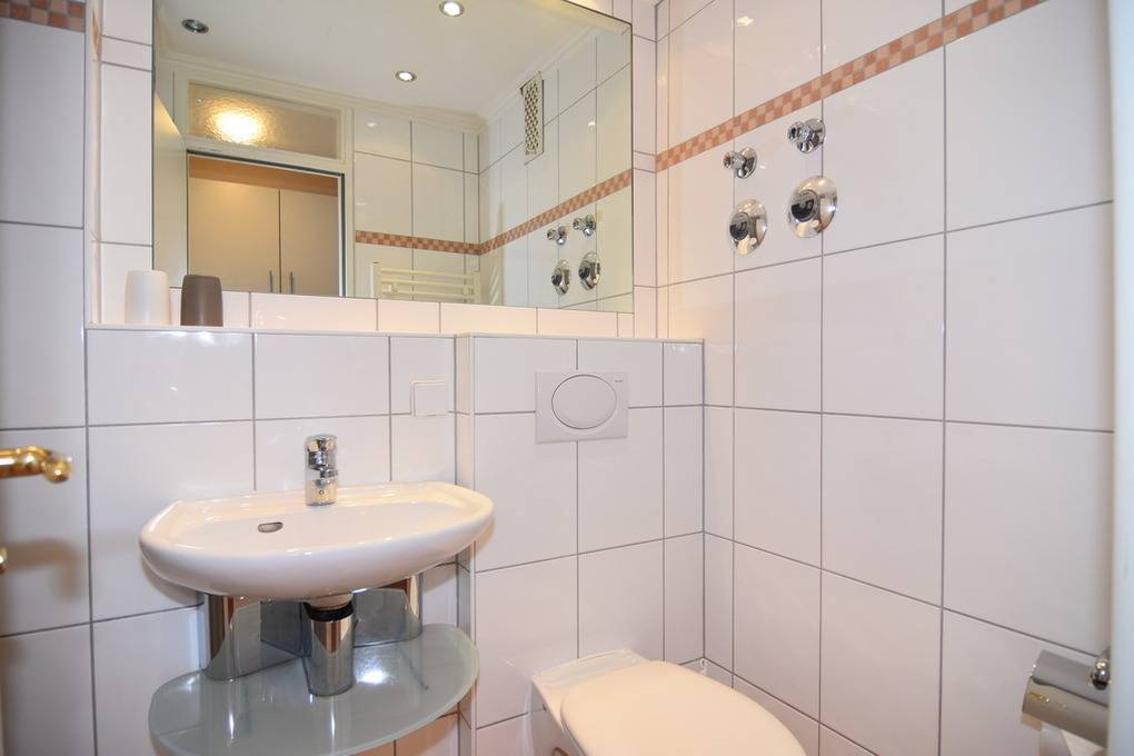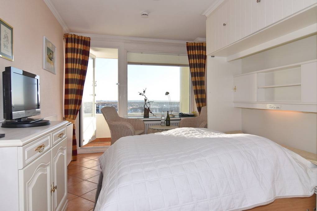Gepflegte 1-Zimmer-Ferienwohnung, ca. 23 m², 11. OG im Haus Metropol. Nichtraucher-Whg.! Wohn-/ Schlafraum mit Doppelschrankbett (2 Matratzen), Essplatz am Fenster mit 2 Korbsessel, Radio, Kabel-TV, WLAN (ohne Gewähr), Ostbalkon mit Blick über die Insel, Küchenzeile im Flur mit Mikrowelle/Grill und Geschirrspüler, Duschbad/WC. Das Apartment ist komplett mit Terrakottafliesen ausgelegt. Tierhaltung ist nicht gestattet. Bettwäsche und Handtücher sind zur Anreise aufgezogen. Ein PKW-Stellplatz kann kostenpflichtig zugebucht werden.