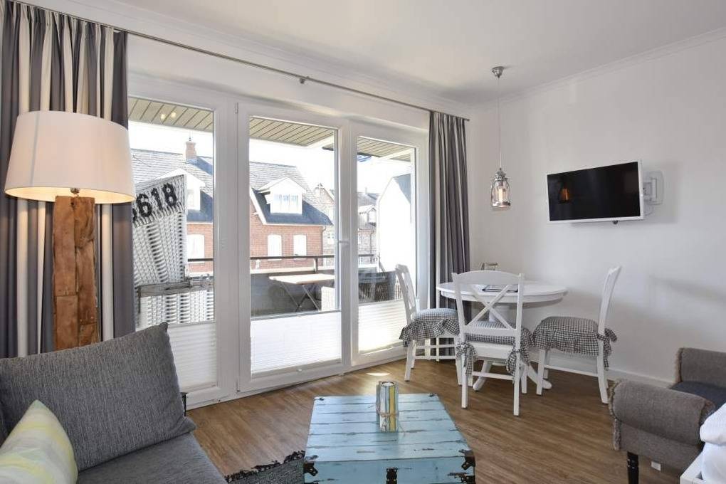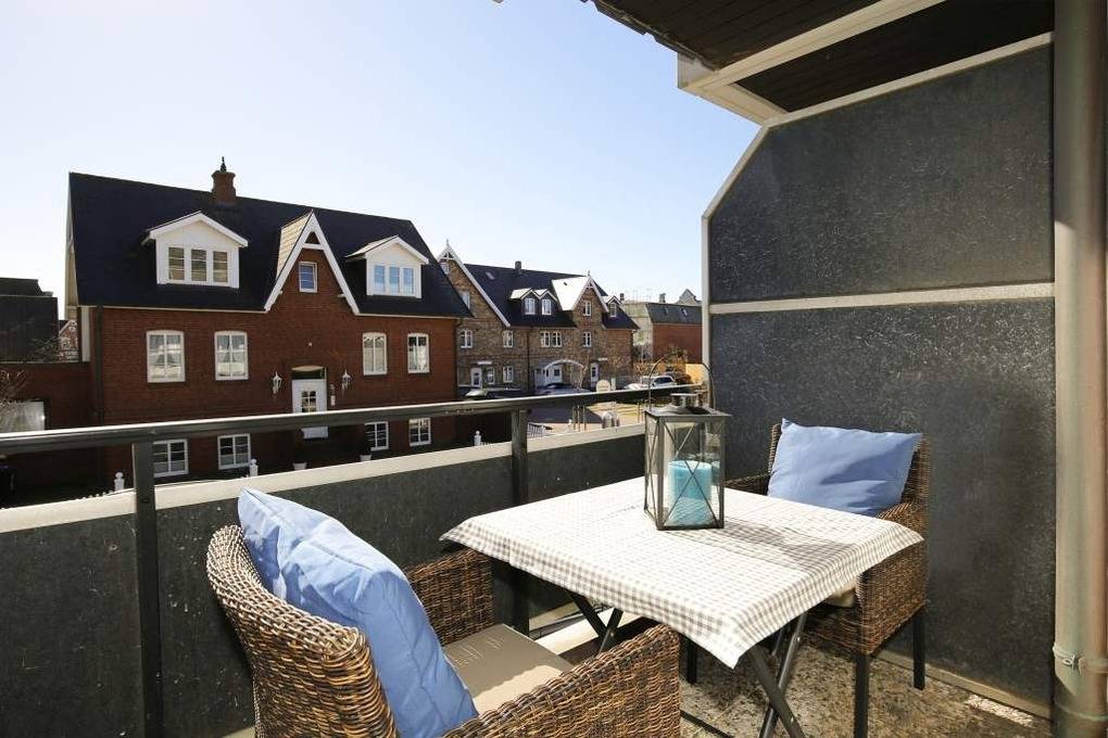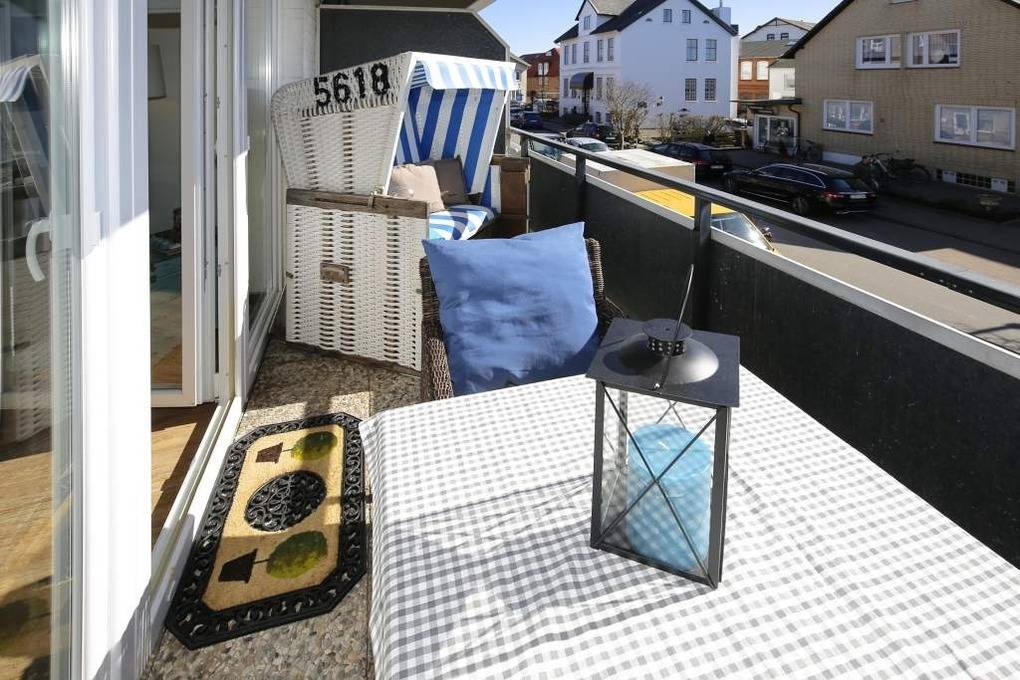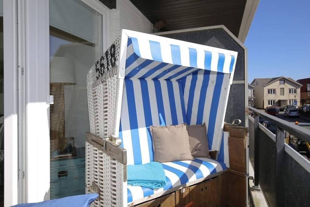 Ein Highlight ist der großzügige Südbalkon mit bequemer Sitzgarnitur und eigenem Strandkorb – hier genießen Sie Sonne satt und sogar einen freien Blick bis zur Düne am Weststrand.