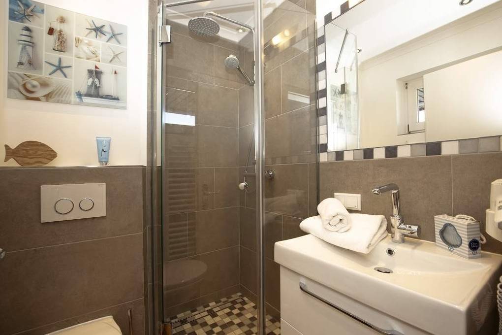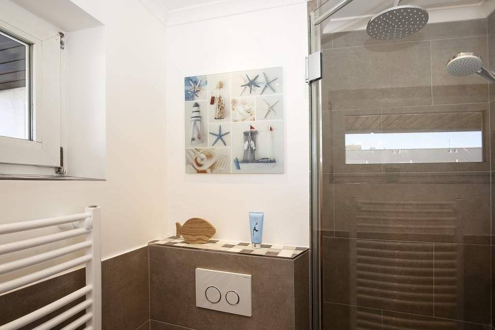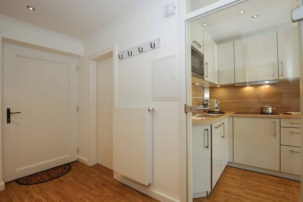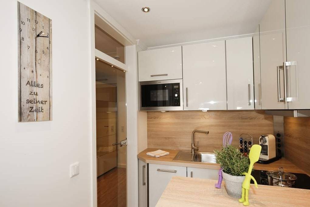 Vom geräumigen Vorflur aus gelangen Sie direkt in das moderne Duschbad mit extraflachem Einstieg, Handtuchtrockner, Waschtisch und Föhn. Die stilvolle Küche mit Theke ist voll ausgestattet und bietet unter anderem ein 4-Platten-Ceranfeld, eine Backofen-/Mikrowellenkombination, Kaffee- und Espressomaschine, Eierkocher und Toaster – perfekt für genussvolle Urlaubstage.