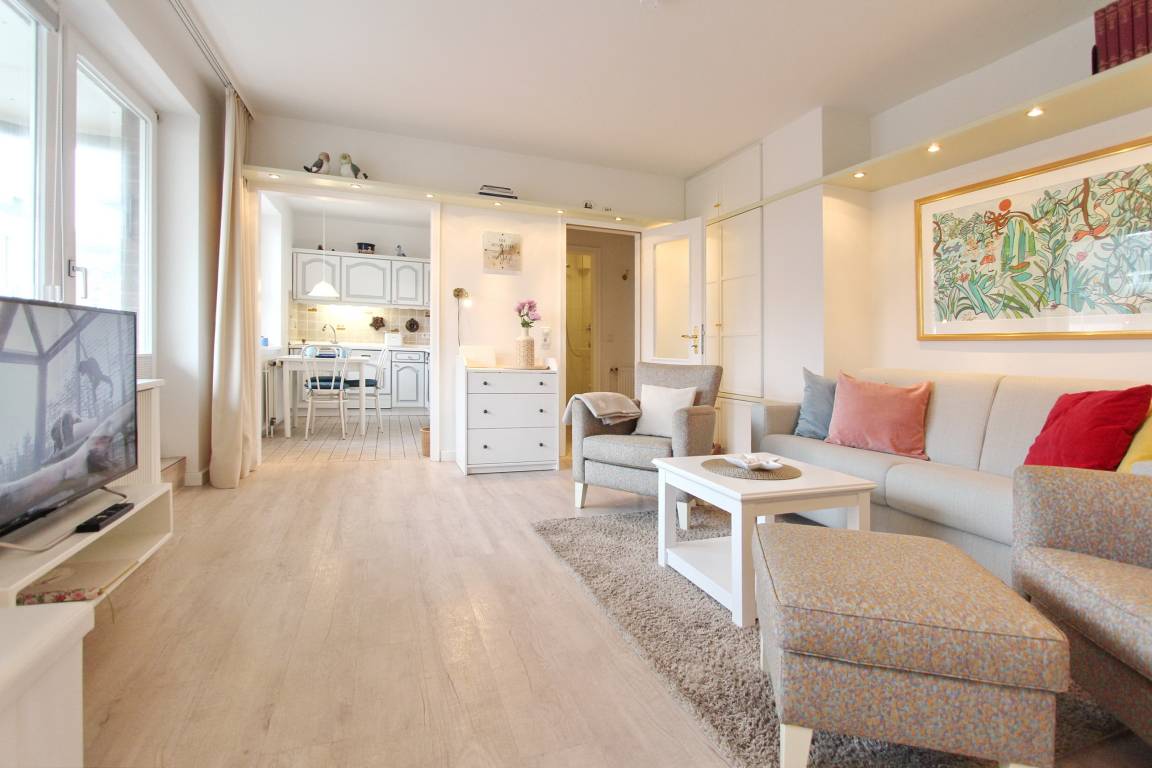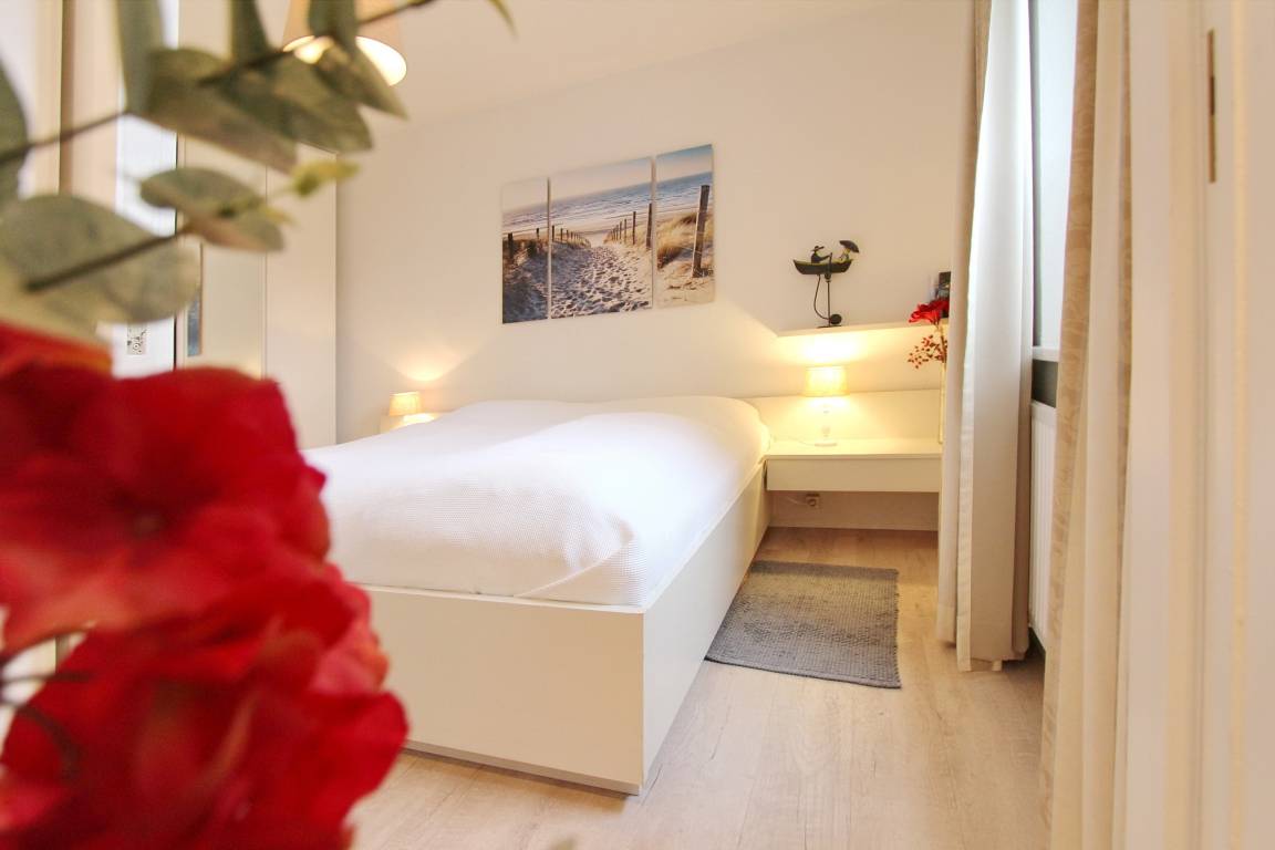Diese tolle Ferienwohnung für bis zu 3 Personen liegt im zentral und strandnah gelegenen Appartementhaus Margaretheneck in der 1. Etage. Auf dem großen Südbalkon können sie die Sonne genießen und das nahe Meeresrauschen hören. Im großzügigen und lichtdurchfluteten Wohnzimmer gibt es eine bequeme Couch (mit Schlaffunktion) und zwei Fernsehsessel, sowie Designfußboden in Holzoptik. Die kleine, separate Küche mit Fenster verfügt über einen Geschirrspüler, einen Backofen und einen Esstisch mit 3 Stühlen. Im Schlafzimmer, dass mit einer Schiebetür vom Wohnraum getrennt ist, gibt es ein feststehendes Doppelbett und Schränke mit reichlich Stauraum. Das moderne Badezimmer verfügt über eine ebenerdige Dusche. Zur technischen Ausstattung dieser Nichtraucherwohnung gehört WLAN, ein Smart TV und ein Radio. Das WLAN des Eigentümers können Sie kostenfrei nutzen. Die Zugangsdaten befinden sich in der Wohnung. Die Wohnung liegt auch in unmittelbarer strandnähe im Stadtzentrum. Von dort aus gelangen Sie wunderbar zu Fuß in zahlreiche Shoppingläden, Einkaufsläden, Restaurants und vielem mehr, um den Urlaub schön zu gestalten. Ein Pkw-Stellplatz (Garage Nr. 2) ist inklusive und steht Ihnen in der Tiefgarage mit Doppelparksystem zur Verfügung. Die ausgehängten Betriebsanleitungen für die Nutzung der Garagen sind Bestandteil des Mietvertrages (nicht für alle PKWs geeignet). Ein Fahrradstellplatz befindet sich am Haus und auch die Wasch -und Trockenautomaten im Keller können Sie nutzen.