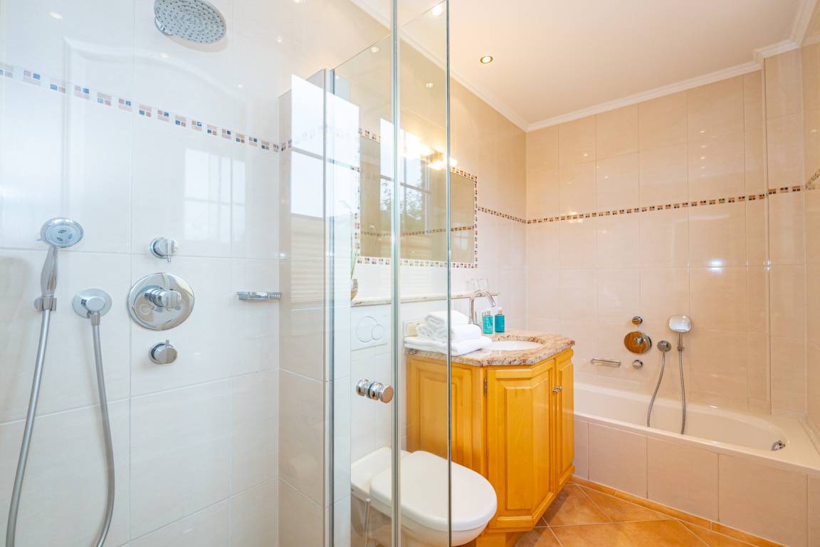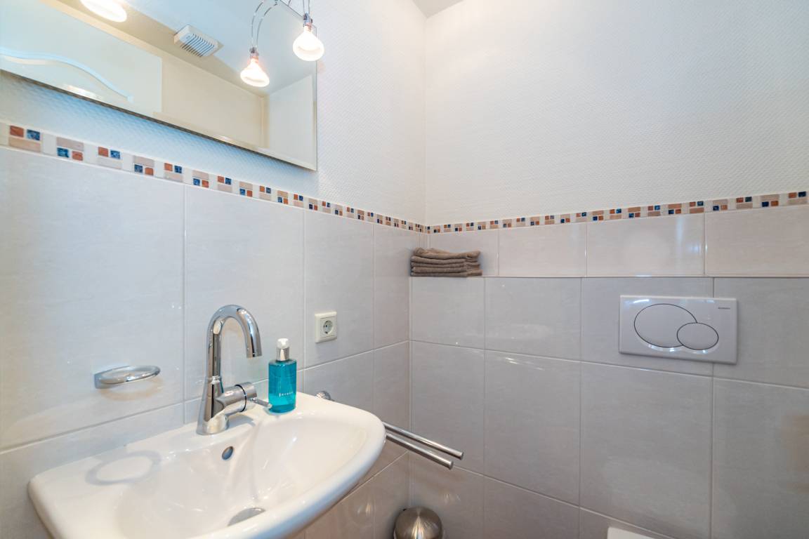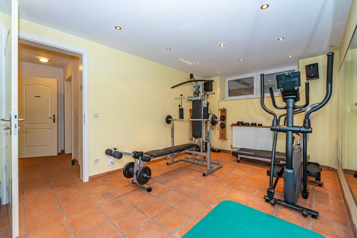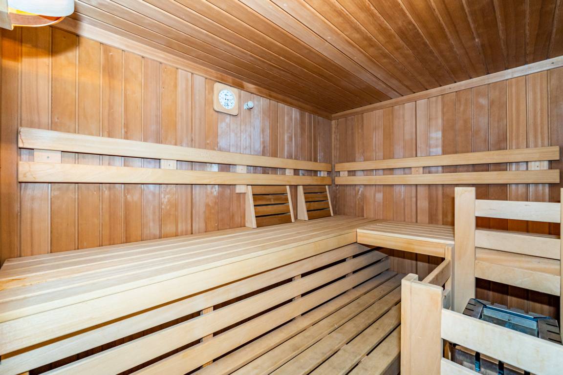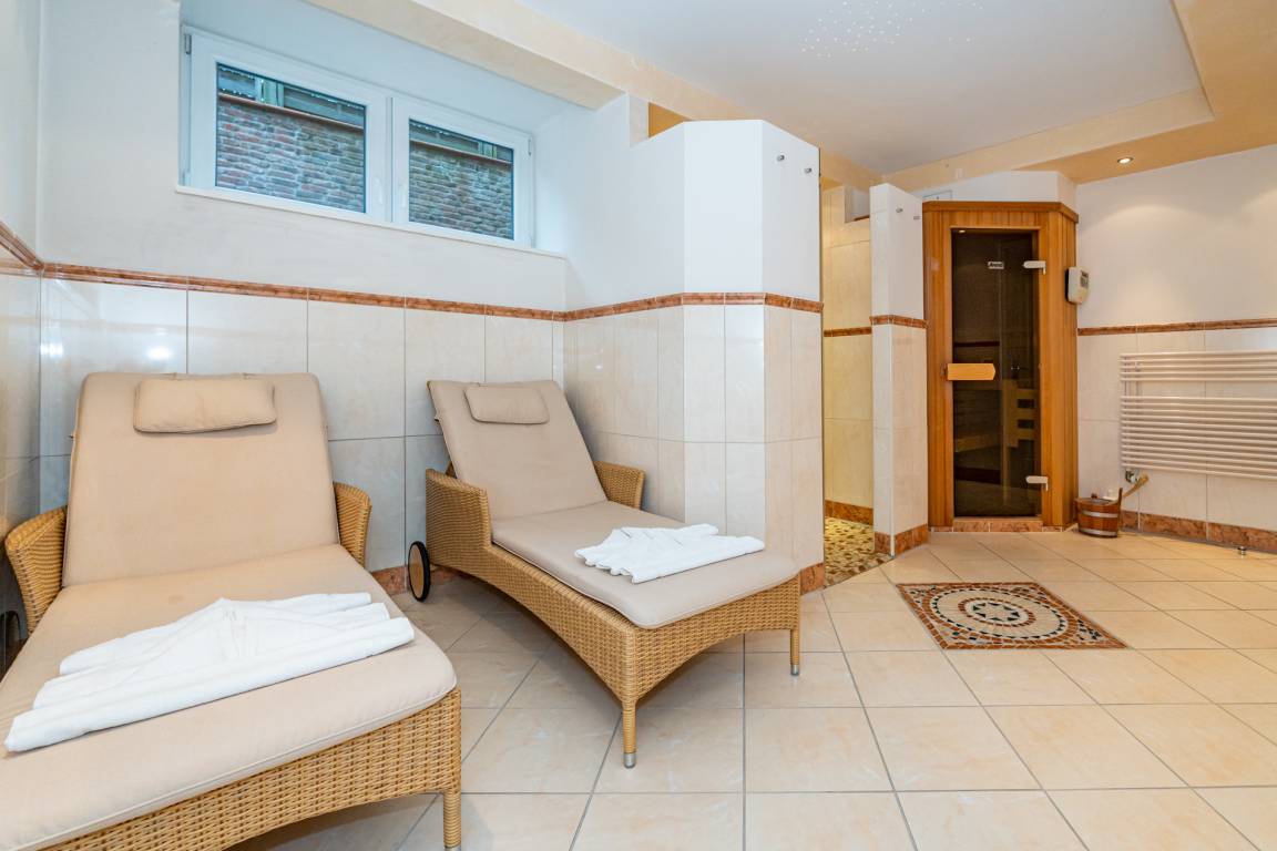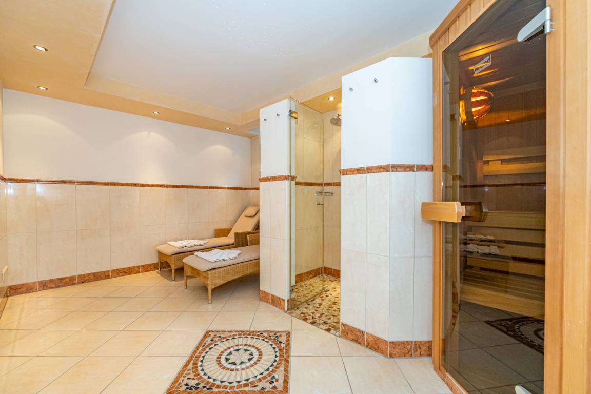 Der hauseigene Wellness- und Fitnessbereich steht Ihnen zur freien Nutzung zur Verfügung. Die Sauna ist mit zwei zusätzlichen Duschen und einem Ruhebereich mit zwei Liegen ausgestattet. Ein separates Gäste-WC befindet sich zwischen Saunabereich und Fitnessraum. Der Fitnessraum verfügt über moderne Geräte und einen Flachbild-TV. Für Ihren Komfort stehen Bademantel und Saunatuch zur Verfügung.