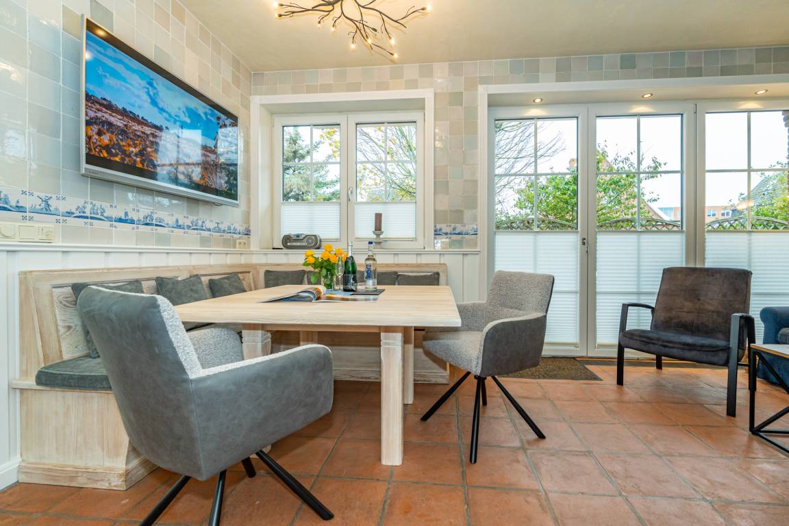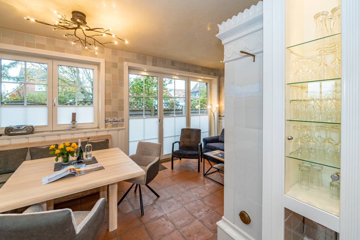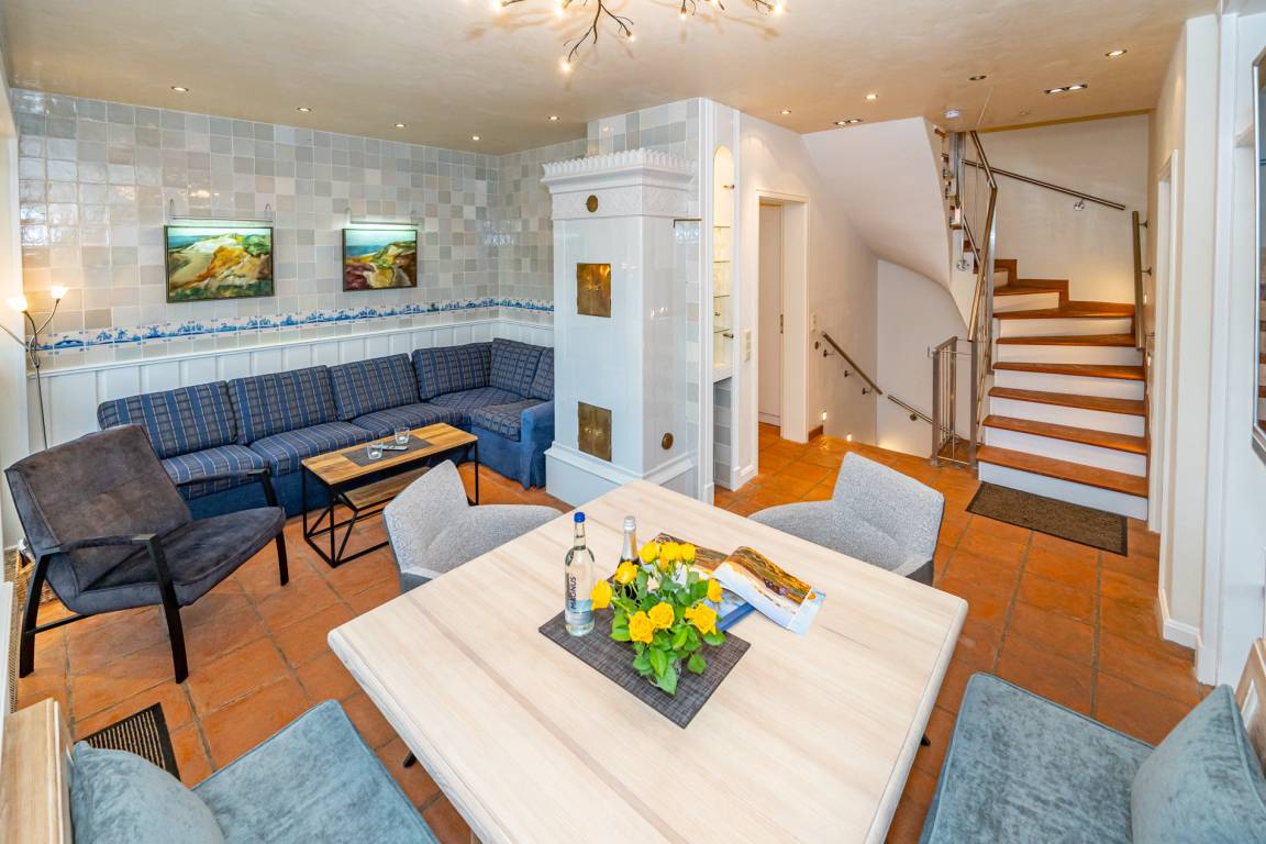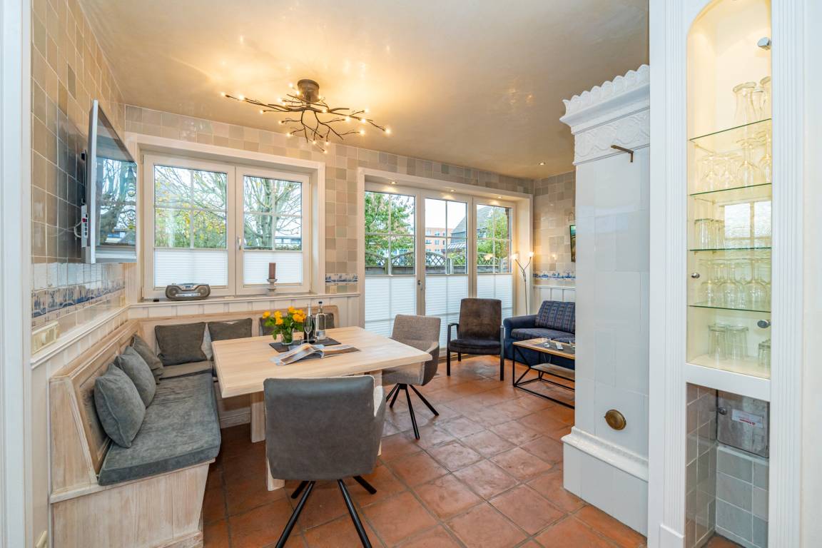 Ein einladender Vorflur mit Garderobe führt in den großzügigen Wohnbereich mit stilvoller Möblierung. Die hochwertige Eckgarnitur von Bielefelder Werkstätten sowie der große Esstisch mit gepolsterter Sitzbank schaffen eine gemütliche Atmosphäre. Der antike Kachelofen sorgt für besondere Behaglichkeit. Moderne Unterhaltungstechnik mit einem großen Flachbildfernseher sowie eine Telefon- und Internetflatrate (WLAN) ins deutsche Festnetz stehen zur Verfügung.