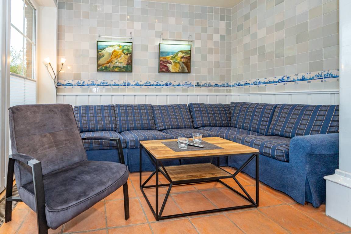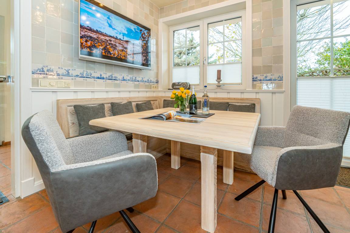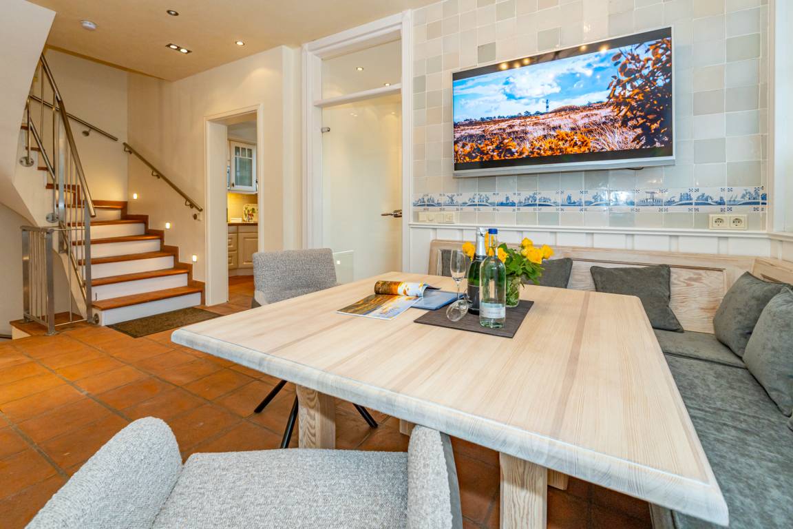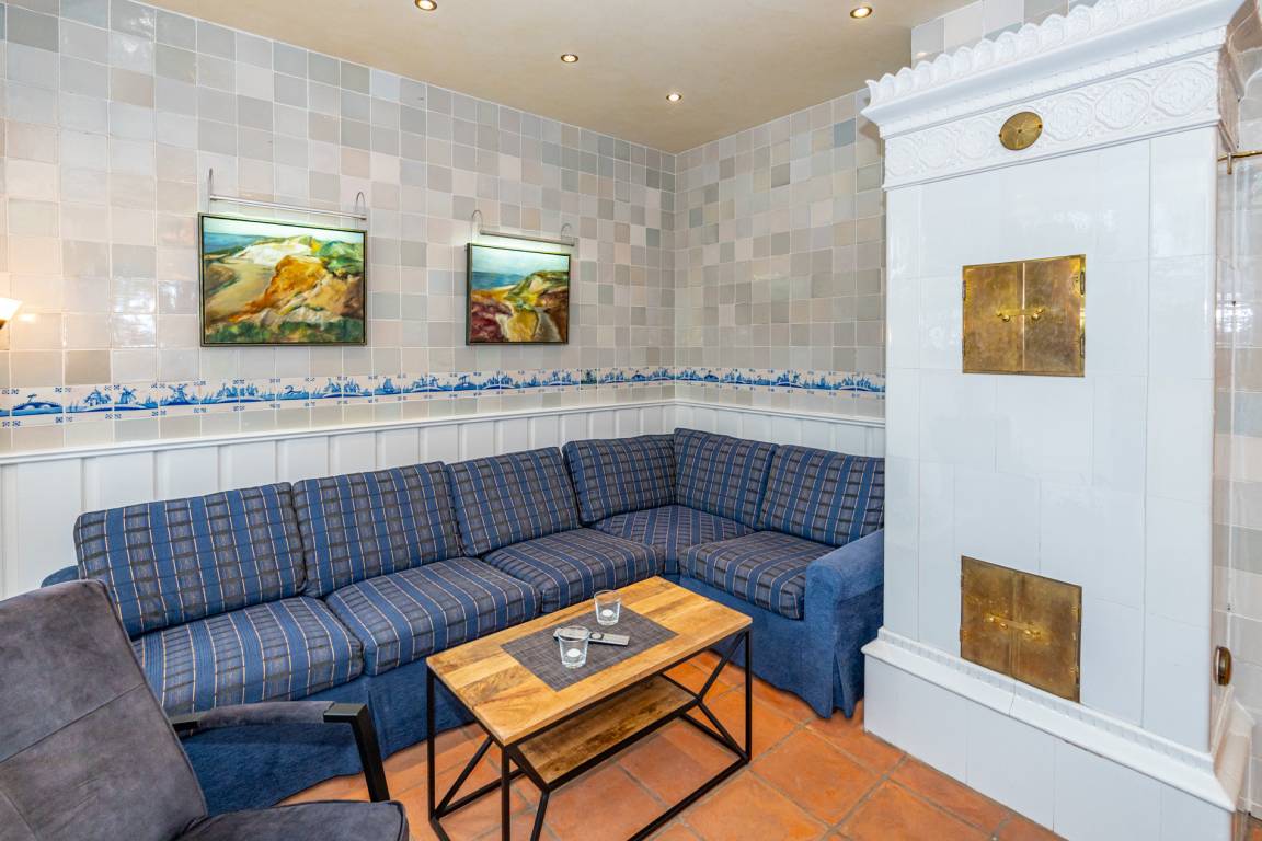 Ein einladender Vorflur mit Garderobe führt in den großzügigen Wohnbereich mit stilvoller Möblierung. Die hochwertige Eckgarnitur von Bielefelder Werkstätten sowie der große Esstisch mit gepolsterter Sitzbank schaffen eine gemütliche Atmosphäre. Der antike Kachelofen sorgt für besondere Behaglichkeit. Moderne Unterhaltungstechnik mit einem großen Flachbildfernseher sowie eine Telefon- und Internetflatrate (WLAN) ins deutsche Festnetz stehen zur Verfügung.