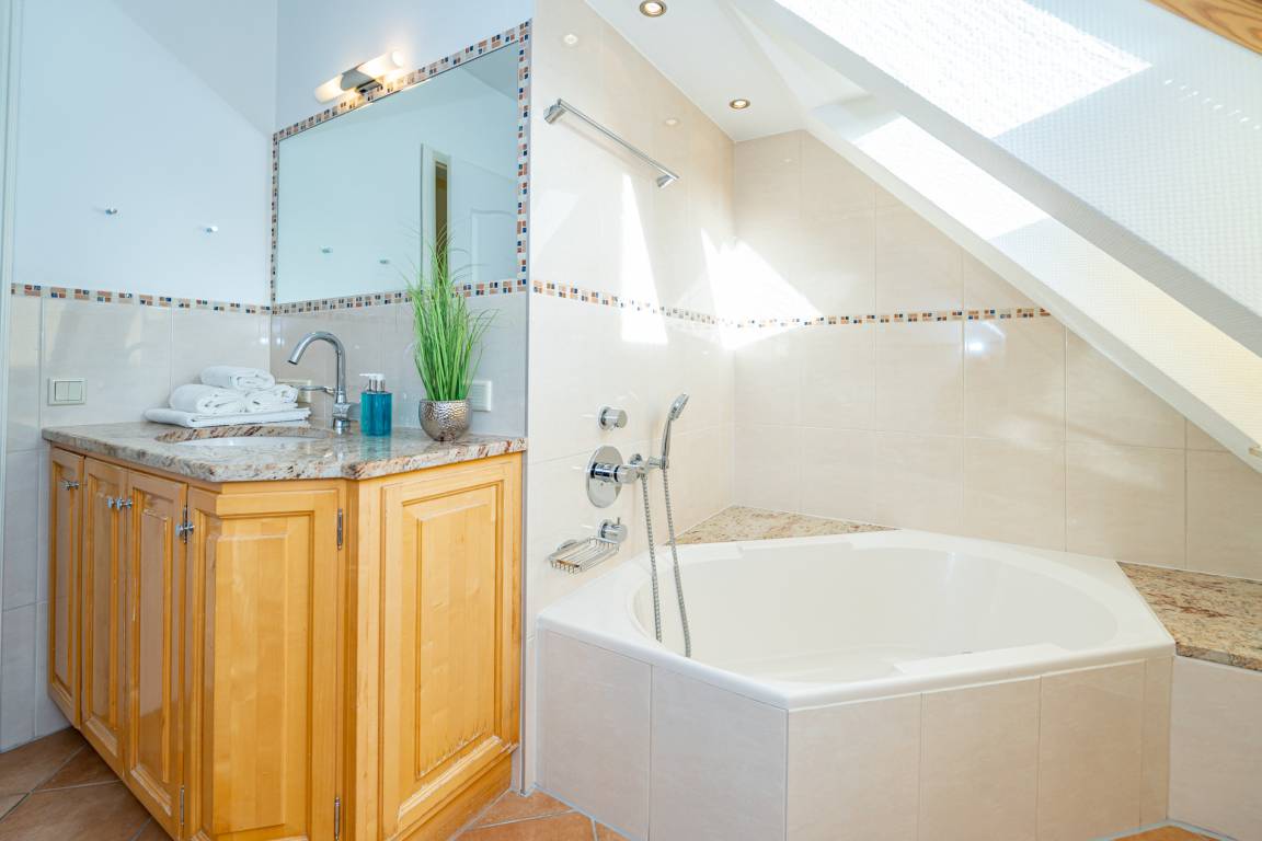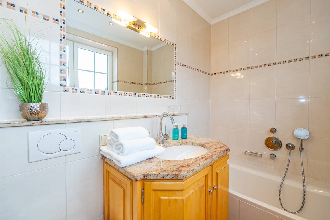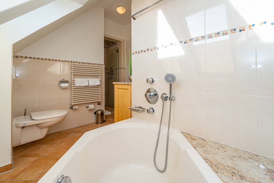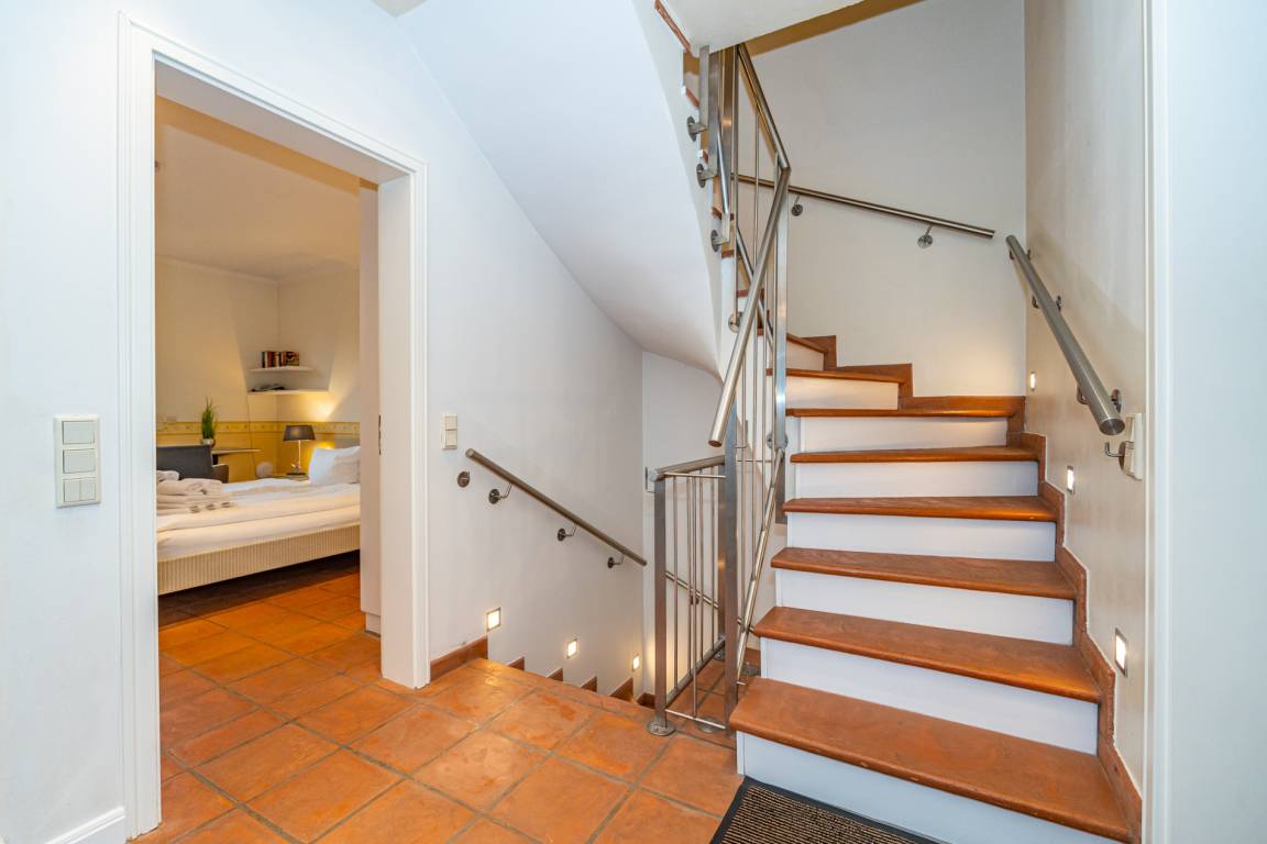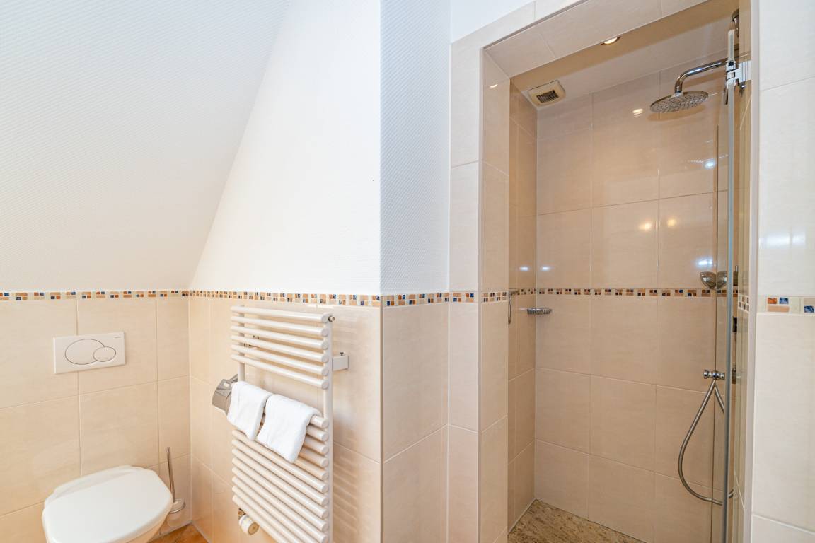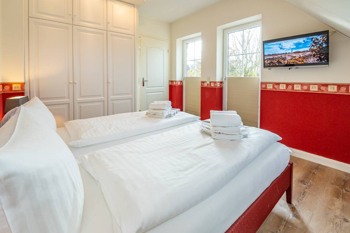 Das komplett mit modernem Designerboden in Holzoptik ausgestattete Obergeschoss umfasst drei weitere Schlafzimmer. Zwei geräumige Doppelzimmer verfügen jeweils über ein Doppelbett mit Einzelmatratzen (0,90 x 2,00 m) und einen eigenen Flachbild-TV. Das dritte Schlafzimmer ist mit einem Einzelbett (1,00 x 2,00 m) sowie einem zusätzlichen Kinderbett ausgestattet und verfügt ebenfalls über einen Flachbild-TV. Ein weiteres Badezimmer mit kombinierter Dusch-/Badewanne, Waschtisch, WC und integriertem Radio bietet zusätzlichen Komfort. Sämtliche gefliesten Räume sind mit Fußbodenheizung ausgestattet und sorgen für eine angenehme Wohnatmosphäre.