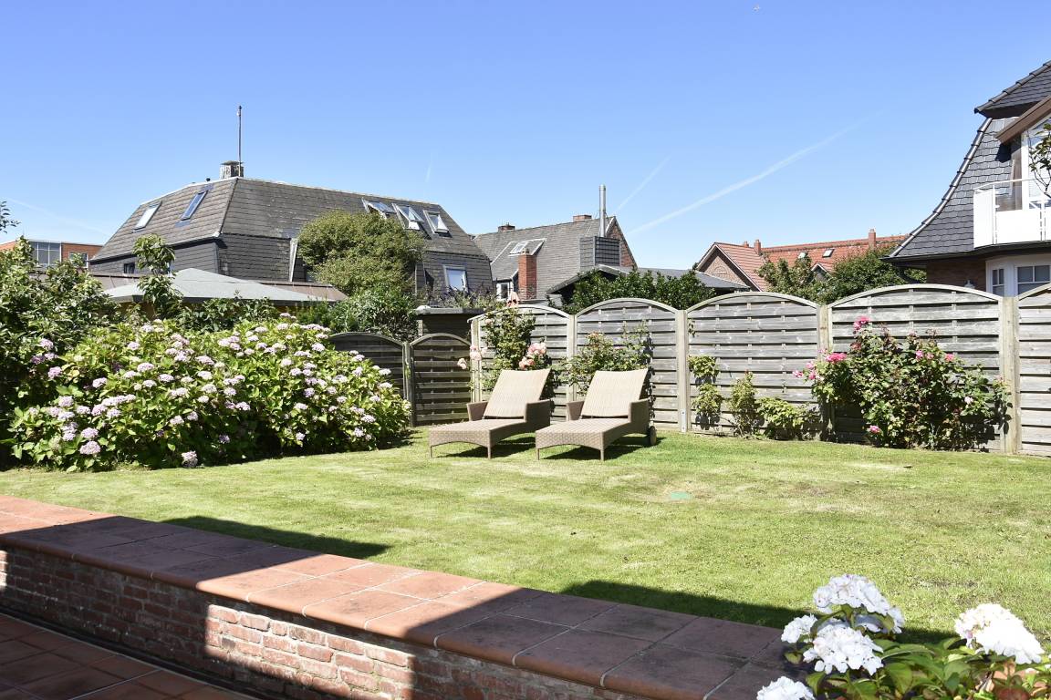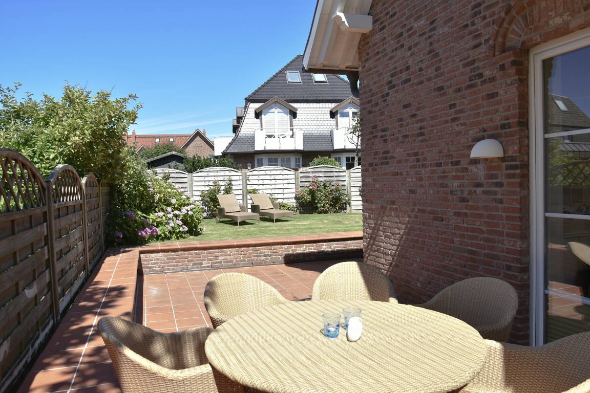 Großzügige Sonnenterrassen für entspannte Stunden. Das Haus verfügt über eine umlaufende Terrasse von Westen nach Norden, sowie eine zusätzliche kleine Süd-Terrasse mit einem weiteren Gartenteil mit einem Strandkorb.