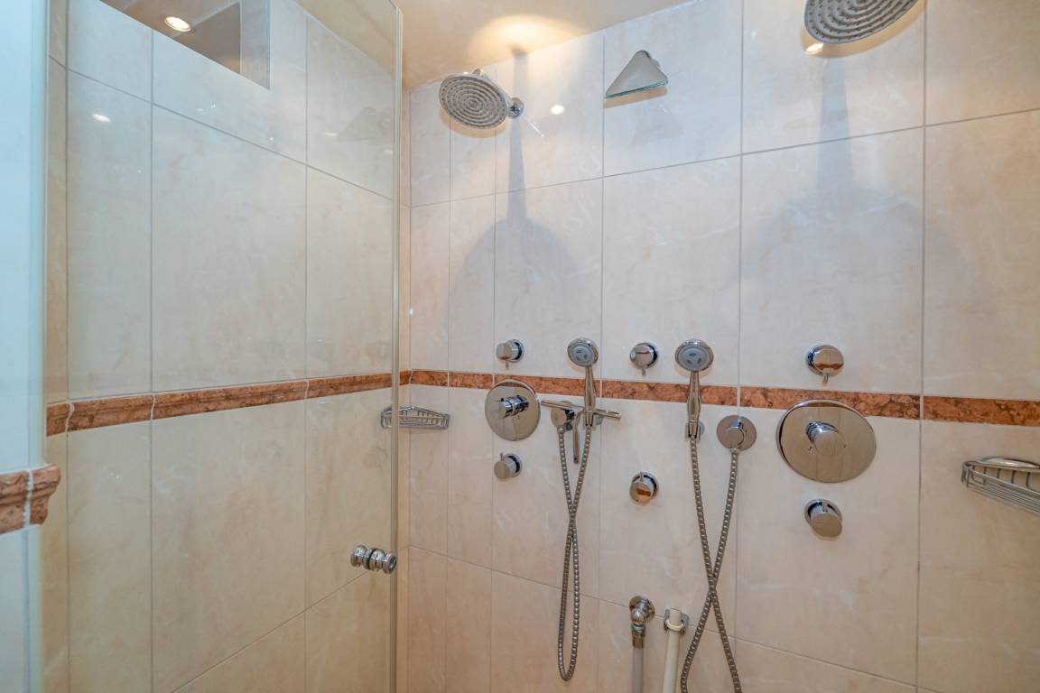 Die separate Komfortküche ist mit allen Annehmlichkeiten ausgestattet. Sie verfügt über einen Geschirrspüler, eine Mikrowelle, einen amerikanischen Kühlschrank mit Tiefkühlfach, ein 4-Platten-Cerankochfeld, einen Backofen sowie eine Nespresso-Maschine. Eine Filter-Kaffeemaschine, ein Wasserkocher, ein Toaster und ein Eierkocher ergänzen die Küchenausstattung.