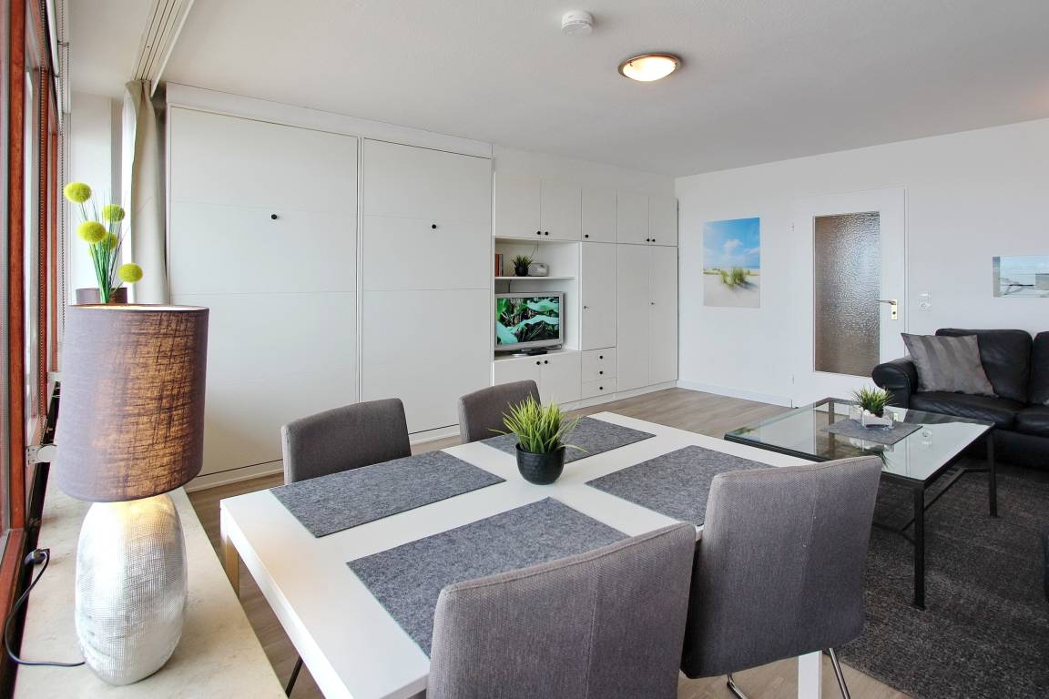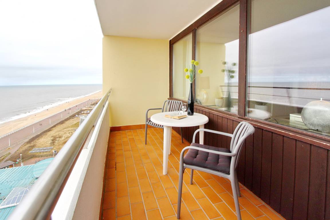 In der 10. Etage des Haus Metropol finden sie diese Einzimmerwohnung mit tollem Blick auf das Meer und den Strand. Der kombinierte Wohn-/Schlafraum mit vorgelagertem Westbalkon (Balkonmöbel vorhanden) ist ausgestattet mit Einzelschrankbetten, einem Essplatz mit 4 Stühlen am Fenster und 2 Ledercouchen. Das Badezimmer hat eine Dusche mit flachem Einstieg und Duschvorhang und 2 Waschbecken. In der separaten Küche mit Backofen und Ceranfeld können sie sich selbst verpflegen. Zur technischen Ausstattung gehört: ein Flachbildfernseher und ein Radio und freies WLAN (WEG Haus Metropol - Passwortfrei - ohne Gewähr) steht ihnen kostenfrei zur Verfügung. Wohnungsgröße: ca. 42 m². Nichtraucherwohnung.