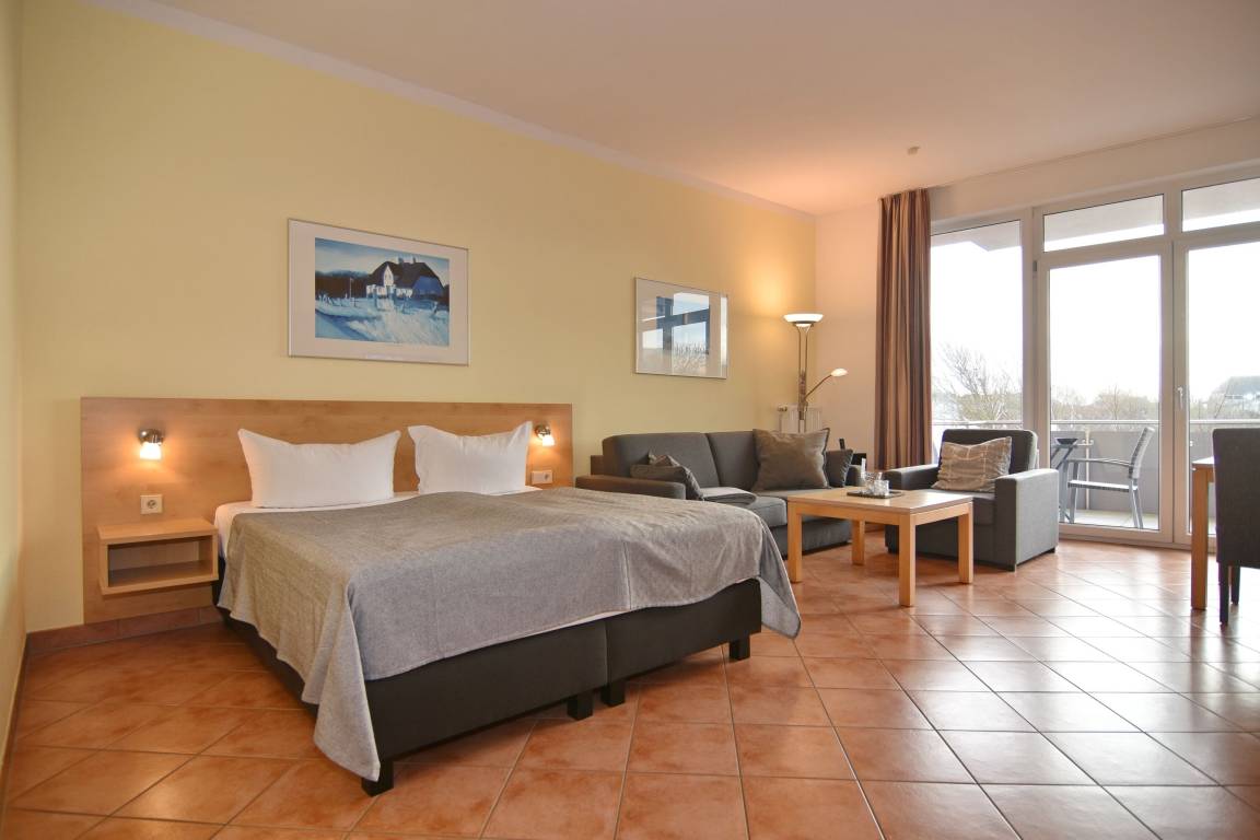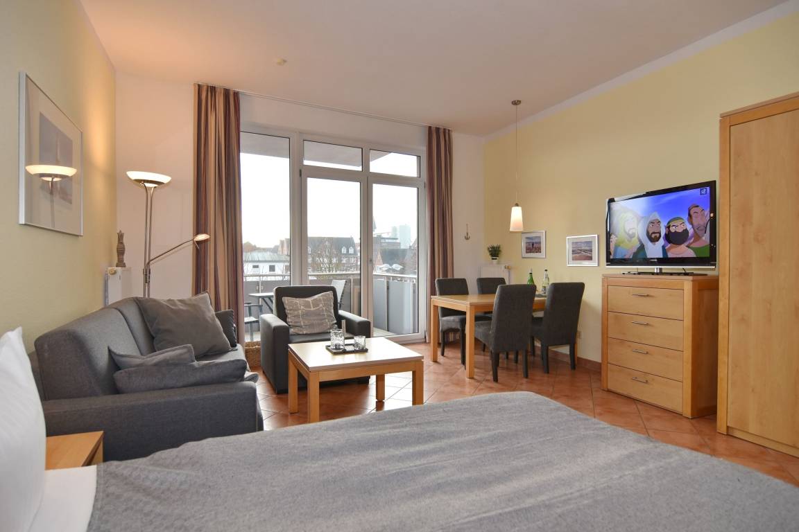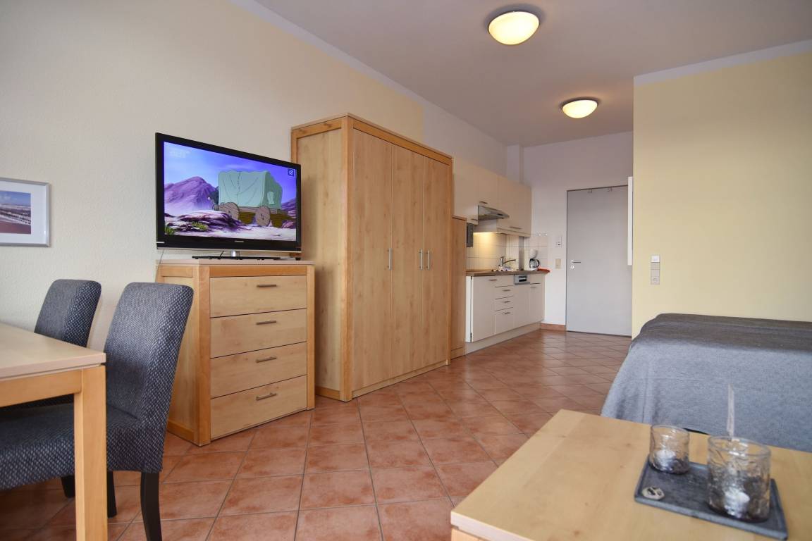 Gepflegte 1-Zimmer-Ferienwohnung im roten Haus, Nichtraucher-Whg., ca. 34m², 1. OG. Wohn-/Schlafraum mit Südbalkon, Doppelbett, Essplatz, 2-Sitzer-Couch und Sessel, Flat-TV, Küchenzeile mit Geschirrspüler und Mikrowelle, Duschbad/WC. Das Apartment ist komplett gefliest. Internetanschluß (ohne Gewähr). Waschküche und Fahrradkeller im Nebenhaus "Mauritius". Pkw-Stellplatz kann kostenpflichtig hinzugebucht werden. Bettwäsche und Handtücher sind zur Anreise aufgezogen!
