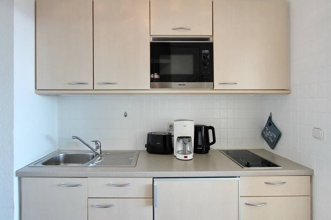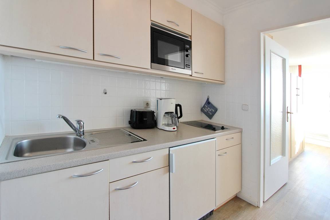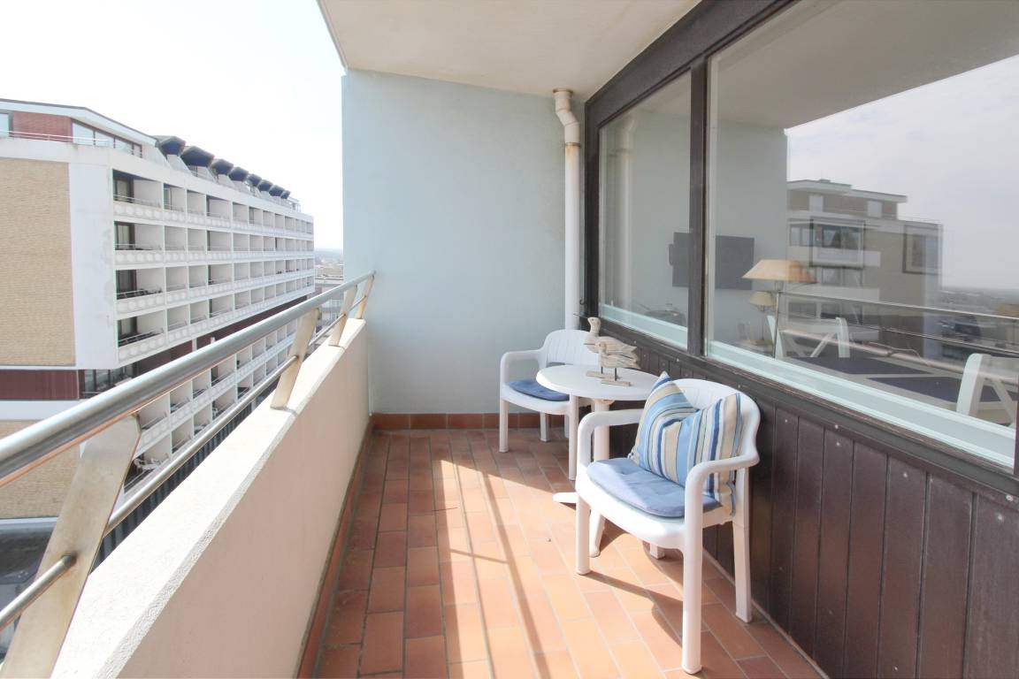 Einzimmerwohnung in der 6. Etage im Haus Metropol mit einem schönen Blick über die Insel und bei gutem Wetter bis zum Wattenmeer. Die Wohnung hat einen Ostbalkon mit Balkonmöbeln auf dem sie jeden Morgen die Sonne gegrüßt. Im Wohn-Schlafraum gibt es Einzelschrankbetten, einen Essplatz am Fenster mit 2 Stühlen sowie eine Couch. Es wurde Designfussboden in Holzoptik verlegt und die Fenster sind mit Verdunklungsrollos ausgestattet. Das Badezimmer hat eine Badewanne, einen Fön, einen Kosmetikspiegel und ausreichend Abstellfläche für Ihre persönlichen Dinge. Die Küchenzeile im Flur verfügt über 2 Ceranfeldkochplatten und eine Mikrowelle. Zur technischen Ausstattung dieser Nichtraucherwohnung gehört ein Flachbildfernseher und ein CD-Radio. Ein freies WLAN Netzwerk (WEG Haus Metropol - Passwortfrei - ohne Gewähr) steht ihnen kostenfrei zur Verfügung. Wohnungsgröße: ca. 30 m².