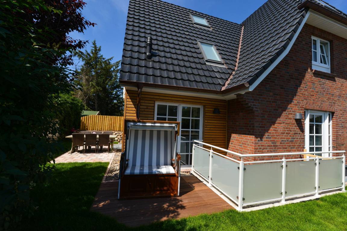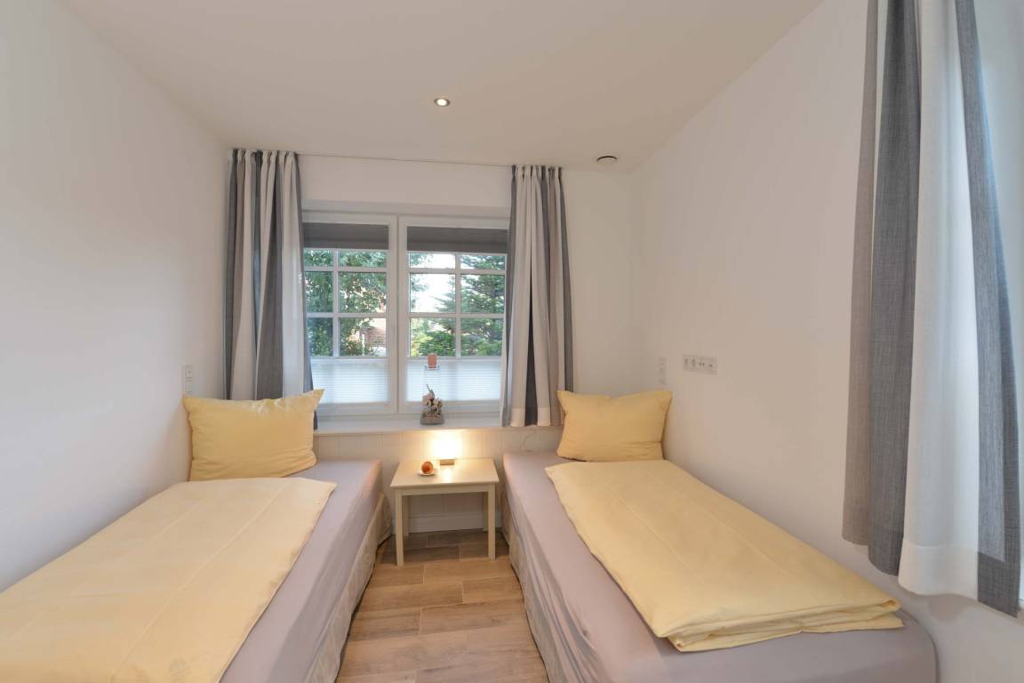 Im Untergeschoss befindet sich ein weiterer großer Schlafraum mit Boxspringbetten der Größe 200x200, maßgefertigten Einbauschränken, einem Fernseher und bodentiefen Fensterelementen. Außerdem gibt es ein drittes Schlafzimmer mit Boxspringbetten der Größe 180x200, einem maßgefertigten Einbauschrank und einem Fernseher. Der hauseigene Wellnessbereich mit einer Regendusche, einer Badewanne, einem extrabreiten Waschtisch, einem Radio, einer Toilette und einer Sauna trägt zur Entspannung im Urlaub bei.