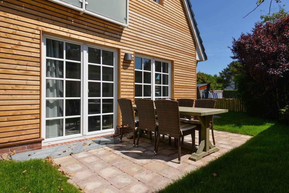 Im Erdgeschoss befindet sich eine Wohnküche, die mit hochwertiger Küchentechnik von Miele ausgestattet ist. Von hier aus gelangt man auch in den hellen Wohnbereich, der mit einem elektronischen Kamin ausgestattet ist, sowie zur Südterrasse. Ein erstes Schlafzimmer mit Morgensonne bietet zwei Boxspringbetten, die je nach Bedarf als Einzel- oder Doppelbett genutzt werden können. Zudem gibt es hier maßgefertigte Einbauschränke und einen Fernseher. Ein Duschbad komplettiert das Erdgeschoss.