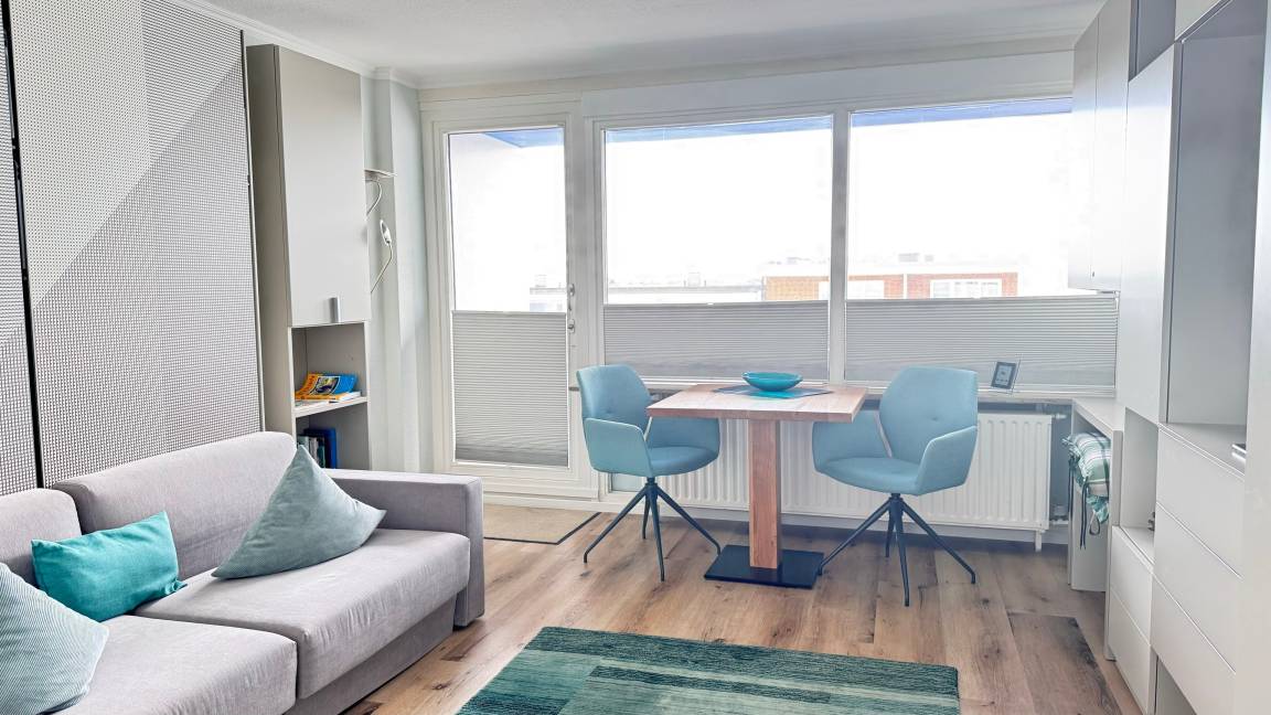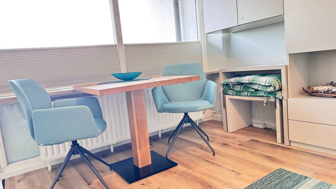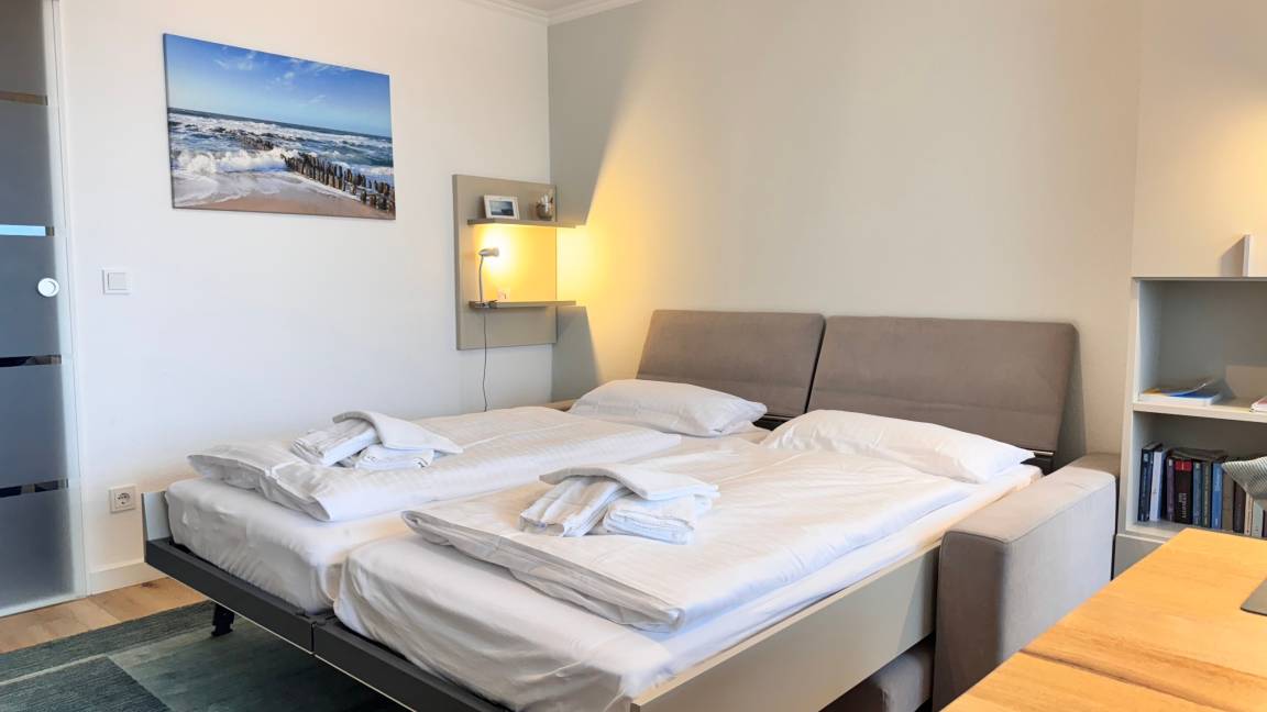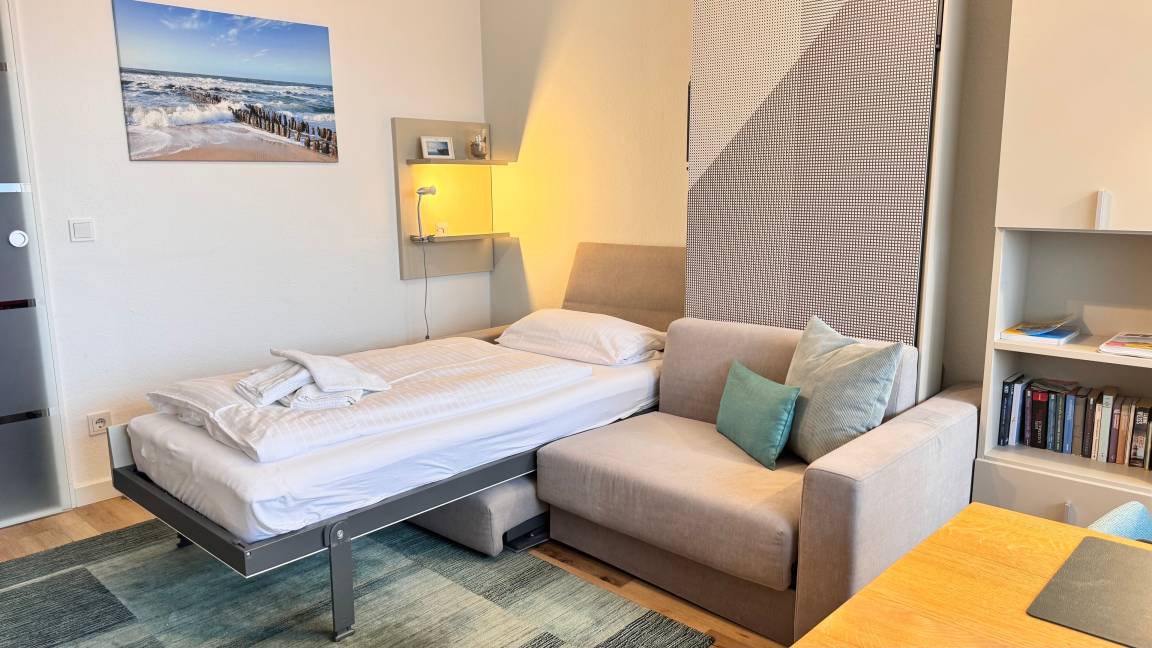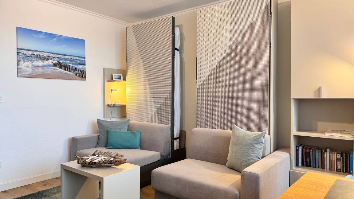 Der Wohn- und Schlafraum ist mit einem Vinyl-Boden in holzoptik ausgelegt. Ein großer Einbauschrank, mit viel Stauraum, ein Flachbild-TV und ein Esstisch mit zwei Stühlen sind vorhanden. Das 'versteckte' Schrankbett hinter der Couch lässt sich einzeln (90 x 2,00 m) ausklappen. Im Haus befindet sich ein öffentliches WLAN (ohne Gewähr).