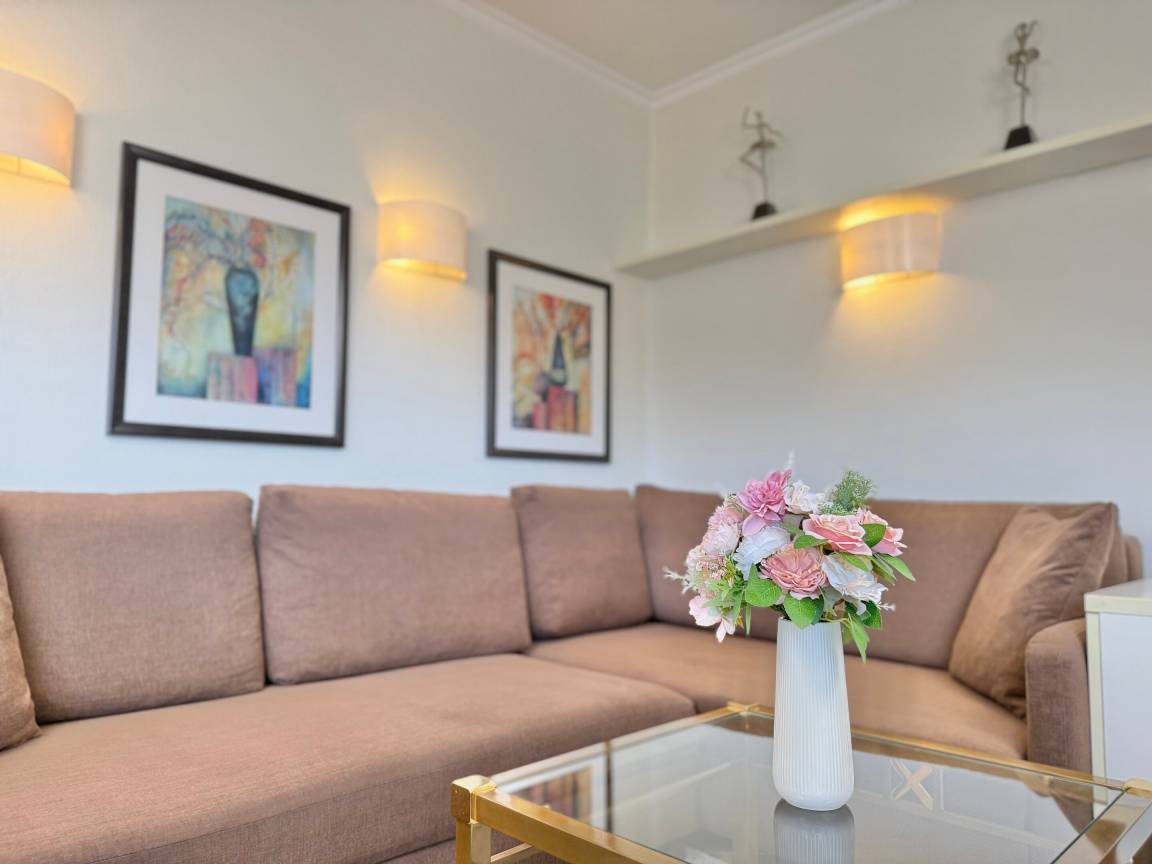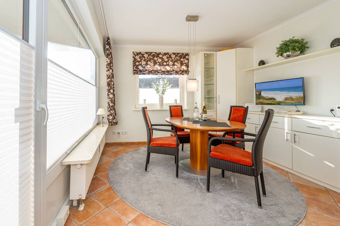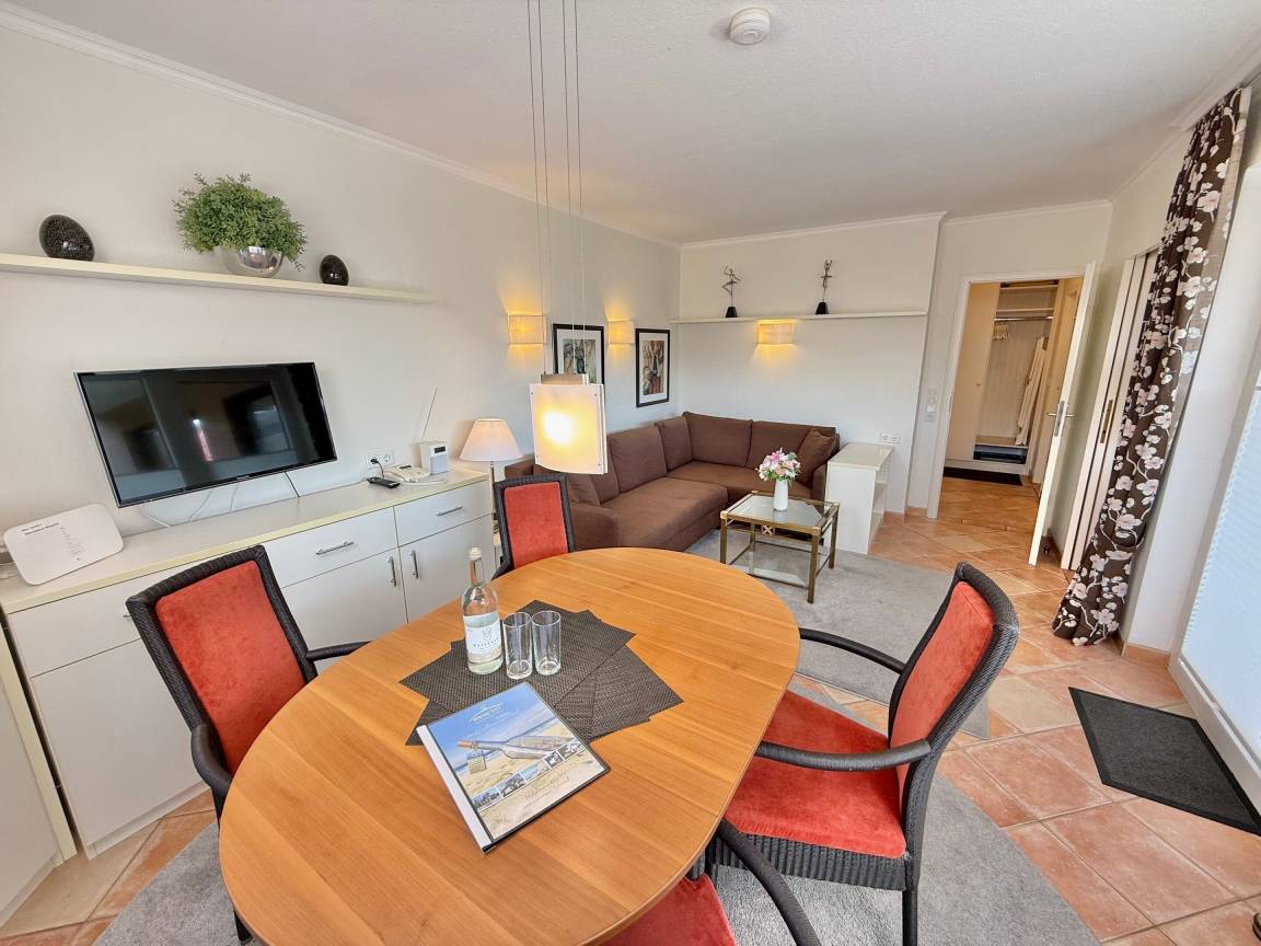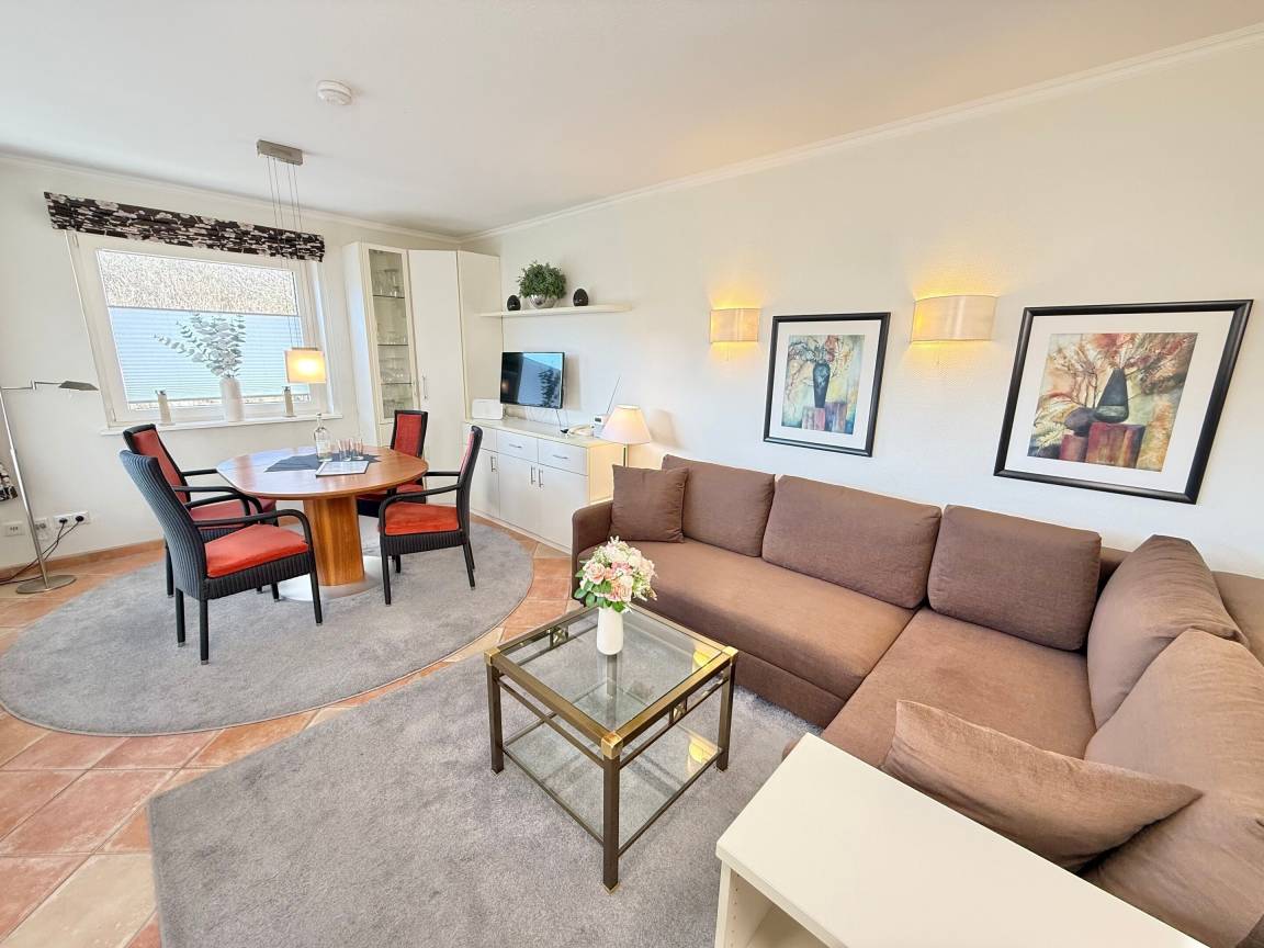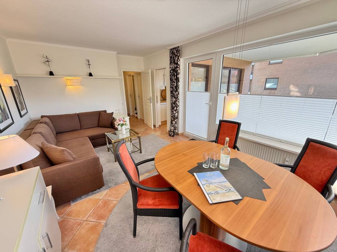 Beim Betreten der Wohnung gelangen Sie über einen einladenden Vorflur in das lichtdurchflutete Wohnzimmer, die separate Küche, das Schlafzimmer sowie das moderne Duschbad/WC. Das stilvolle Wohnzimmer verfügt über eine gemütliche Eckcouch mit Schlaffunktion (Liegefläche. 160x 200 cm), einen Essplatz am Fenster sowie moderne Unterhaltungstechnik mit Kabel-Flachbild-TV, Telefon und WLAN (ohne Gewähr). Vom Wohnbereich haben Sie direkten Zugang zum großzügigen Süd-West-Balkon, der in der Nachmittagssonne mit gemütlichen Sitzmöglichkeiten zum Verweilen einlädt.
