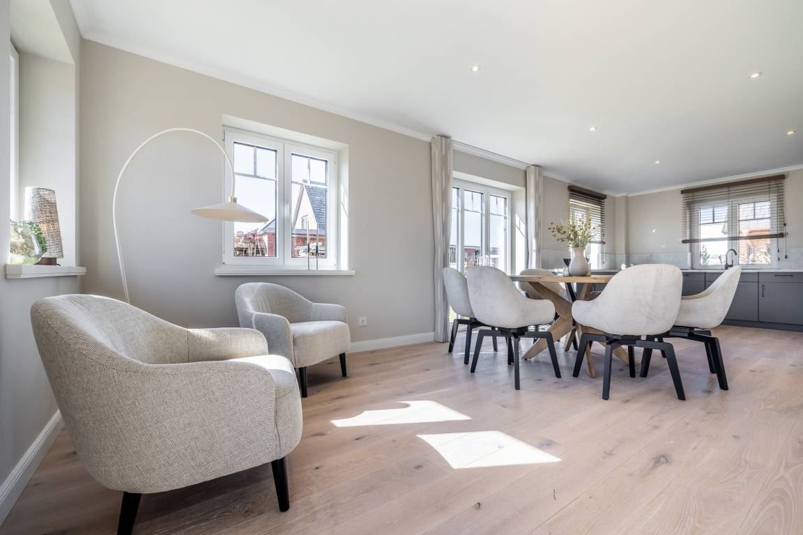 Das Ferienhaus "Zur Eiche 38c" in Tinnum bietet auf 163 m² Platz für bis zu 8 Personen. Es verfügt über 4 Schlafzimmer und 3 Badezimmer und bietet Privatsphäre und Komfort für Groß und Klein. Die Lage des Hauses ist ideal für einen abwechslungsreichen Urlaub auf Sylt. Der nächste Strand ist nur ca. 2,9 km entfernt und bequem mit dem Fahrrad oder dem Auto zu erreichen. Bäcker sowie weitere Einkaufsmöglichkeiten und Restaurants befinden sich in der näheren Umgebung und in die Tinnumer Wiesen sind es nur 200 m.