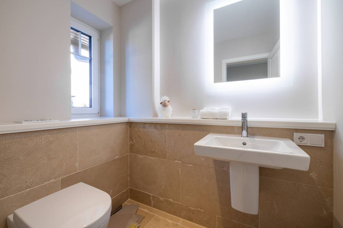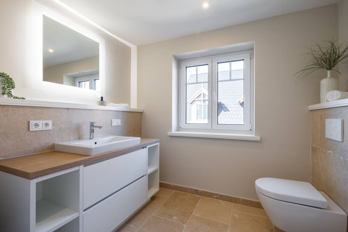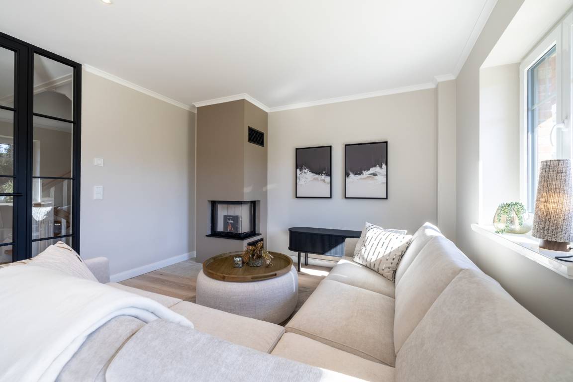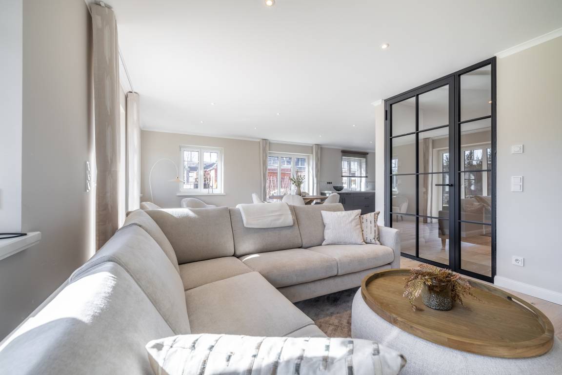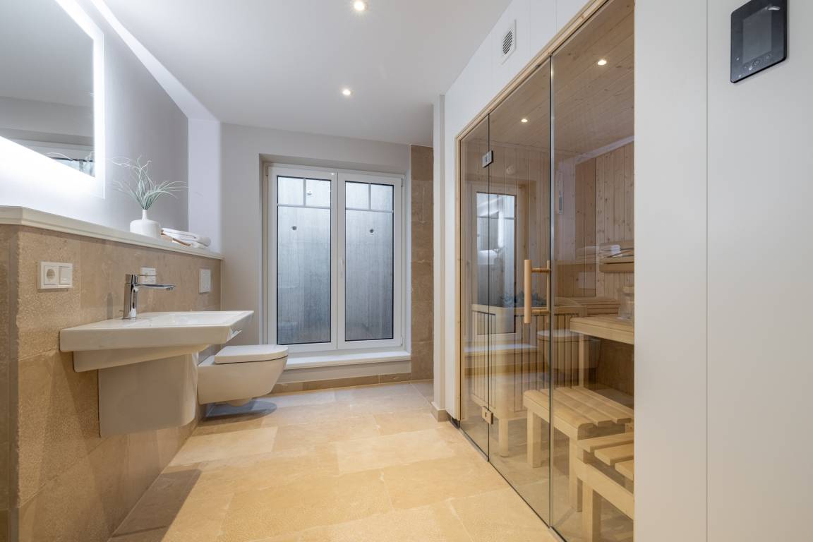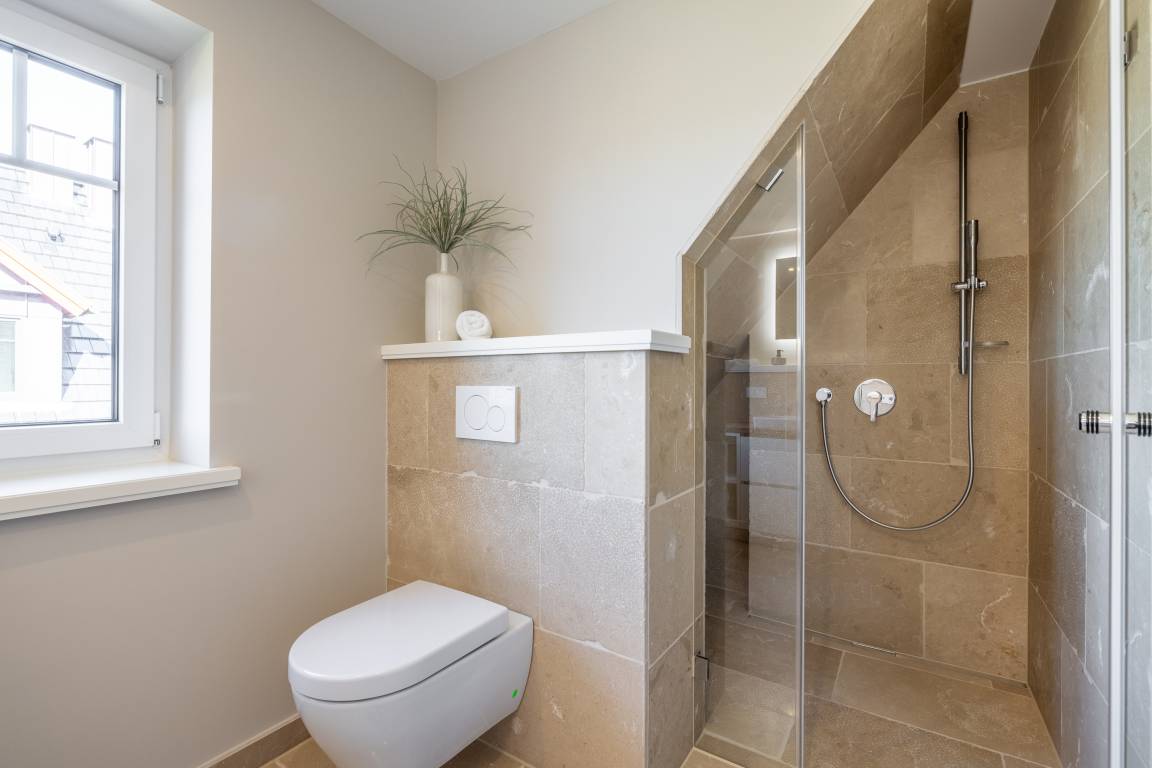 Das Wohn- und Esszimmer ist großzügig geschnitten, freundlich ausgestattet und sehr sonnig. Neben der gemütlichen Couchecke befinden sich hier der große Esstisch sowie die offene Küche, die alles bietet, was das Herz begehrt. Im Obergeschoss stehen Ihnen 2 große Schlafzimmer mit schönen Einbauschränken und jeweils eigenem Smart-TV sowie 2 Duschbäder mit WC zur Verfügung. Im Dachgeschoss liegt ein weiteres, gemütliches Schlafzimmer mit 2 Einzelbettten. Im Untergeschoss wird Sie das schöne Saunabad/WC nebst Ruheraum begeistern. Hier befinden sich zudem ein weiteres Schlafzimmer mit Doppelbett, Einbauschränken und TV sowie der Hausanschlussraum mit Waschtrockner.