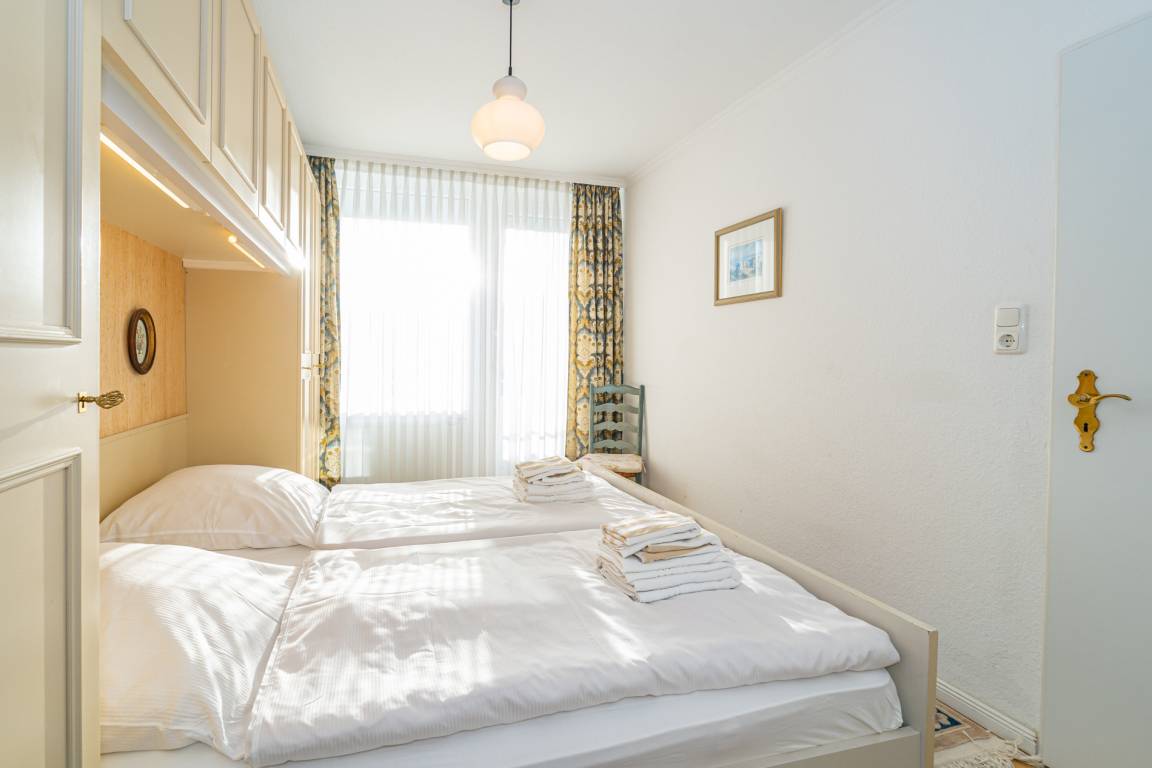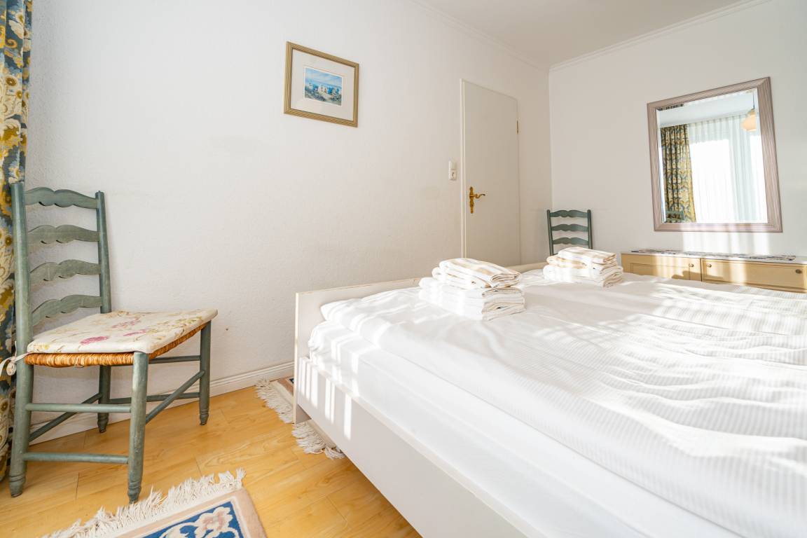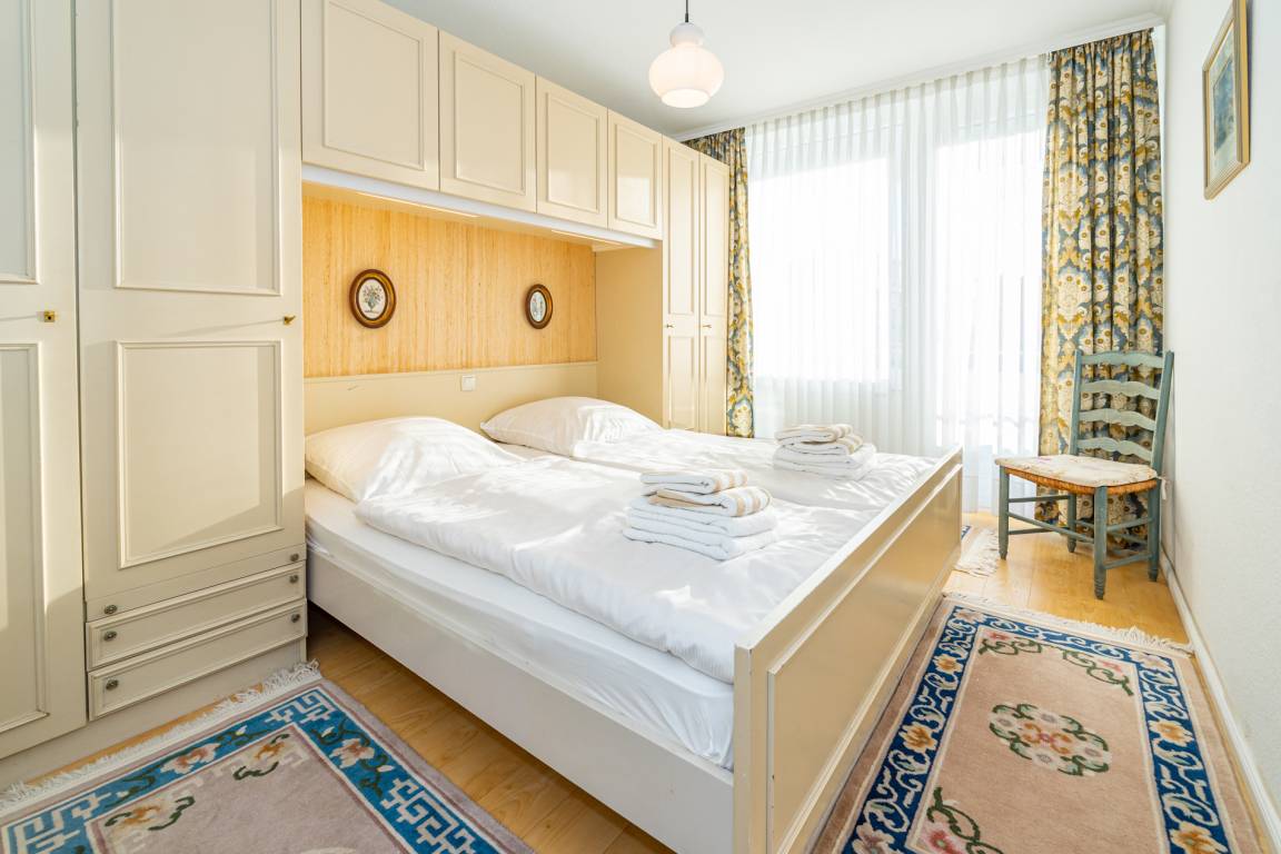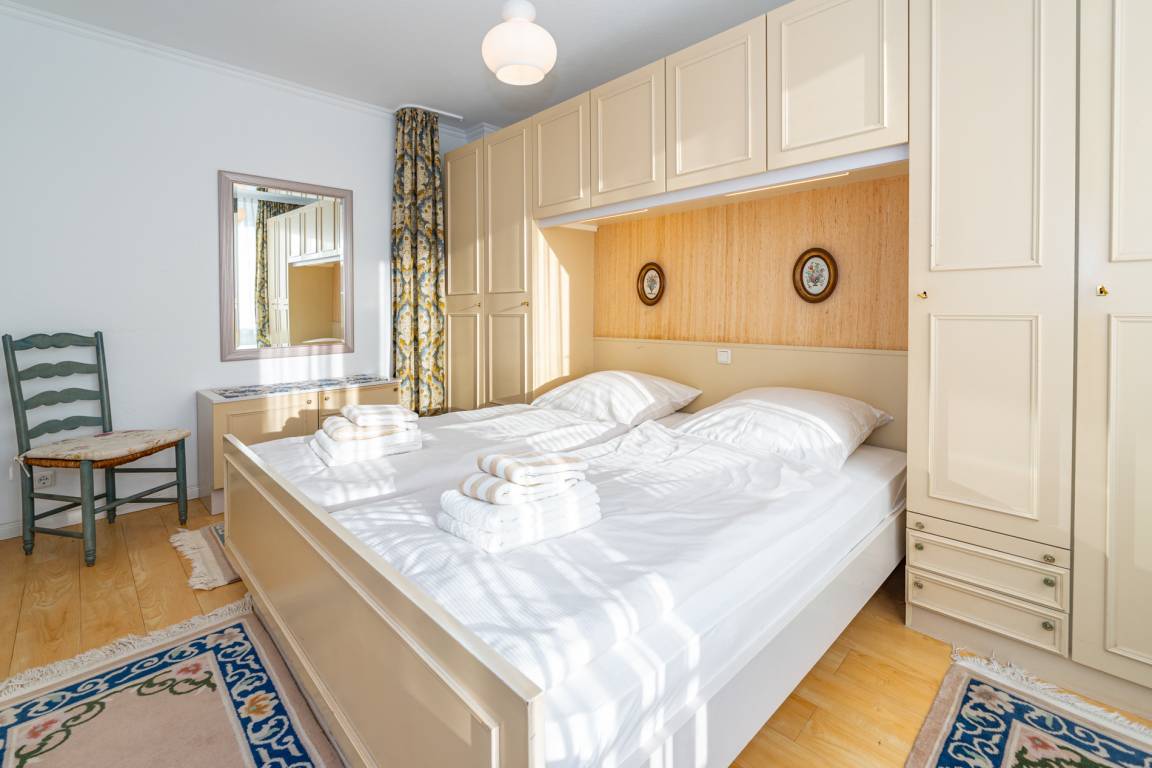 Im Schlafzimmer befindet sich ein Doppelbett. Hier hat man einen Zutritt zum zweiten, kleinen Süd-Balkon.