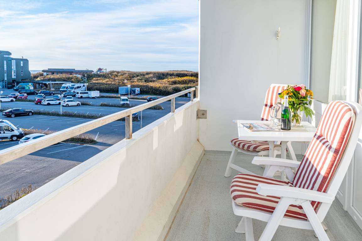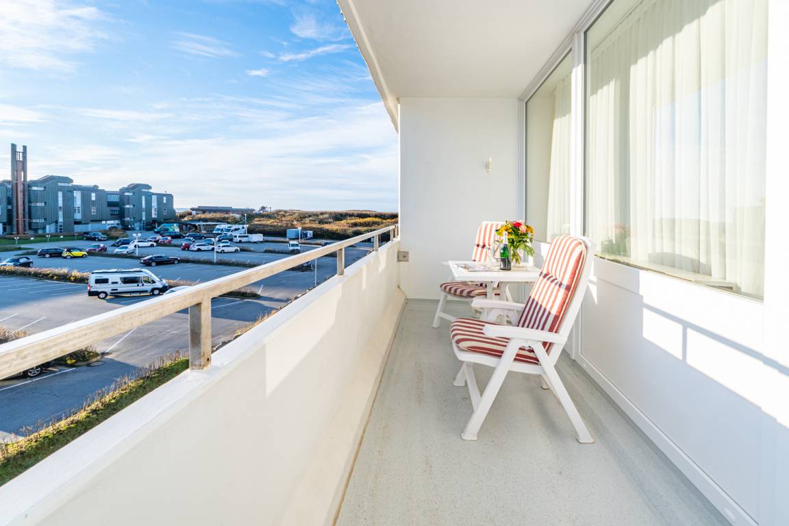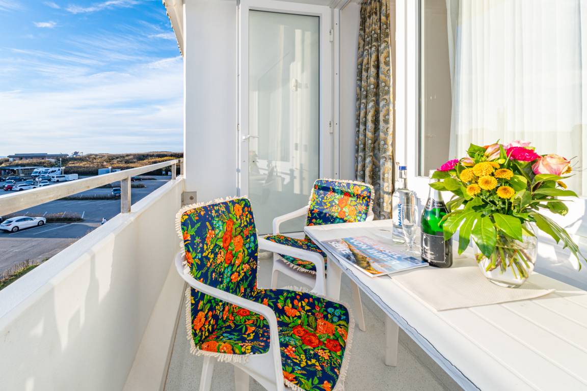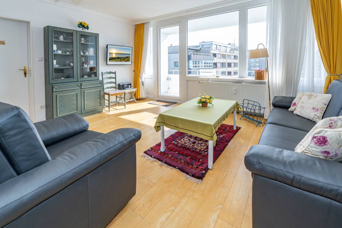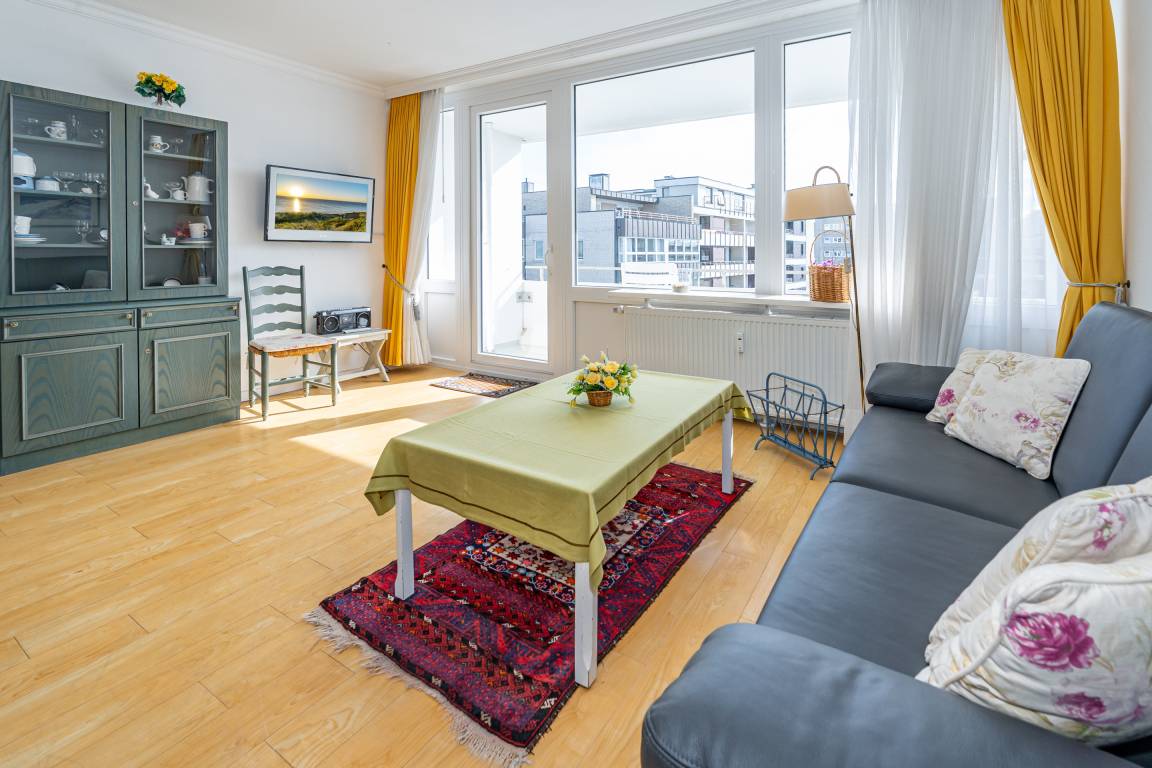 2-Zimmer-Nichtraucher-Ferienwohnung, ca. 66 m², in der 3. Etage für bis zu 4 Personen, mit Süd-Balkon mit "kleinem Meeresblick" vom Wohn- und Schlafzimmer aus.