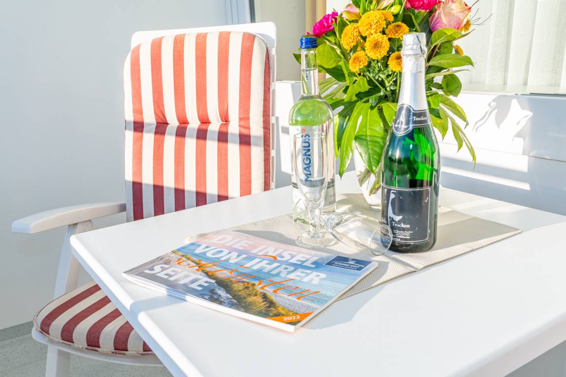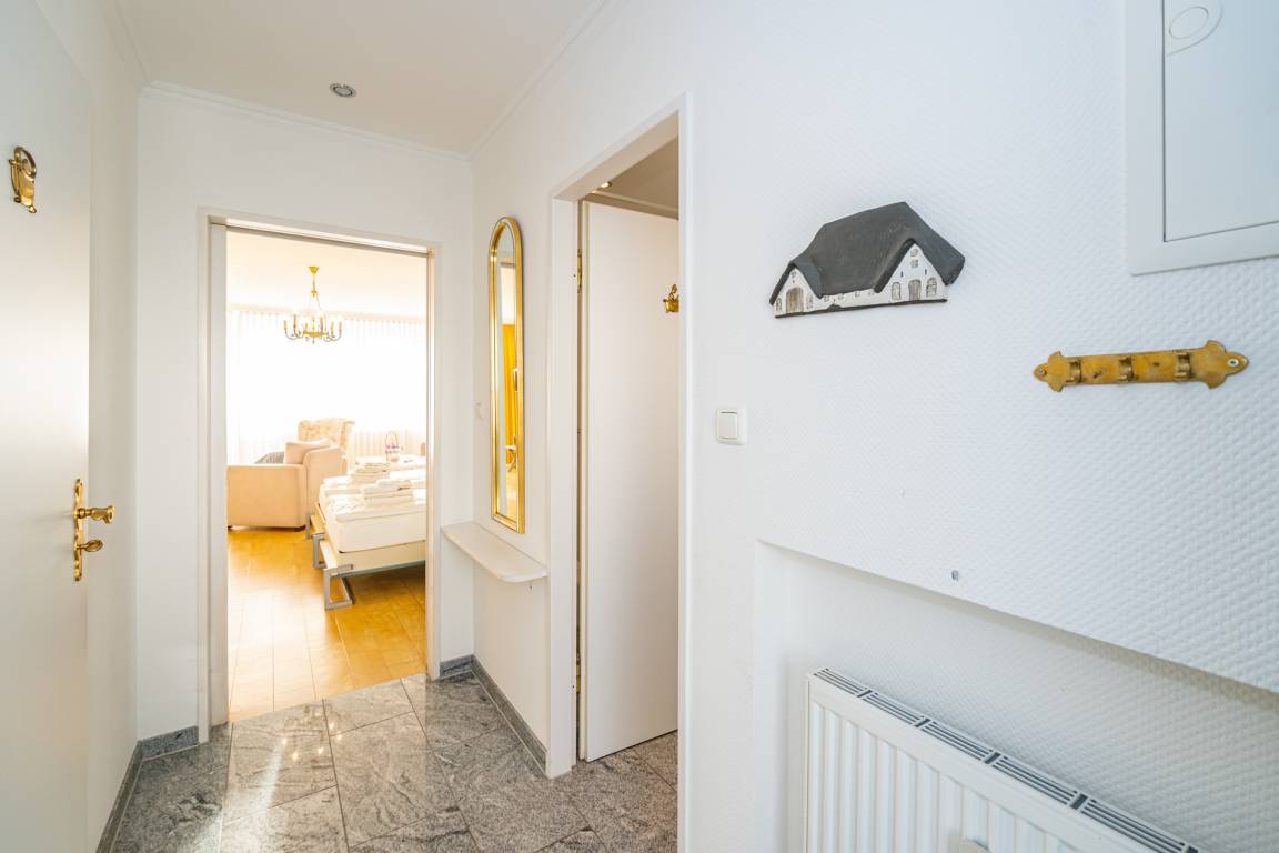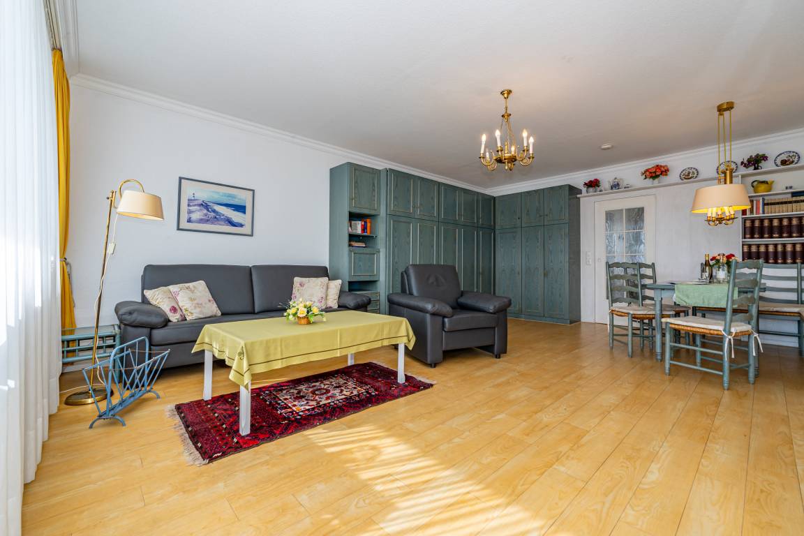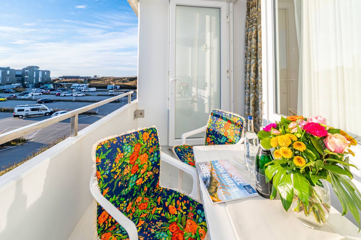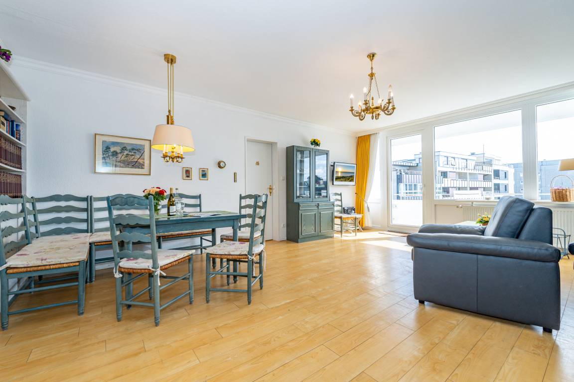 2-Zimmer-Nichtraucher-Ferienwohnung, ca. 66 m², in der 3. Etage für bis zu 4 Personen, mit Süd-Balkon mit "kleinem Meeresblick" vom Wohn- und Schlafzimmer aus.