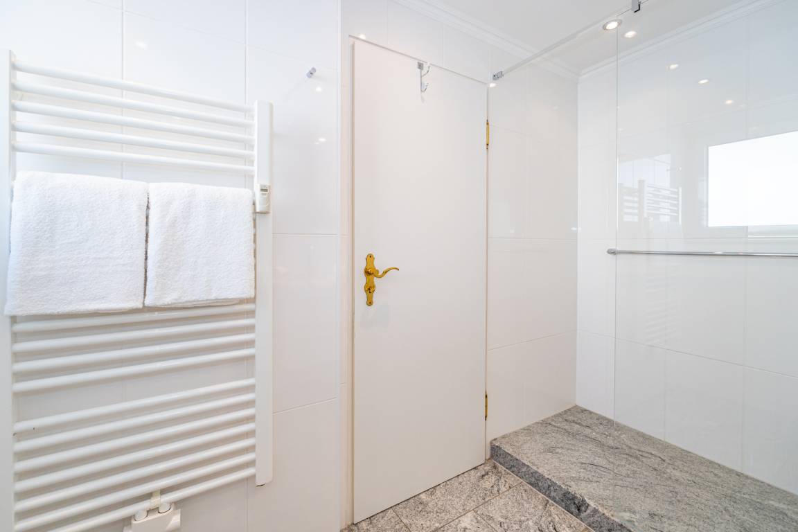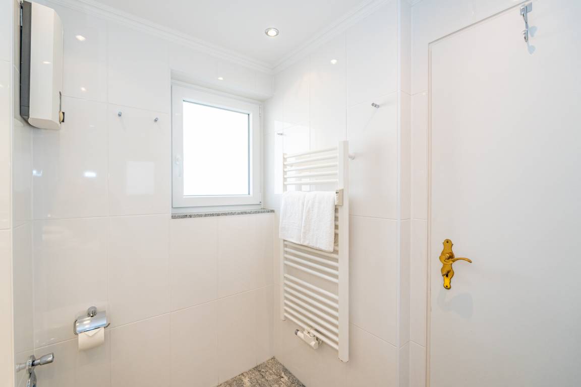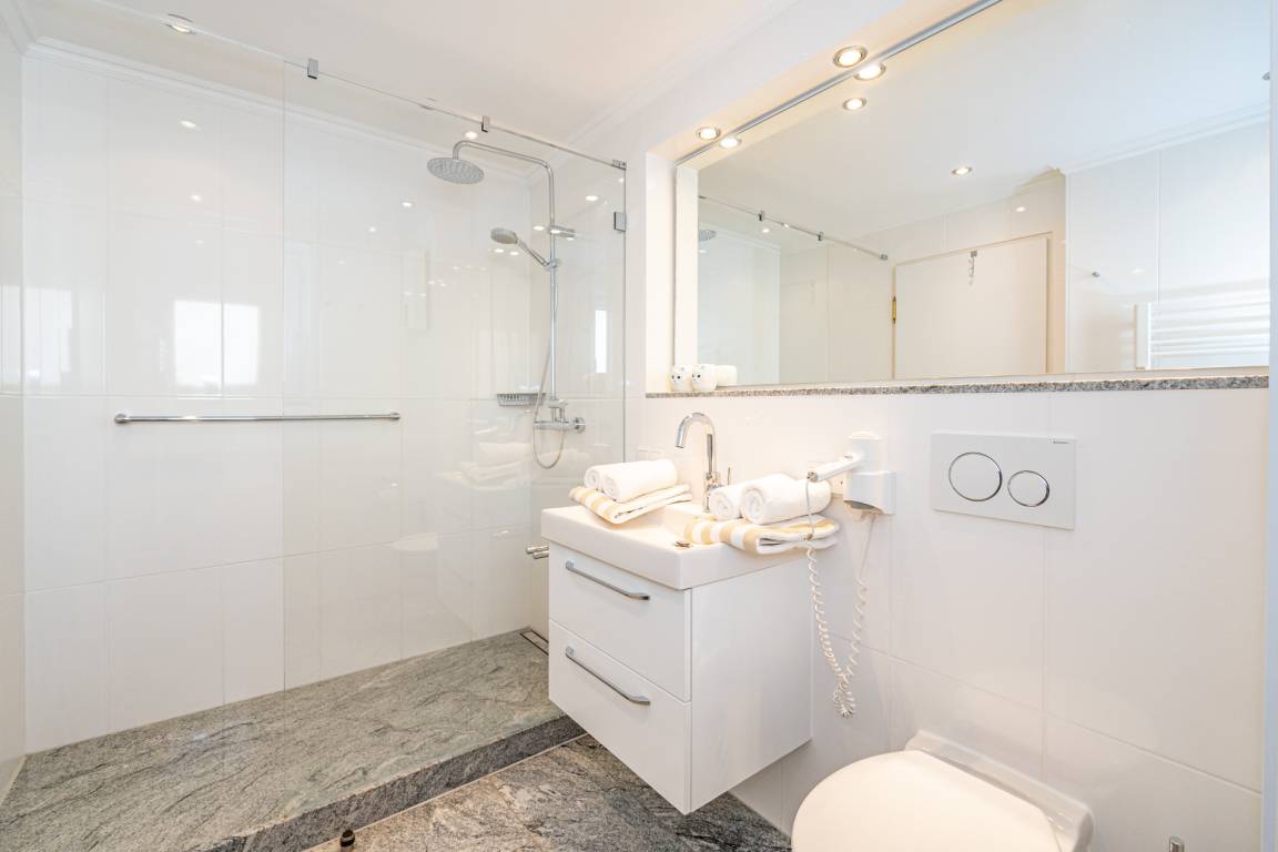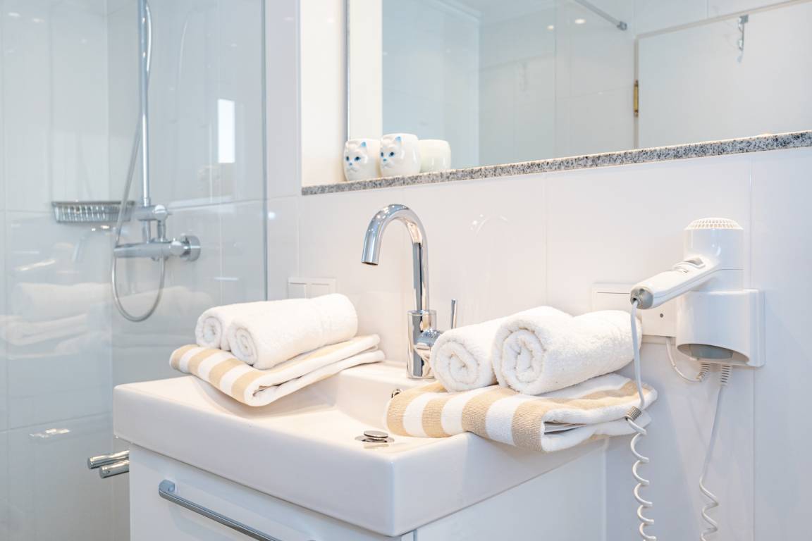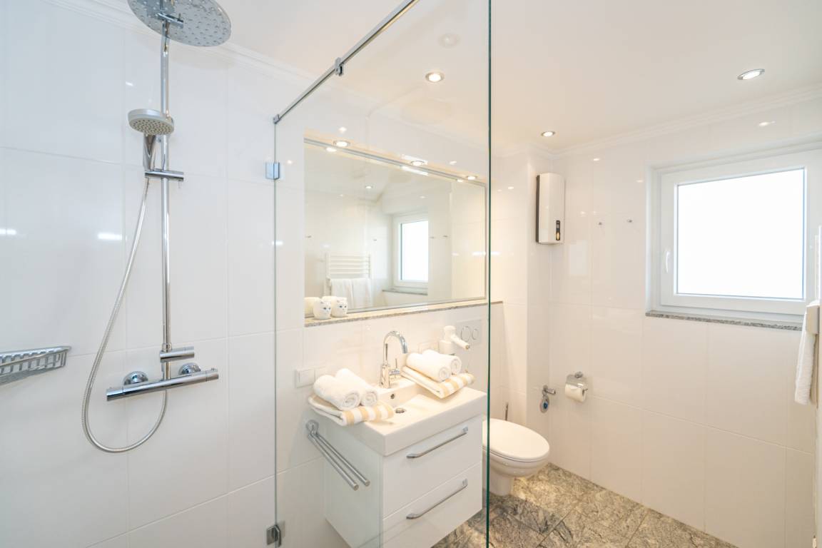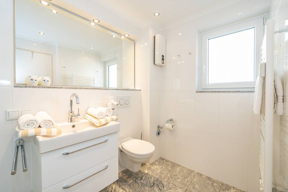 Das neue Badezimmer hat eine Dusche mit extra flachem Einstieg, einen Waschtisch, Handtuchtrockner, Fön, WC und ein Fenster.