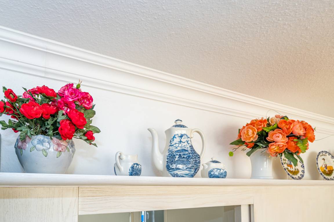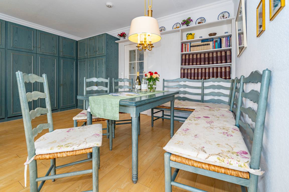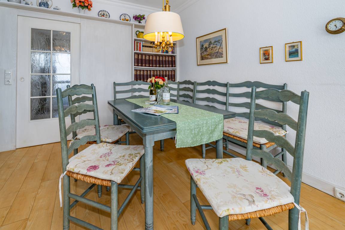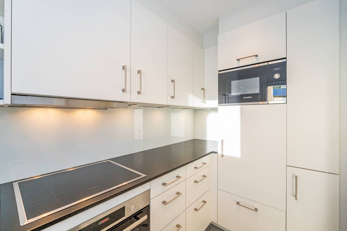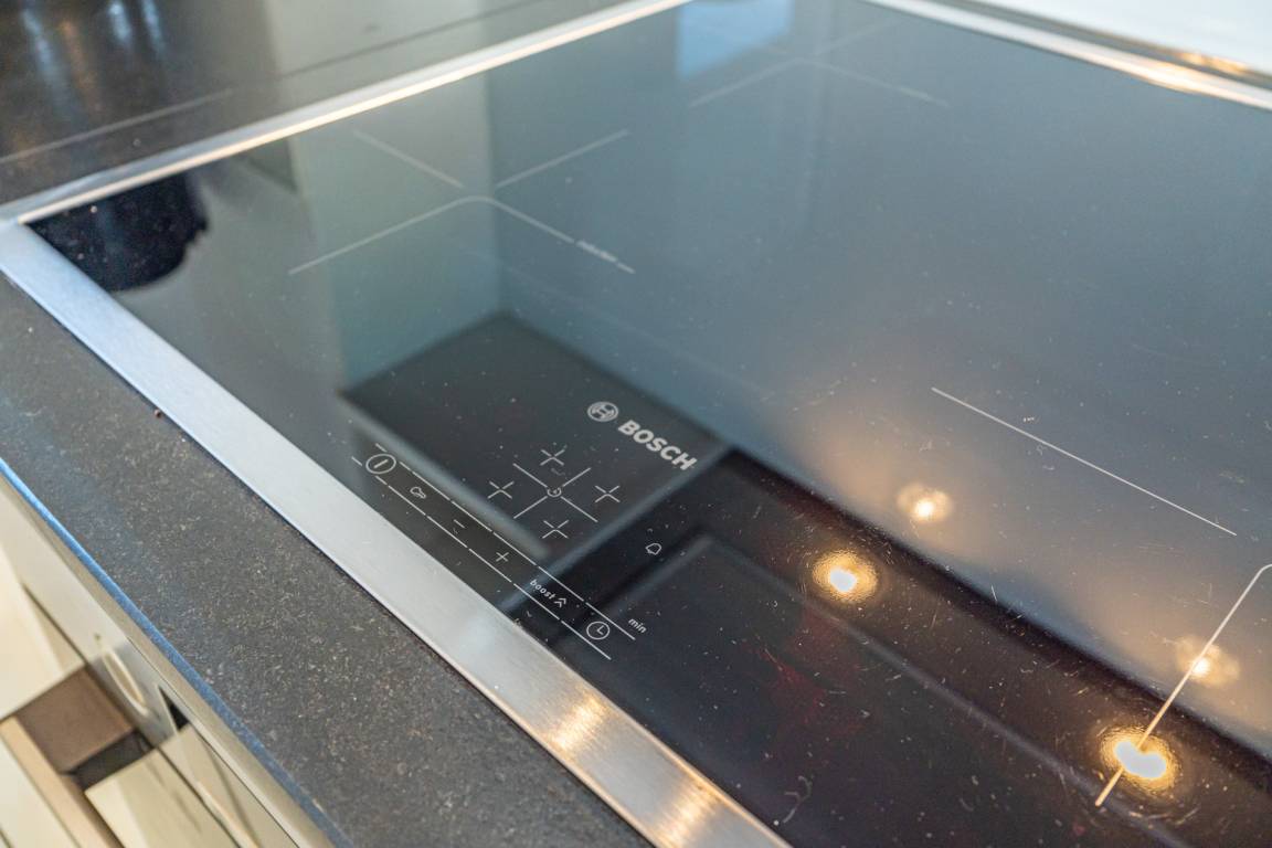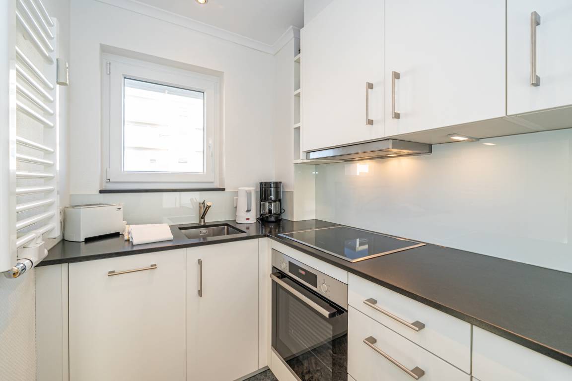 Die separate moderne Einbauküche lässt mit Geschirrspüler, Ceranfeld, Backofen und Fenster kaum Wünsche offen. Kaffeemaschine, Wasserkocher und Toaster gehören zur Grundausstattung.
