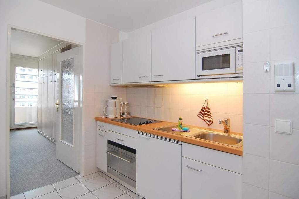 Gepflegtes und helles 1-Zimmer-Appartement mit ca. 30qm im Haus Metropol, 1.OG. Wohn-/Schlafraum mit 2 Einzelschrankbetten, Sitzecke, Essplatz am Fenster, Flat-TV, W-Lan (ohne Gewähr), möblierter Ostbalkon zum Genießen der Morgensonne, Küchenzeile im Flur mit Ceranfeld, Mikrowelle sowie kleinem Geschirrspüler, Duschbad, WC und Fön. Tierhaltung und Rauchen sind nicht gestattet. Bettwäsche und Handtücher sind zur Anreise aufgezogen. Ein PKW-Stellplatz kann kostenpflichtig zugebucht werden.