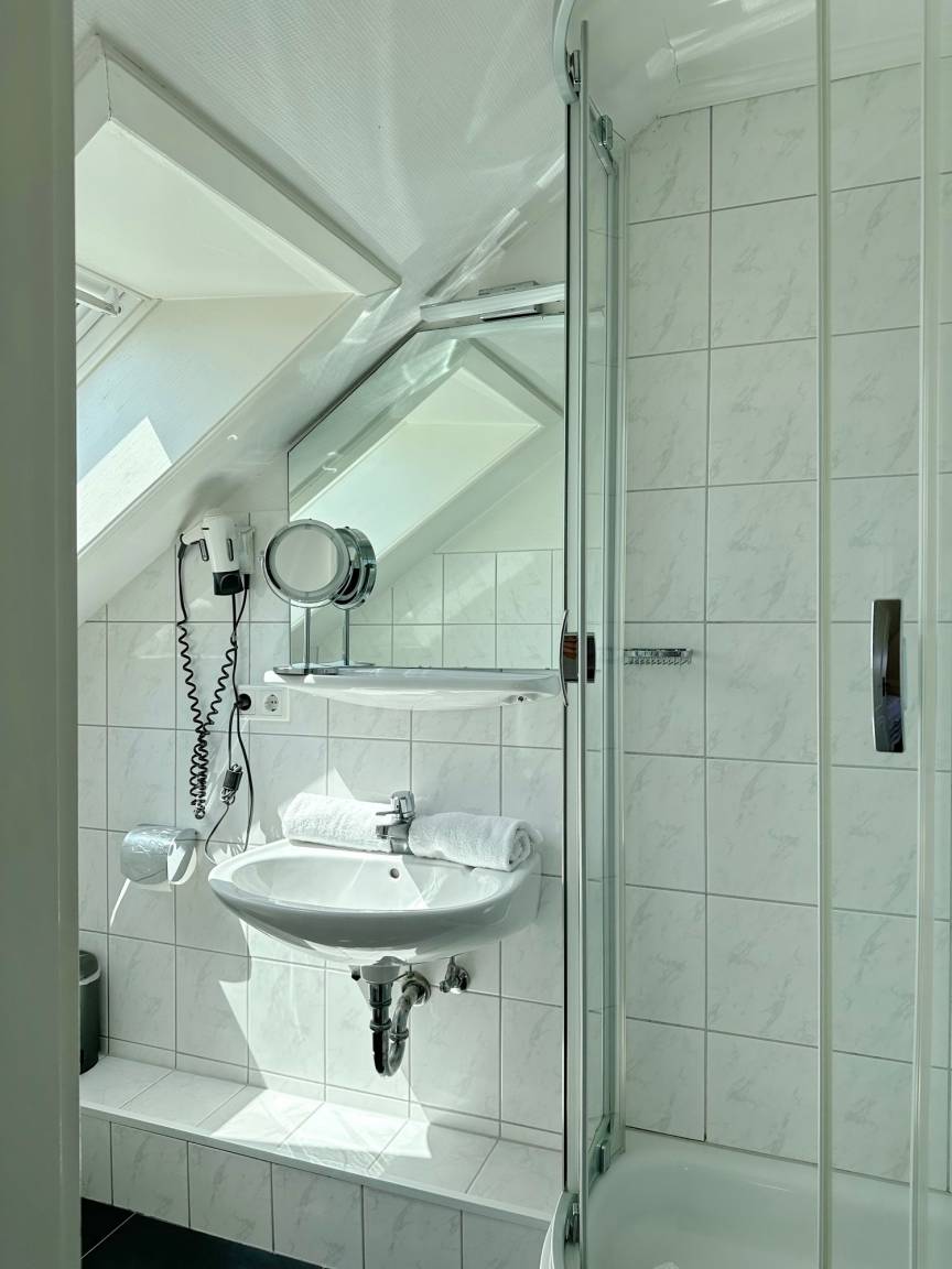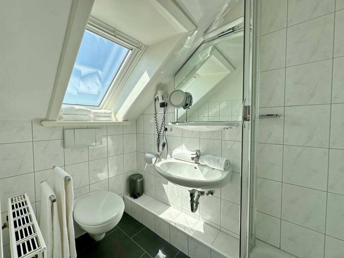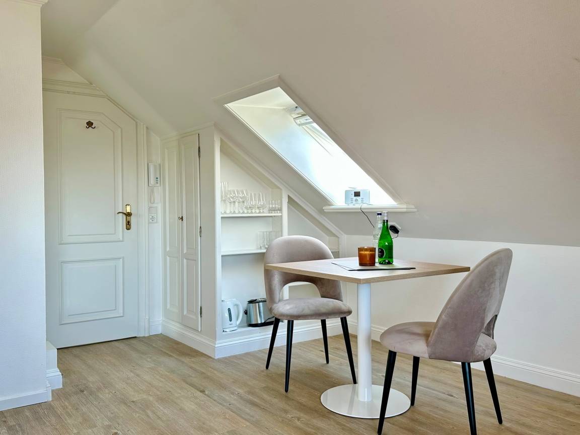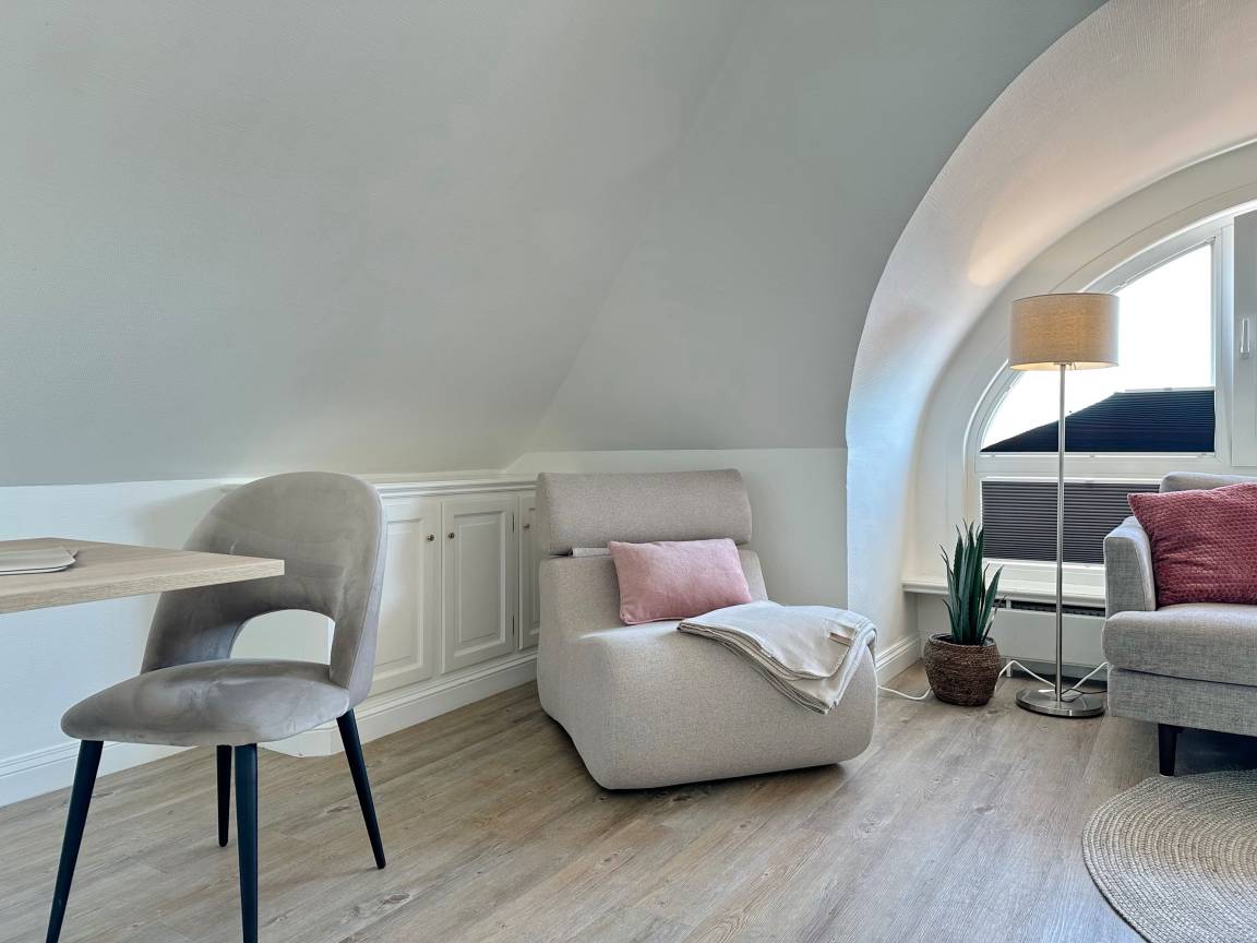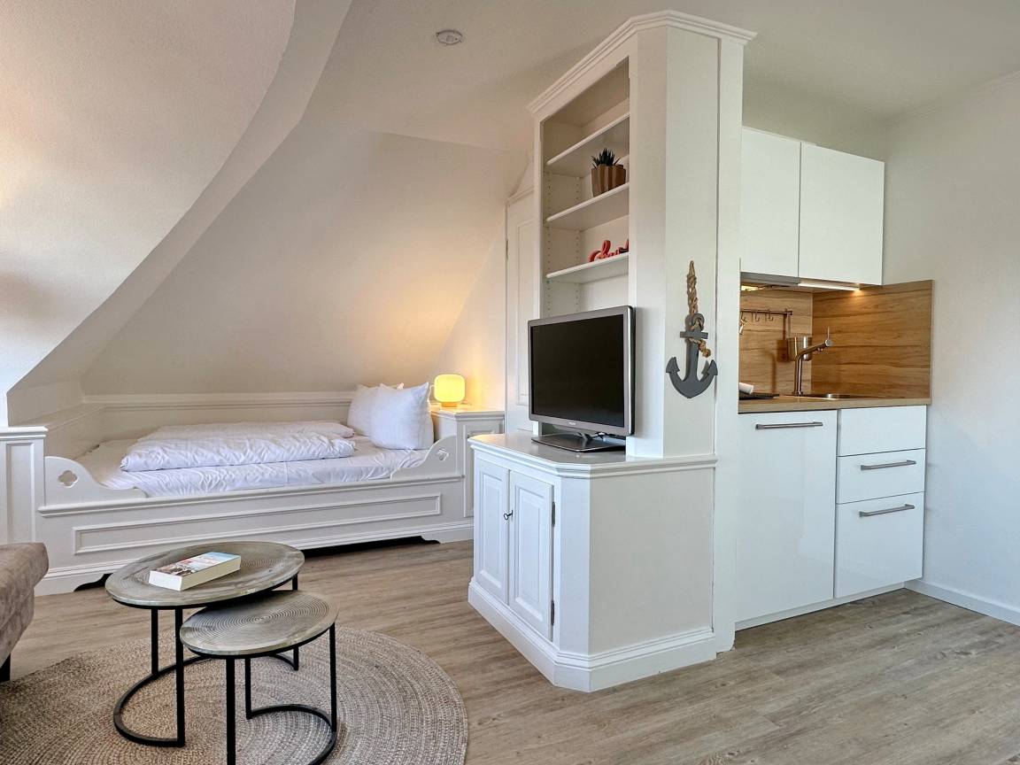 Hübsches 1-Zimmer-Dachstudio mit Schrägen im Haus "Olympia 2". Ca. 28m². Nichtraucherwohnung. Keine Tierhaltung. Wohn- und Schlafzimmer mit Doppelalkovenbett (2x80x200 cm), 2-Sitzercouch und Sessel, Kabel-TV, Radio, W-LAN ohne Gewähr. Integrierte, kleine Kochnische mit mobilen Kochfeld, Kühlschrank mit Gefrierfach, Essplatz für 2 Personen, Duschbad/WC. Im Nebenhaus befinden sich das Schwimmbad, Dampfsauna und Finnische Sauna. Eine Waschküche mit Gemeinschaftswaschmaschine/Trockner ist vorhanden. Garagenstellplatz kann hinzu gebucht werden. Bettwäsche und Handtücher sind zur Anreise aufgezogen.