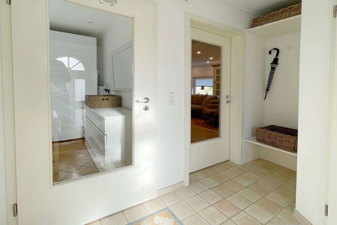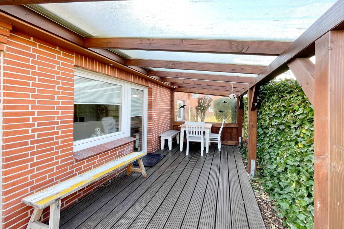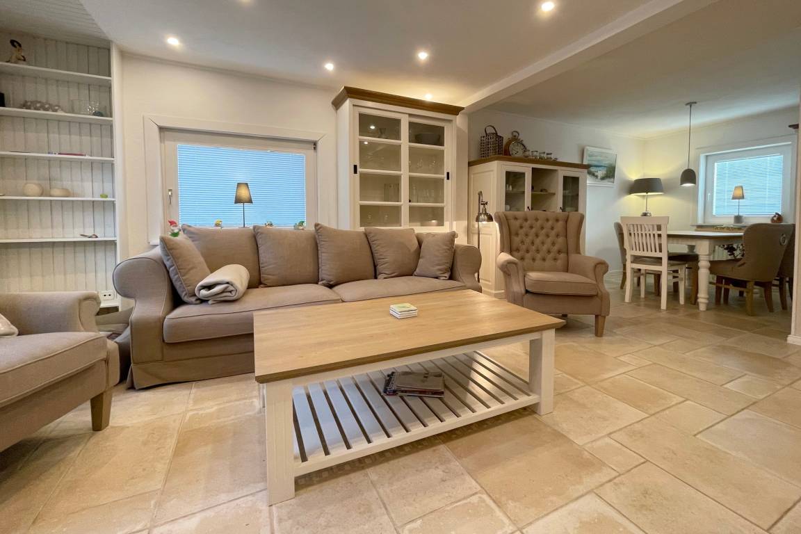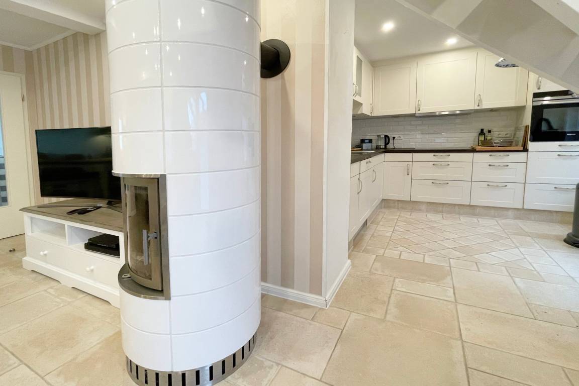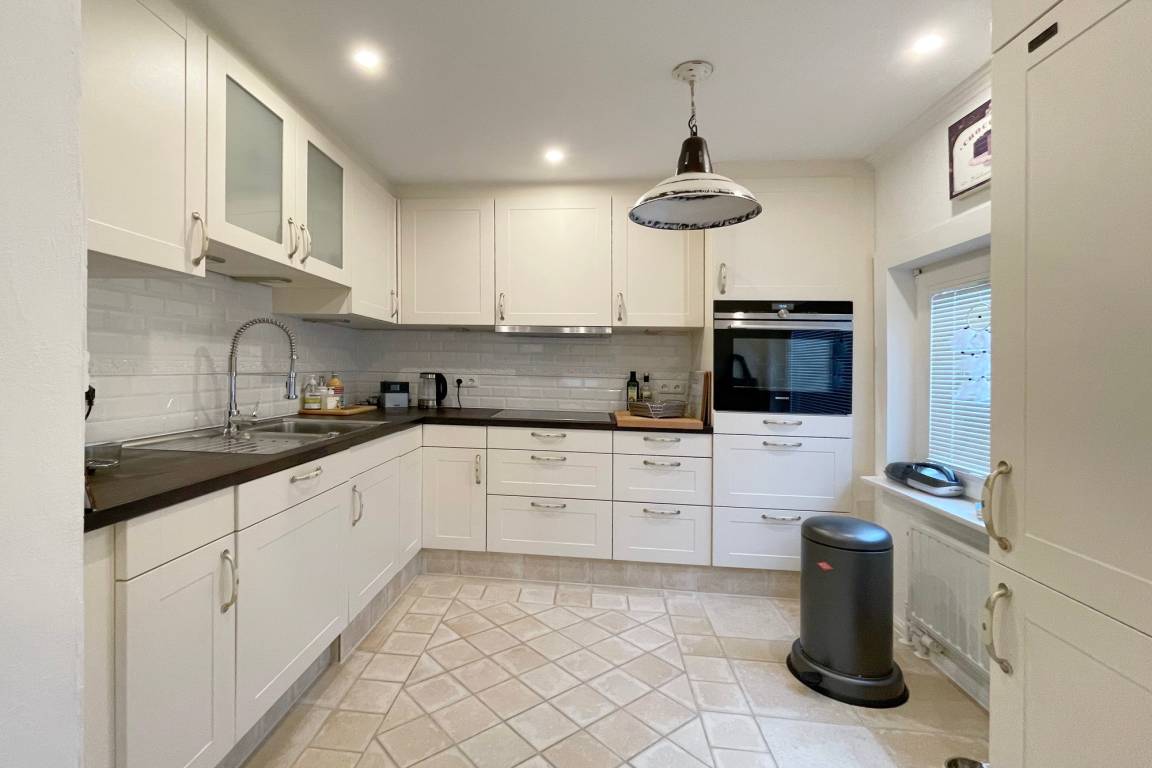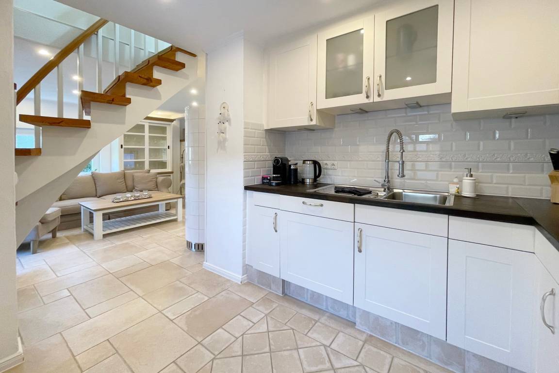 Hier befindet sich auch die offene, vollständig ausgestattete Küche mit Backofen, Geschirrspüler und der Zugang auf die überdachte Terrasse in westlicher Ausrichtung.