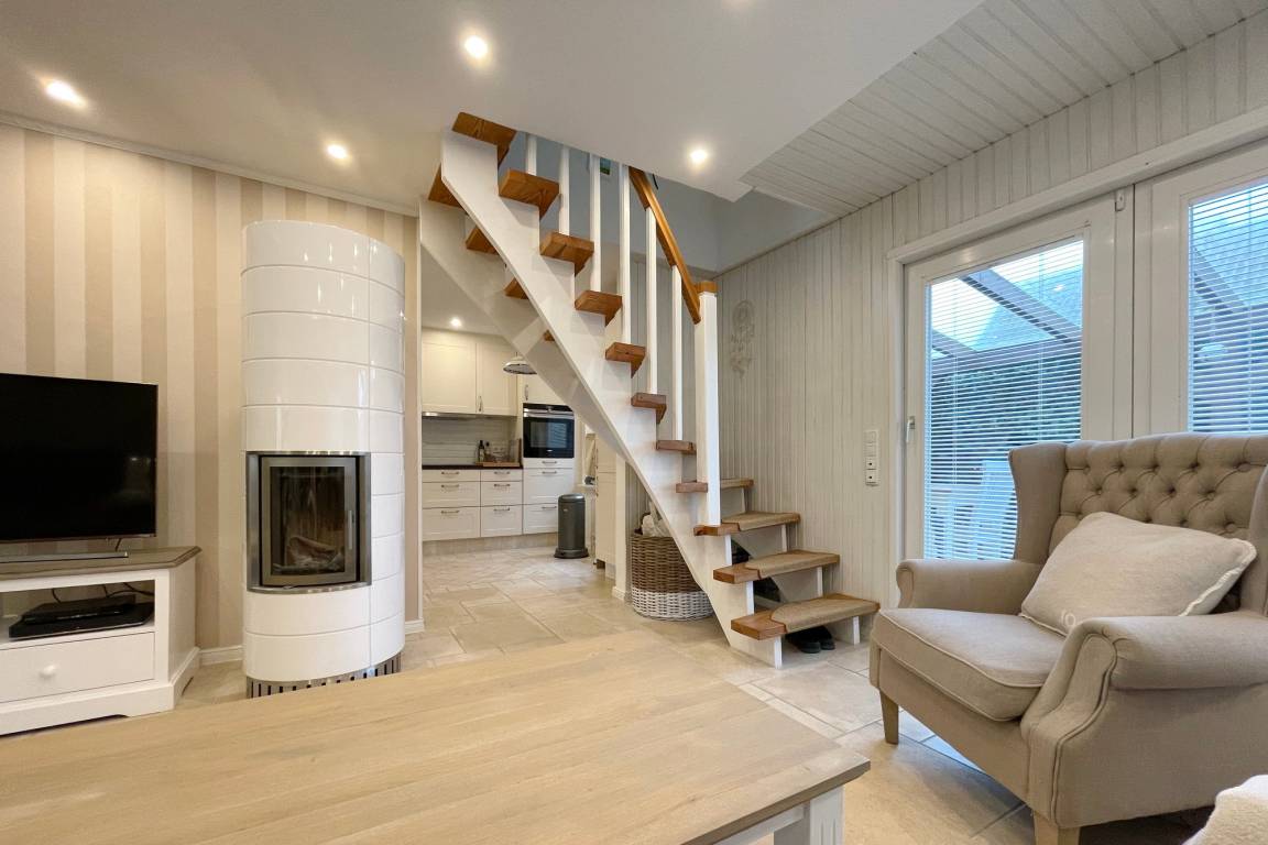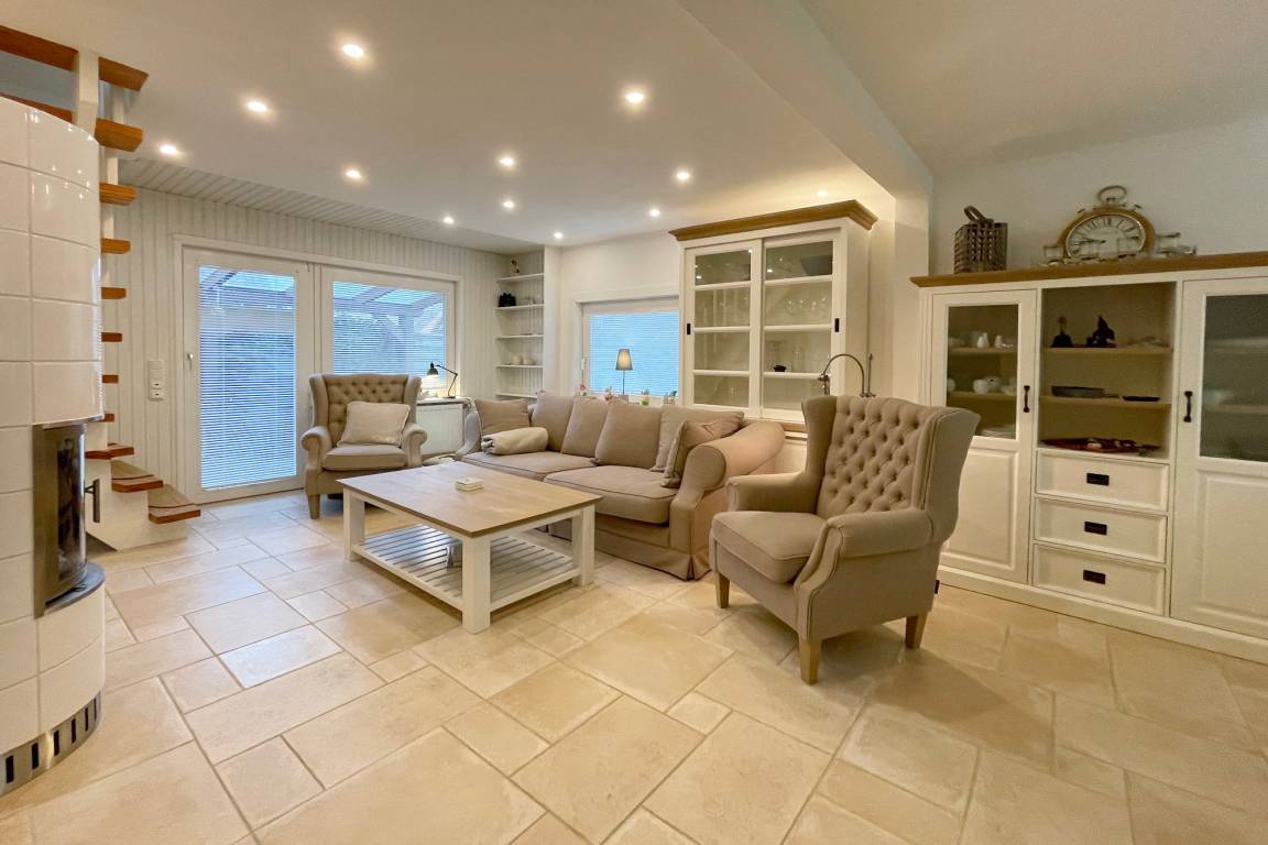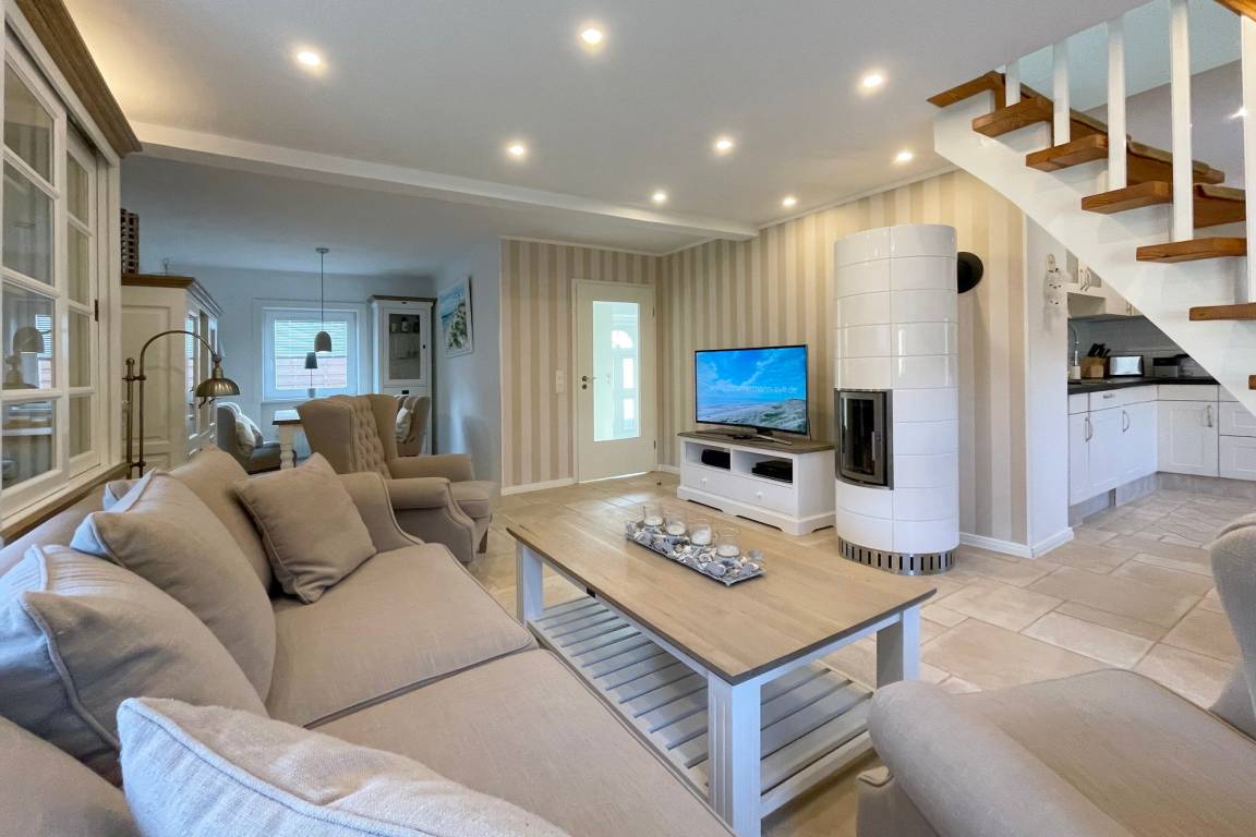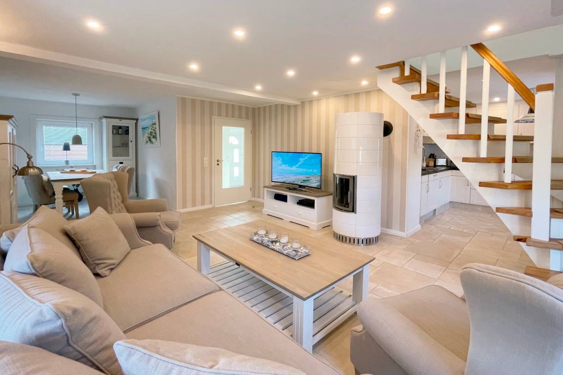 EG: Wohnzimmer mit Kachelofen, Essbereich, Couch, 2 Sessel und Smart-TV. Flur, Duschbad und Hauswirtschaftsraum mit Wasch-/Trockner Kombigerät und Kleiderschrank.