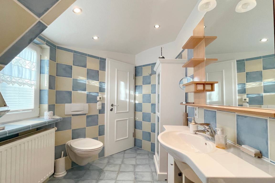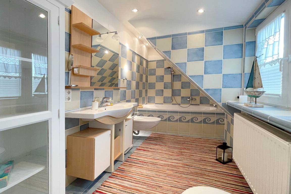 OG: großes Schlafzimmer mit Doppelbett und Kommode, kleines Schlafzimmer mit franz. Bett und ein Badezimmer mit Wanne, WC und Bidet.