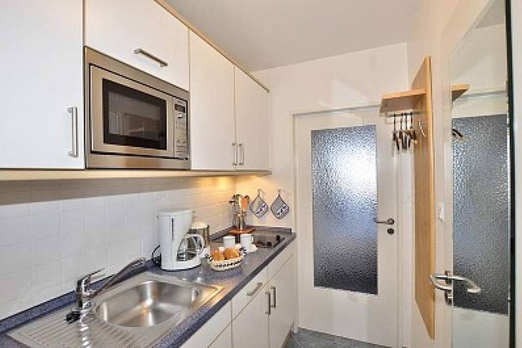 Die moderne Küchenzeile hat ein Cerankochfeld, eine Mikrowelle mit Grillfunktion und einen Kühlschrank mit 3*-Gefrierfach. Kaffeemaschine, Wasserkocher und Toaster gehören zur Grundausstattung.