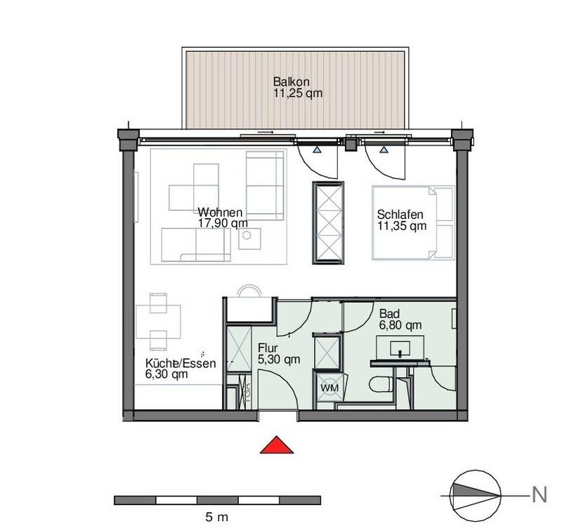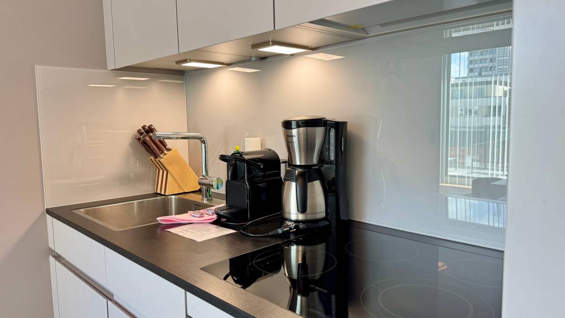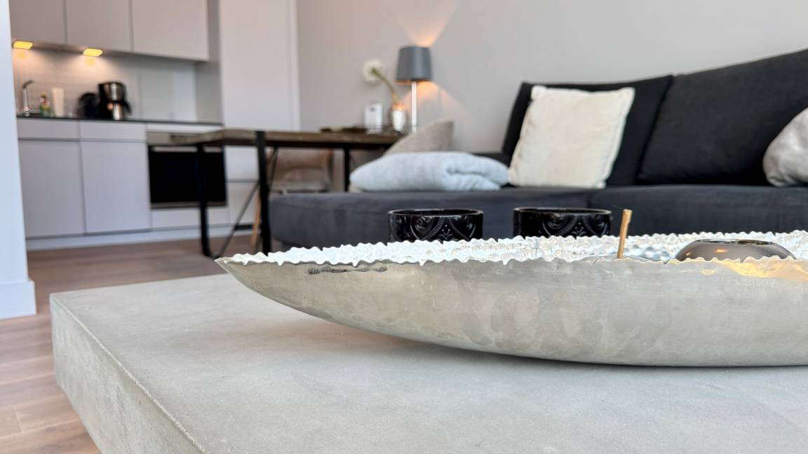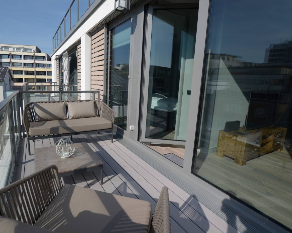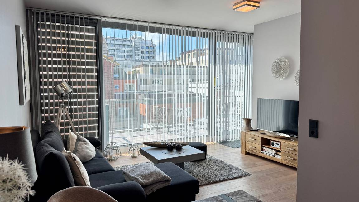 Der Wohnraum verfügt über eine große Couch und einen Flachbild-TV sowie dem angeschlossenem Essbereich und offener Wohnküche. Der großzügige Balkon in Westausrichtung ist ausgestattet mit hochwertigen Lounge-Mobiliar. Das Schlafzimmer verfügt über ein Boxspring-Doppelbett sowie einem Einbau-Kleiderschrank. Das Duschbad mit ebenerdigen Duscheinstieg mit Regenbrause und großem Waschtisch rundet das Angebot ab. Die Wohnung verfügt über einen W-LAN Internetzugang (ohne Gewähr).