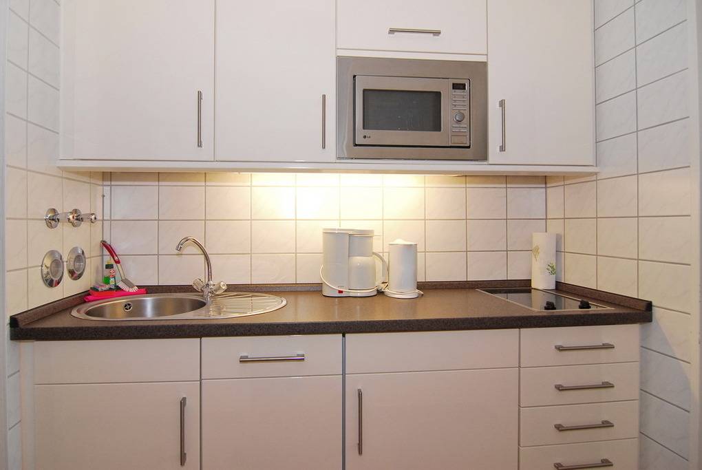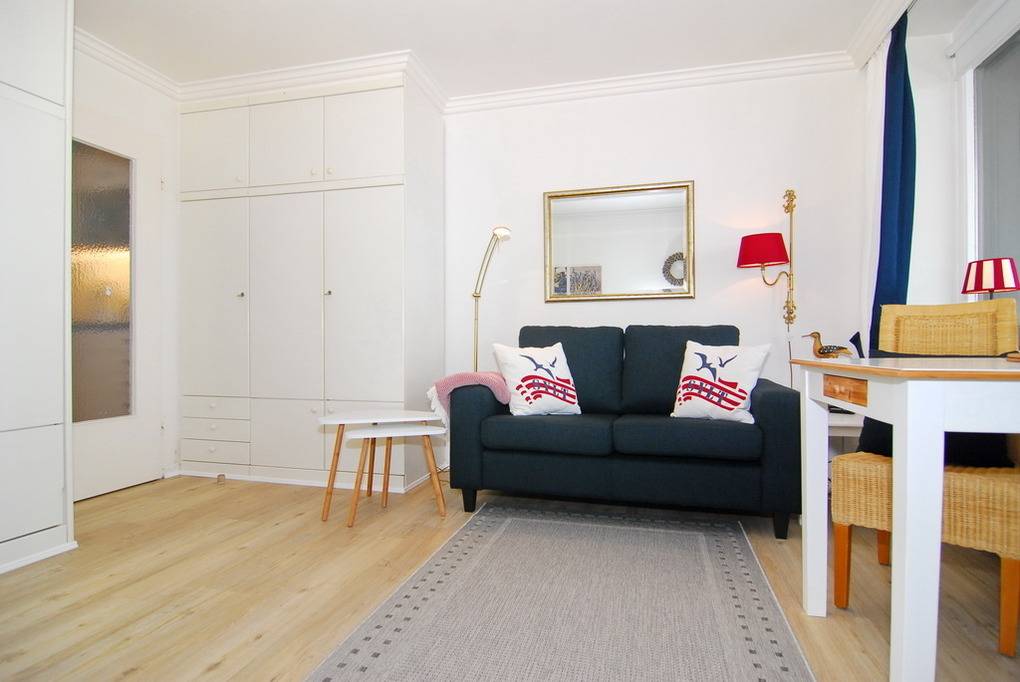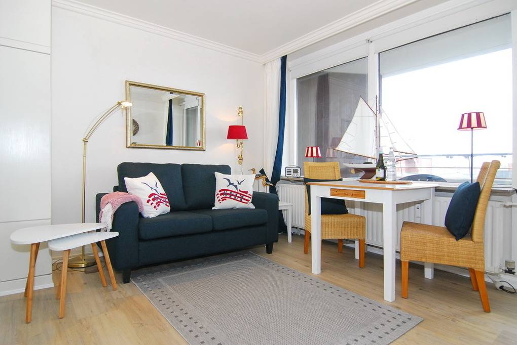 1 Zimmer-Ferienwohnung mit ca. 30m², im 3.OG des Haus am Meer. Die Wohnung ist geschmackvoll eingerichtet und bietet im Wohn-/ Schlafraum zwei Einzelschrankbetten, Sofa, Essplatz am Fenster, Radio und einen kleinen Flat-TV. Im Flurbereich der Wohnung befindet sich die Küchenzeile mit Ceranherd, Mikrowelle und Geschirrspüler sowie ein Duschbad/WC. W-LAN ( ohne Gewähr ). Auf dem möblierten Ostbalkon können Sie sonnige Morgenstunden genießen. Tierhaltung und Rauchen sind in der Wohnung nicht gestattet! Bettwäsche und Handtücher sind zur Anreise aufgezogen. Ein PKW-Stellplatz kann kostenpflichtig zugebucht werden.