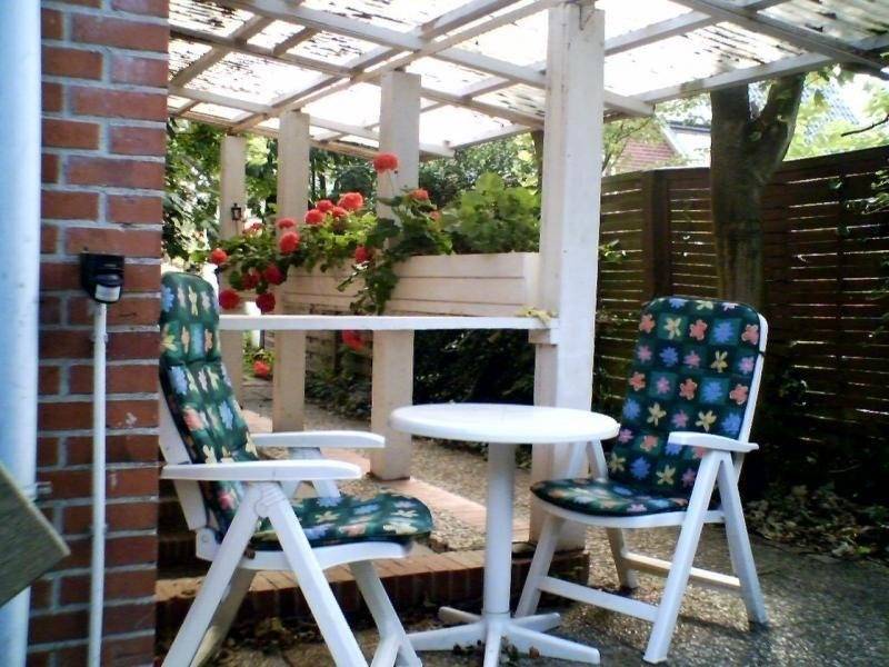 Im Hausgarten gibt es gemütliche Sitzecken, die besonders erholsam sind, wenn Sturm und Regen die Westseite beherrschen sollten.
