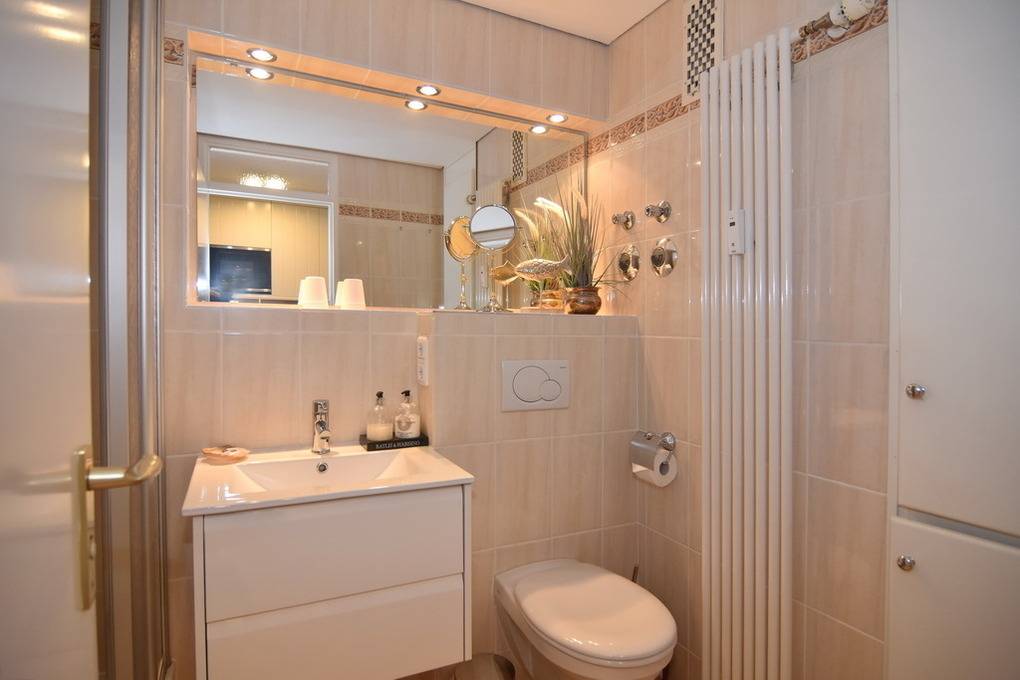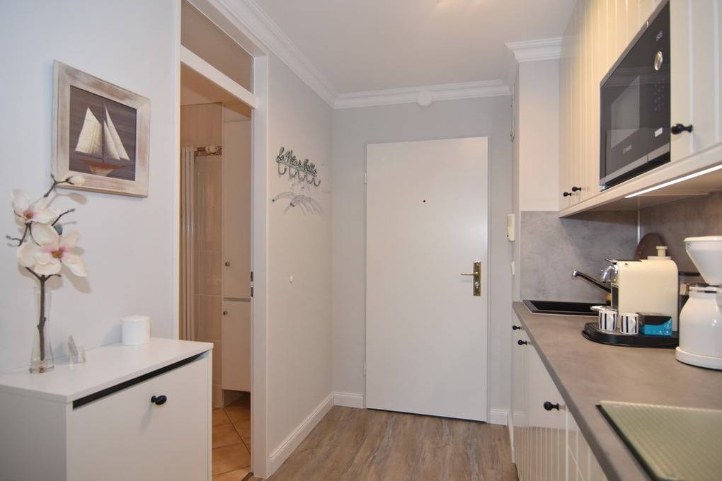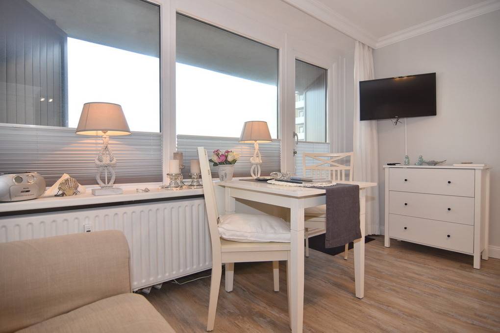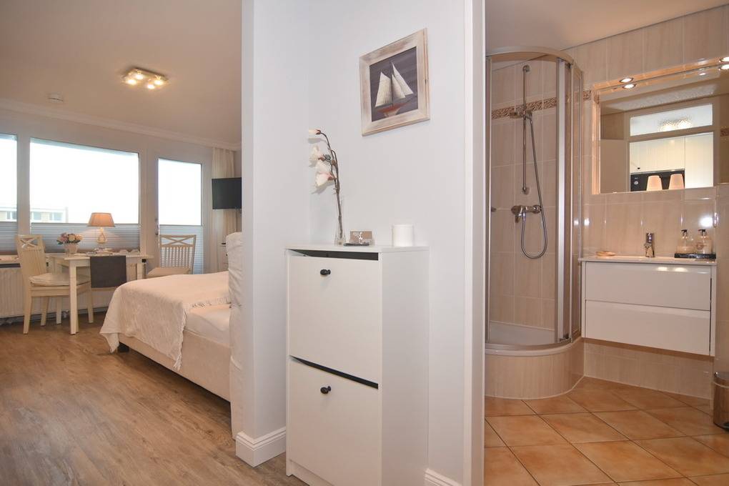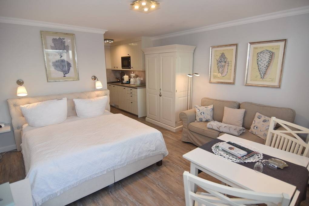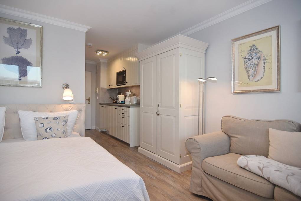 Wunderschöne 1-Zimmer-Wohnung im 3.OG zur Landseite im Haus Metropol. Die Wohnung hat einen kombinierten Wohn- / Schlafraum mit Doppelbett (160x200), 2-Sitzer-Couch und Essplatz am Fenster. Von hier aus gelangen Sie auf den möblierten Ostbalkon. Die offene Küchenzeile verfügt über einen Kühlschrank mit Gefrierfach, 2-Platten-Ceranherd, Geschirrspüler und Mikrowelle. Das Bad ist mit Dusche, Waschtisch und WC ausgestattet. Ein Föhn ist vorhanden. Die Wohnung ist mit einem hellen Designboden in Holzoptik verlegt. Insgesamt ist die Wohnung hell, modern und mit viel Liebe zum Detail ausgestattet. Rauchen und Tierhaltung sind in der Wohnung nicht gestattet. Bettwäsche und Handtücher sind zur Anreise aufgezogen. Ein PKW-Stellplatz kann kostenpflichtig zugebucht werden.