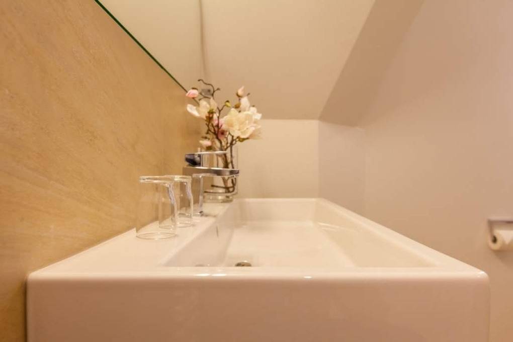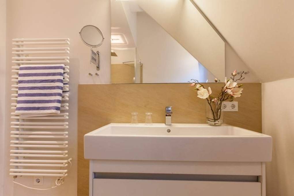 Das neue Bad lässt mit moderner Regendusche, Fön, Kosmetikspiegel, Waschtisch, Handtuchwärmer und WC keine Wünsche offen.