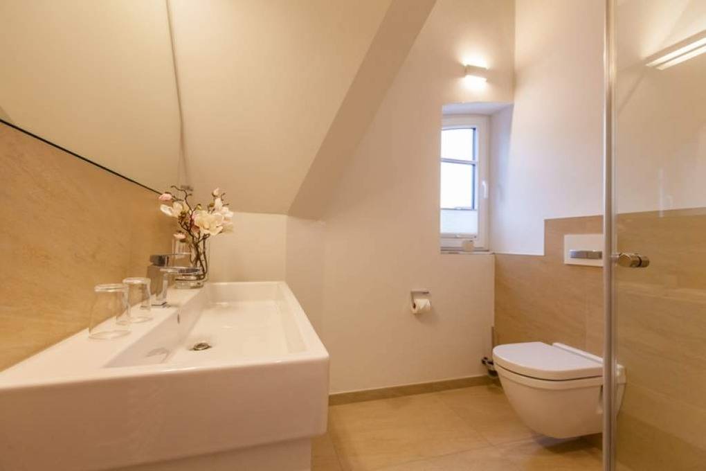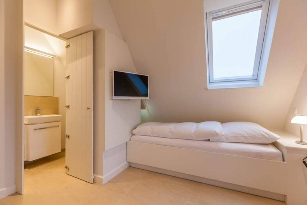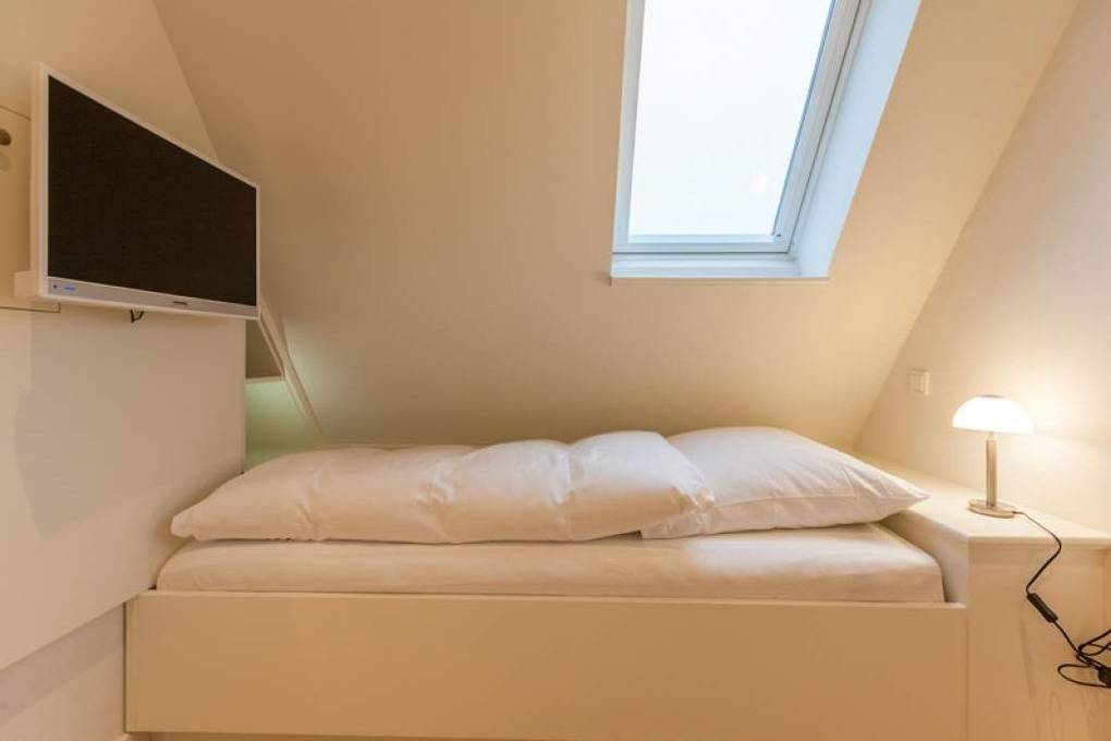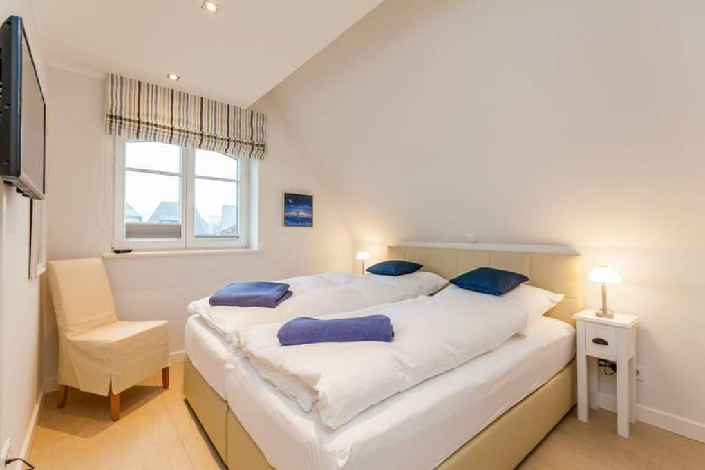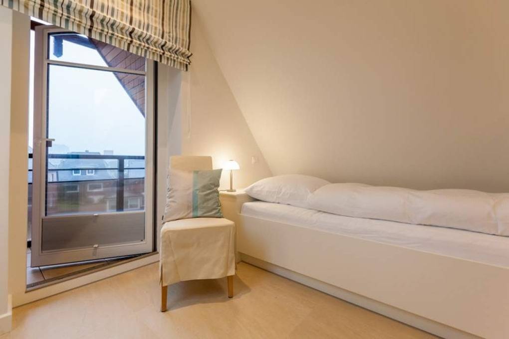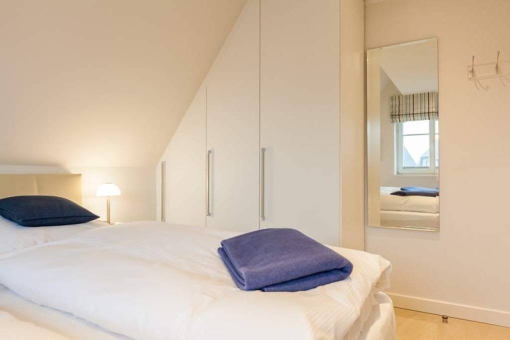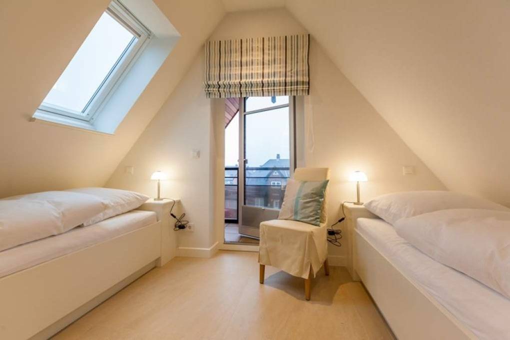 Auf der oberen Ebene, im Dachgeschoss, befinden sich ein Zweibett-Zimmer mit Boxspringbetten (0,90 x 2,00 m), Freiluftzugang zur Westloggia sowie ein Gäste-WC mit Waschbecken.