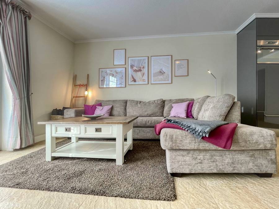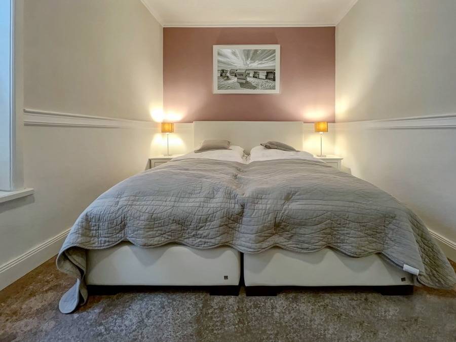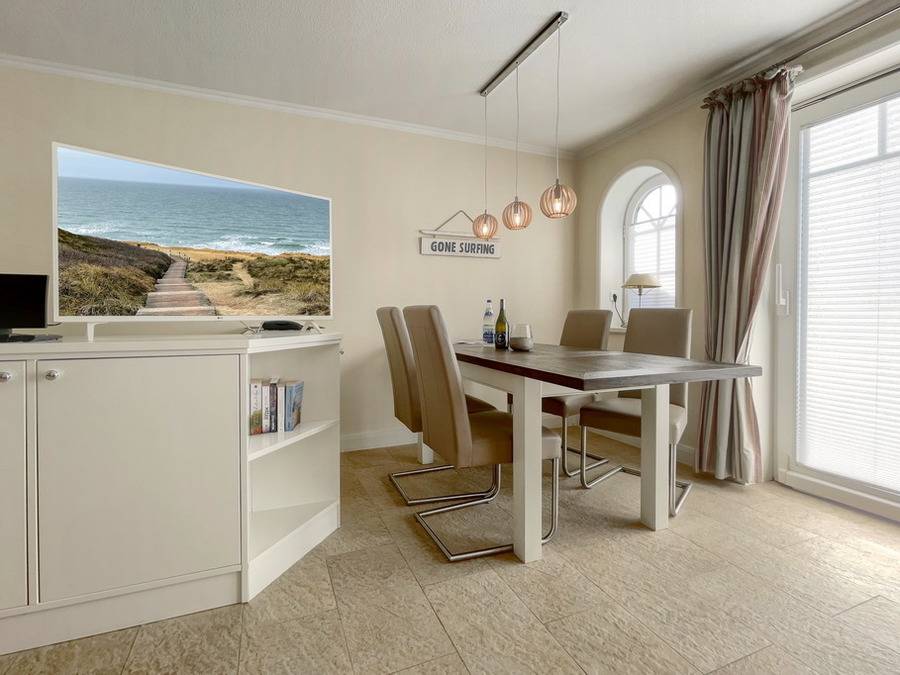 Die hier angebotene Ferienwohnung verfügt über drei Zimmer und befindet sich in direkter Lage am Strandübergang. Die Wohnfläche beträgt ca. 83 qm. Im Erdgeschoss befinden sich ein großzügiges Wohnzimmer mit einer gemütlichen Sitzecke und Flat-TV, einem Essplatz für vier Personen sowie eine offene Küche, die mit einem Cerankochfeld, Geschirrspüler und einer Mikrowelle ausgestattet ist. Ebenso gibt es auf der Ebene ein Duschbad mit Toilette und die Garderobe. Die Südterrasse ist geschützt und zwischen April bis Oktober steht ein Strandkorb zur Verfügung. Im Untergeschoss befinden sich zwei Schlafzimmer mit Box-Spring-Doppelbetten, begehbaren Kleiderschränken und Flat-TV's sowie ein weiteres Duschbad/WC. Bei Bedarf kann ein kostenloser Pkw-Stellplatz dazu gebucht werden. Haustiere sind in der Ferienwohnung nicht erlaubt. Die Bettwäsche und Handtücher sind bei Anreise bereits aufgezogen.