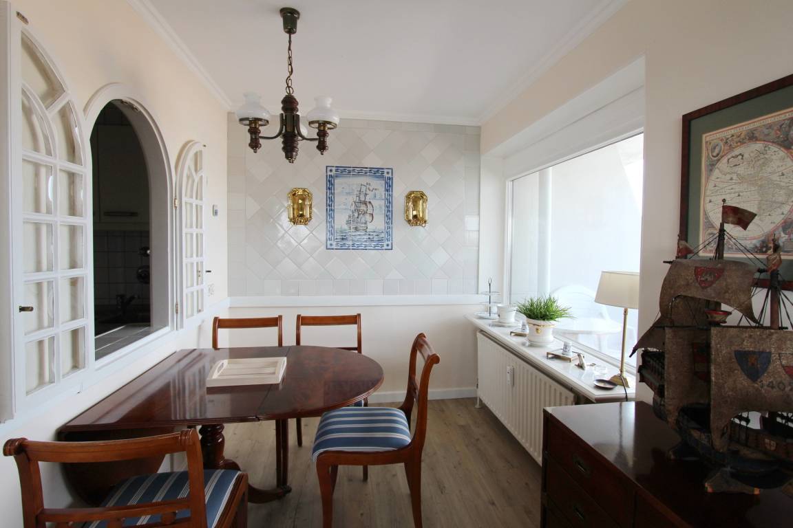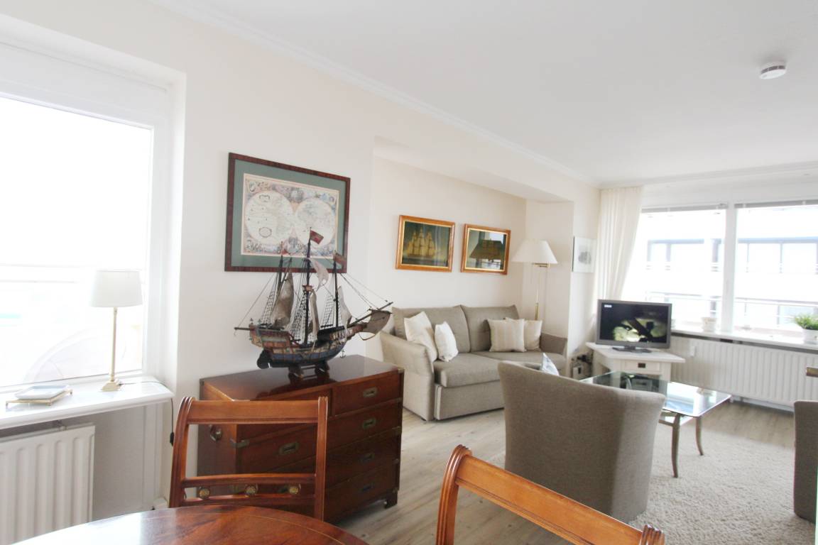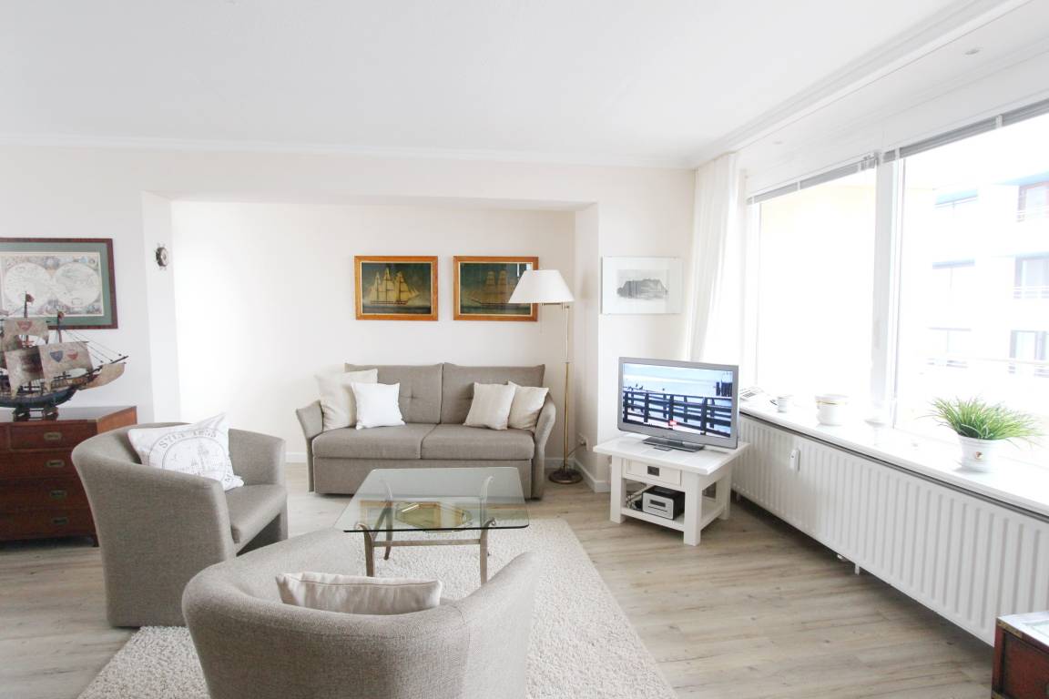 Diese gemütliche 2 Zimmer-Nichtraucherwohnung befindet sich in der 5. Etage des Hauses Metropol und hat Balkone zur Ost -und Nordseite. Im großzügigen Wohn-Esszimmer gibt es eine Schlafcouch, 2 Fernsehsessel und einen Esstisch mit 4 Stühlen von dem sie direkt aufs Meer schauen können. Im Wohnbereich wurde hochwertiger Designfussboden verlegt und mit vielen, liebevoll ausgesuchten Details, ein maritimes Ambiente erzeugt. Das lichtdurchflutete Schlafzimmer hat ein Doppelbett und viel Stauraum für ihre persönlichen Dinge, sowie einen kleinen Balkon zur Ostseite. In der kleinen, aber feinen Küche mit Durchreiche zum Essbereich, gibt es einen Backofen. Kleinere Mahlzeiten können sie hier problemlos zubereiten und beim Kochen sogar auf die Nordsee schauen. Das Badezimmer hat auch einen Zugang vom Flur aus und verfügt über eine Badewanne und ein zusätzliches Urinal.