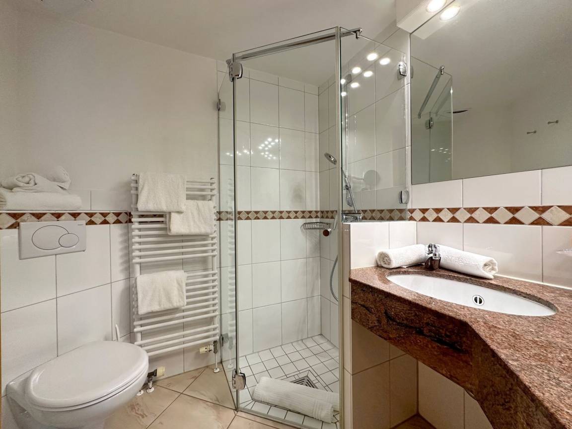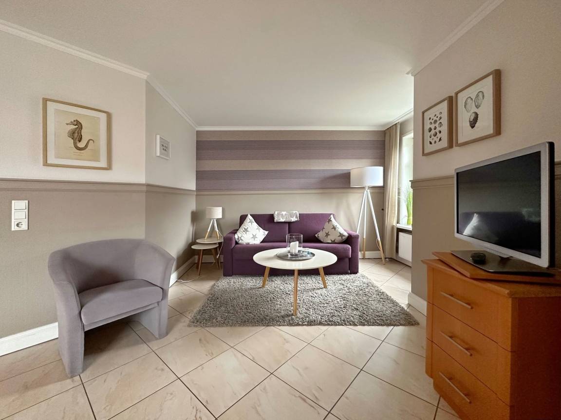 Hübsche 2-Zimmer-Ferienwohnung im Haus "Olympia III" im 1. OG mit sonnigem Südwestbalkon. Ca. 50m². Nichtraucherwohnung. Wohnzimmer mit hübscher Küche mit Geschirrspüler und Backofen, Doppelschlafcouch und Essplatz für 4 Personen, Duschbad/WC, Schlafzimmer mit Doppelbett, Flur mit Garderobe, Kabel-TV und Radio. Unter Haus 4 befindet sich das Schwimmbad mit Finnischer Sauna. Unter Haus 2 befindet sich ein separater Wellnessbereich mit Dampfsauna, Finnischer Sauna und Ruhebereich. Eine Waschküche mit Gemeinschaftswaschmaschine/Trockner ist vorhanden. Offenes W-LAN-Netzwerk steht zur Verfügung (ohne Gewähr). Bettwäsche und Handtücher sind zur Anreise aufgezogen. Ein Garagenstellplatz kann kostenpflichtig gebucht werden!