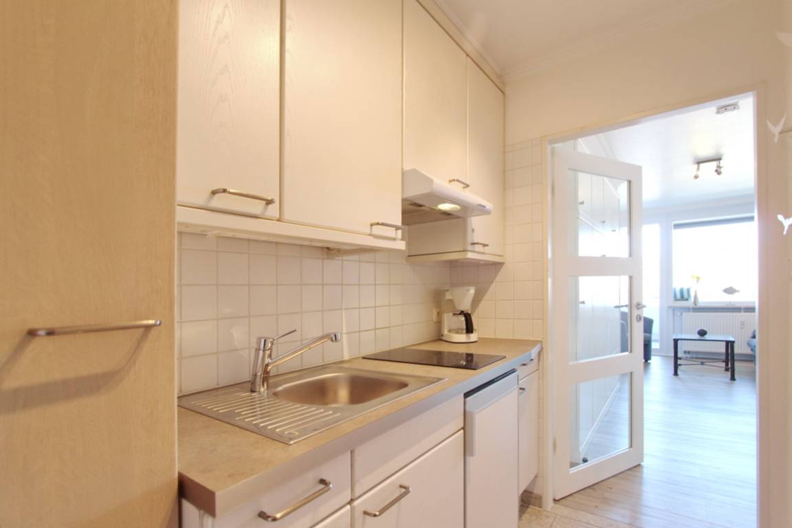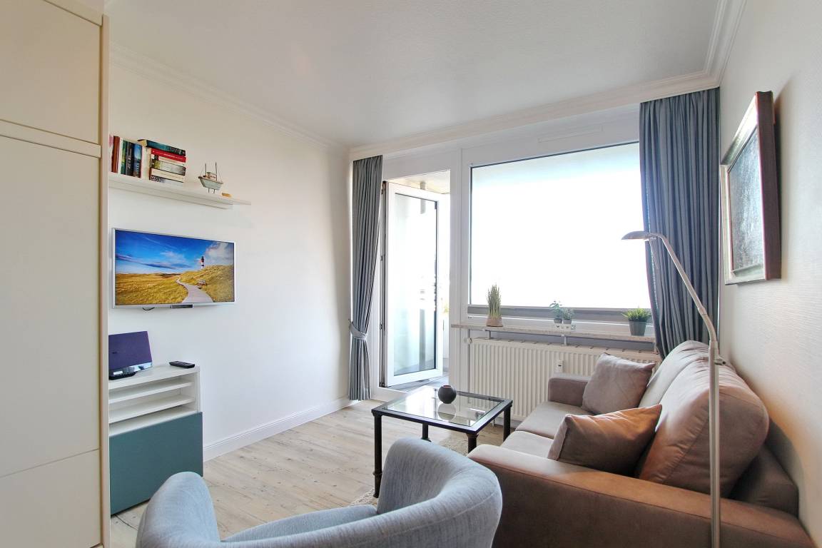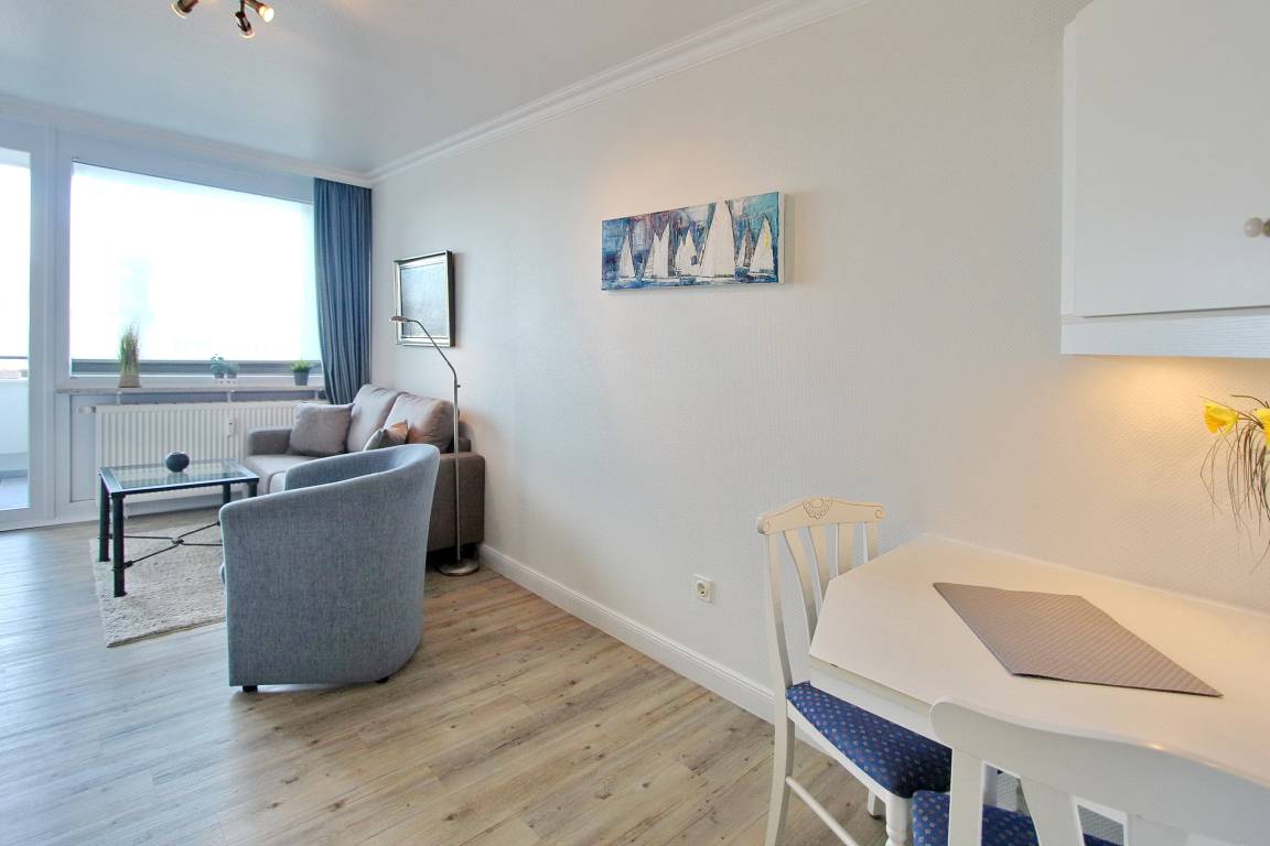 Hell und gemütlich eingerichtete Einzimmerwohnung in der 2. Etage im Haus Wiking mit vorgelagerter West-Loggia - auf der man ab Mittags die Sonne genießen kann. Der kombinierte Wohn-/Schlafraum ist mit einem Doppelschrankbett einer Couchgarnitur mit Sessel und einem Essplatz ausgestattet. Durch den Designfussboden in Holzoptik eignet sich die Wohnung hervorragend für Hausstauballergiker. Um sich selbst zu verpflegen gibt es im Vorflur eine Einbauküche mit[nbsp] einem Induktionsherd, eine Mikrowelle und eine Nespressomaschine. Das modernisierte Badezimmer ist mit einer Dusche mit niedrigem Einstieg, Waschbecken, Handtuchheizkörper, Schminkspiegel und Fön ausgestattet. Zur technischen Ausstattung der Wohnung gehört ein Flachbild-TV, ein Safe, ein Radio mit Ipod-Dockingstation. Der freie WLAN Hotspot der WEG Haus Wiking (LAN1 - Passwortfrei - ohne Gewähr) steht ihnen kostenfrei zur Verfügung. Nichtraucherwohnung. Die Wohnung wurde vom DTV mit 3 Sternen klassifiziert. Wohnungsgröße ca. 27 m².
