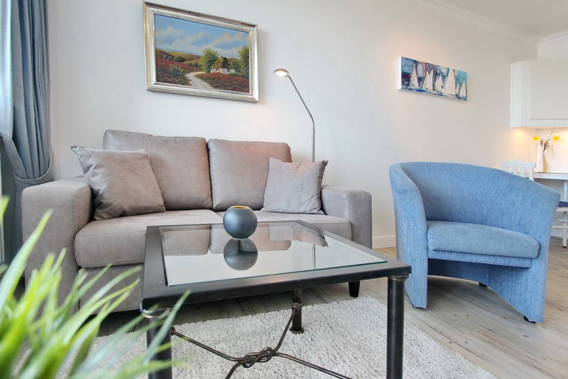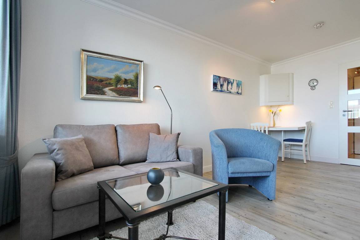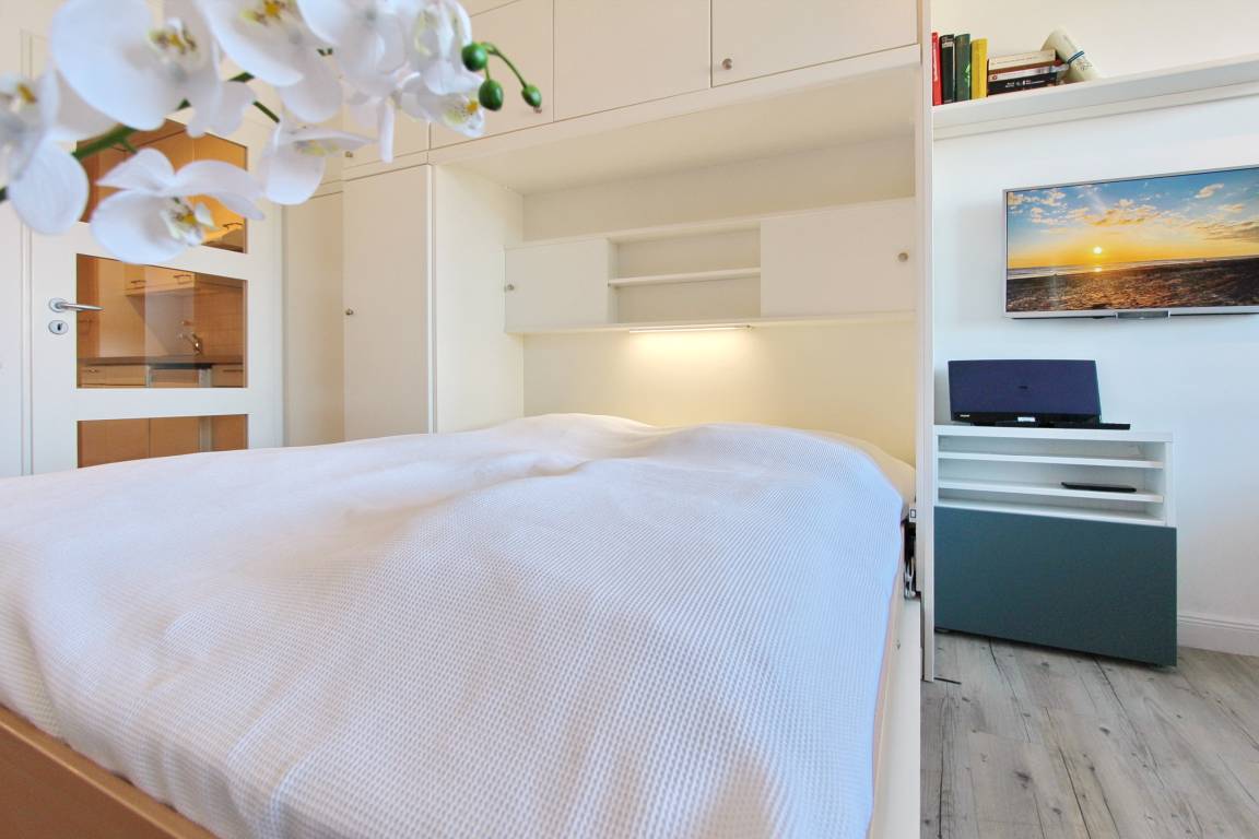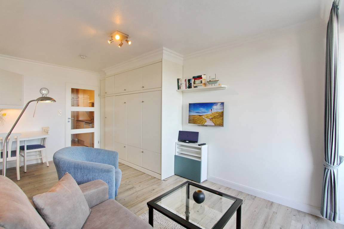 Hell und gemütlich eingerichtete Einzimmerwohnung in der 2. Etage im Haus Wiking mit vorgelagerter West-Loggia - auf der man ab Mittags die Sonne genießen kann. Der kombinierte Wohn-/Schlafraum ist mit einem Doppelschrankbett einer Couchgarnitur mit Sessel und einem Essplatz ausgestattet. Durch den Designfussboden in Holzoptik eignet sich die Wohnung hervorragend für Hausstauballergiker. Um sich selbst zu verpflegen gibt es im Vorflur eine Einbauküche mit[nbsp] einem Induktionsherd, eine Mikrowelle und eine Nespressomaschine. Das modernisierte Badezimmer ist mit einer Dusche mit niedrigem Einstieg, Waschbecken, Handtuchheizkörper, Schminkspiegel und Fön ausgestattet. Zur technischen Ausstattung der Wohnung gehört ein Flachbild-TV, ein Safe, ein Radio mit Ipod-Dockingstation. Der freie WLAN Hotspot der WEG Haus Wiking (LAN1 - Passwortfrei - ohne Gewähr) steht ihnen kostenfrei zur Verfügung. Nichtraucherwohnung. Die Wohnung wurde vom DTV mit 3 Sternen klassifiziert. Wohnungsgröße ca. 27 m².