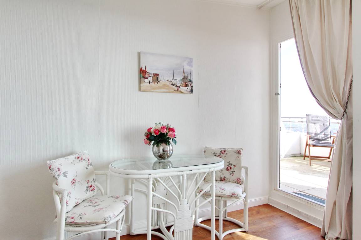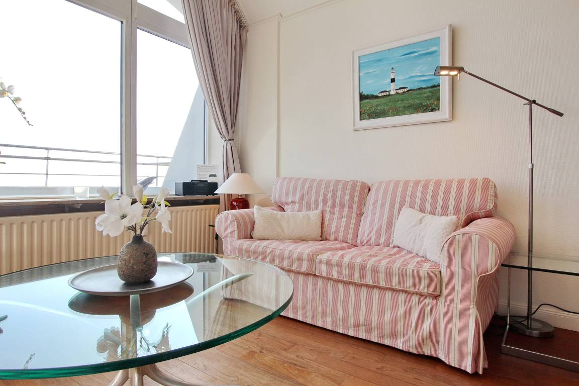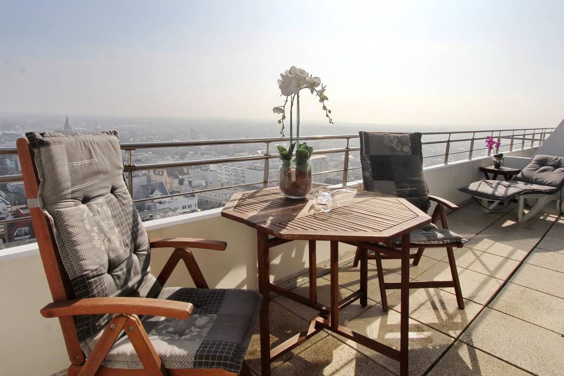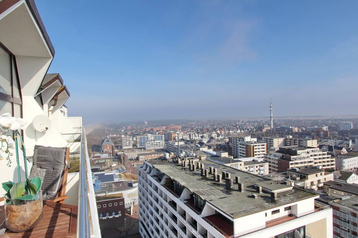 Penthouse-Wohnung in der 14. Etage im Haus Metropol mit großzügiger Dachterrasse. Balkonmöbel sind vorhanden und von hier oben können Sie den herrlichem Weitblick über die Insel und die Stadt genießen. Die Sonnenaufgänge können spektakulär sein und machen Ihr Urlaubsdomizil zu etwas ganz besonderem. Gemütlich eingerichteter Wohn-/Schlafraum mit Doppelschrankbett, Echtholzfußboden, Couch und Sessel sowie Essplatz mit 2 Stühlen. Die großen Panoramafenster lassen viel Licht in die Wohnung. Das Badezimmer verfügt über eine Dusche. In der offenen Küchenzeile im Flur mit Induktionsherd, Geschirrspüler, Mikrowellen-Grillkombination können Sie sich selbst verpflegen. Zur technischen Ausstattung gehört: ein Radio und ein Flachbildfernseher. Der freie WLAN Hotspot (WEG Haus Metropol - Passwortfrei - ohne Gewähr) steht ihnen kostenfrei zur Verfügung. Die Penthouseetage ist über eine Treppe erreichbar, da der Aufzug in der 13. Etage endet. Wohnungsgröße: ca. 38 m².