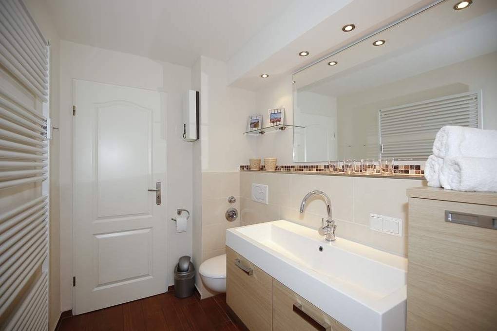Im neuen großzügigen Bad befinden sich eine große, sehr flache Dusche, ein WC, ein Waschtisch, ein Handtuchtrockner und ein Fön.