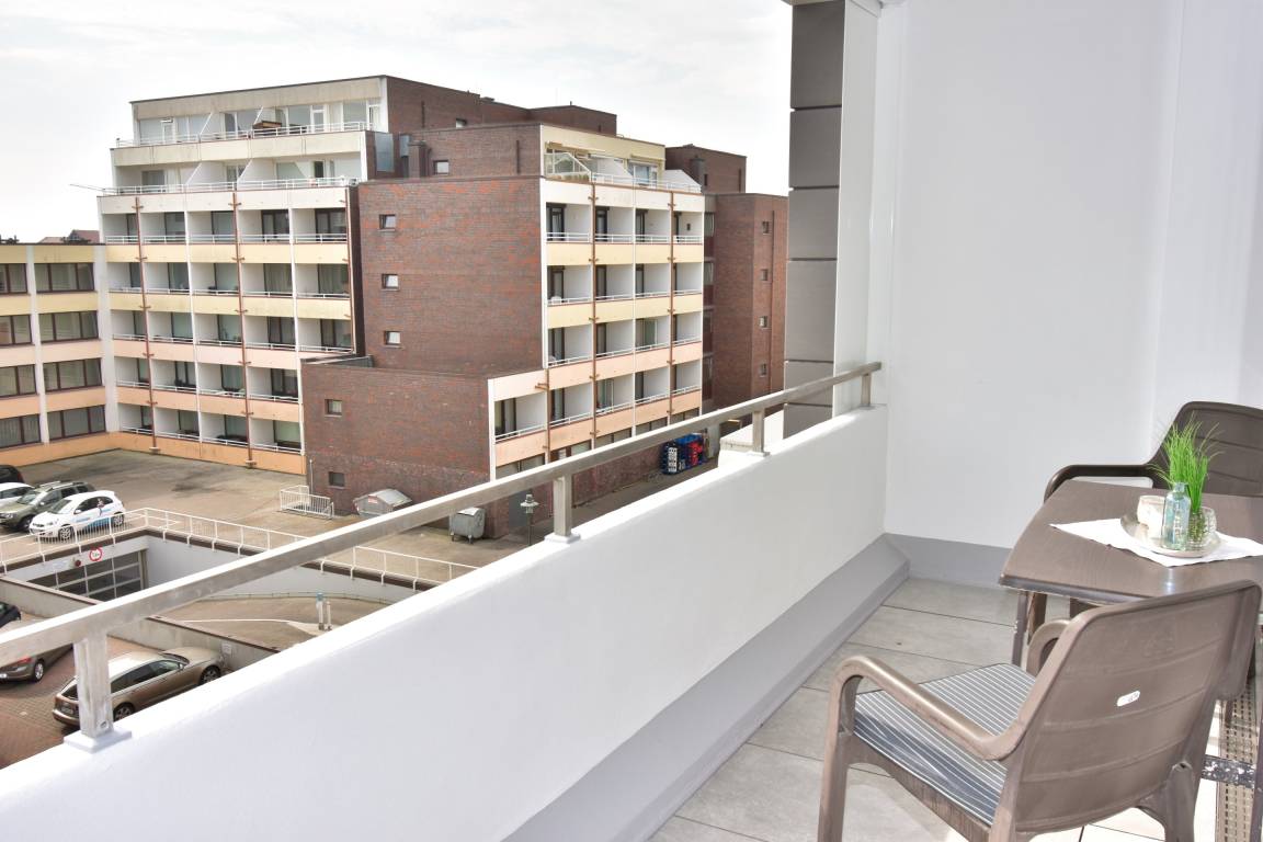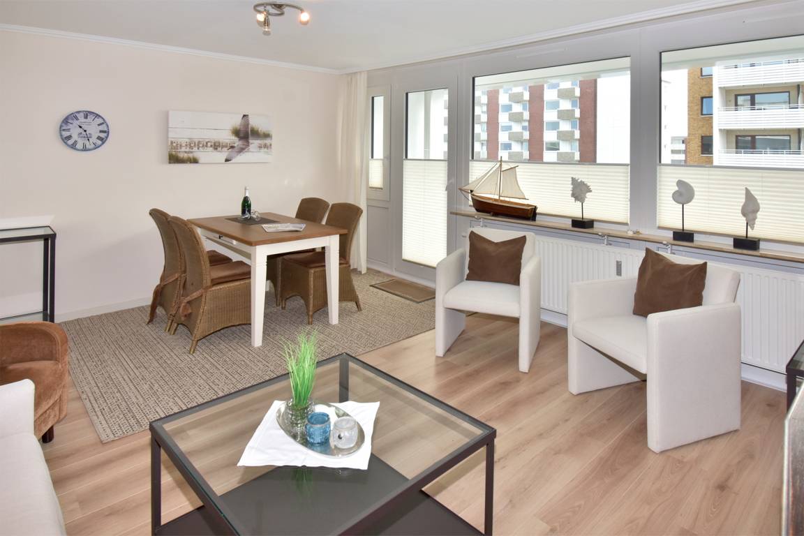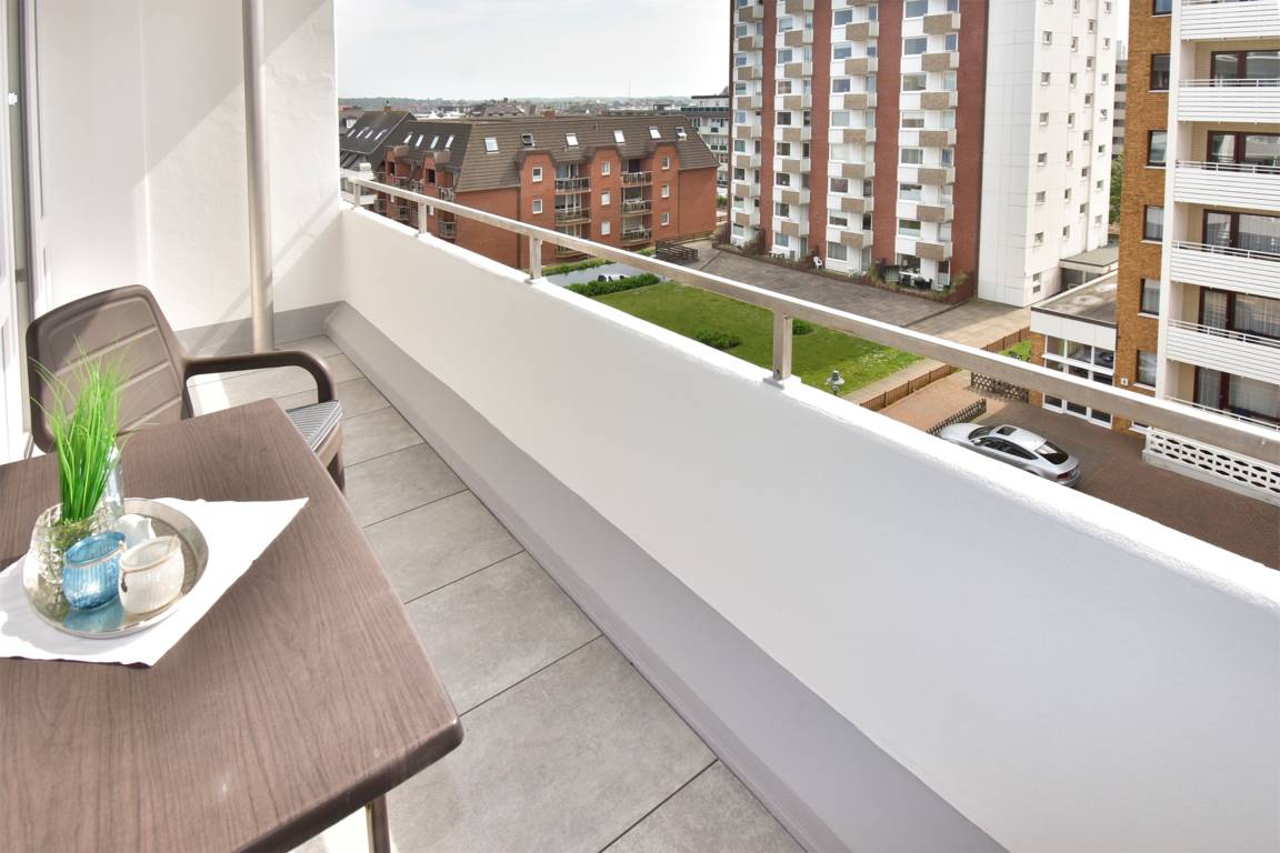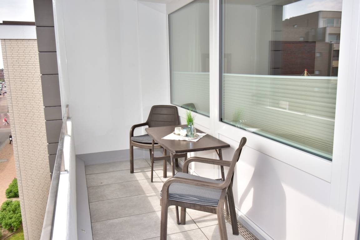 Aufwändig und modern renovierte und komplett mit Laminat ausgelegte 3-Zimmer-Nichtraucher-Ferienwohnung (ca. 63 qm) in der 4. Etage zur Landseite mit Ostloggia (Morgensonne, mit Balkonmöbeln und Auflagen) für max. 4 Personen.