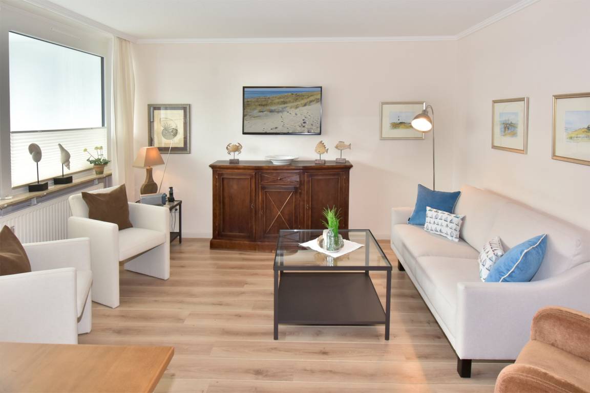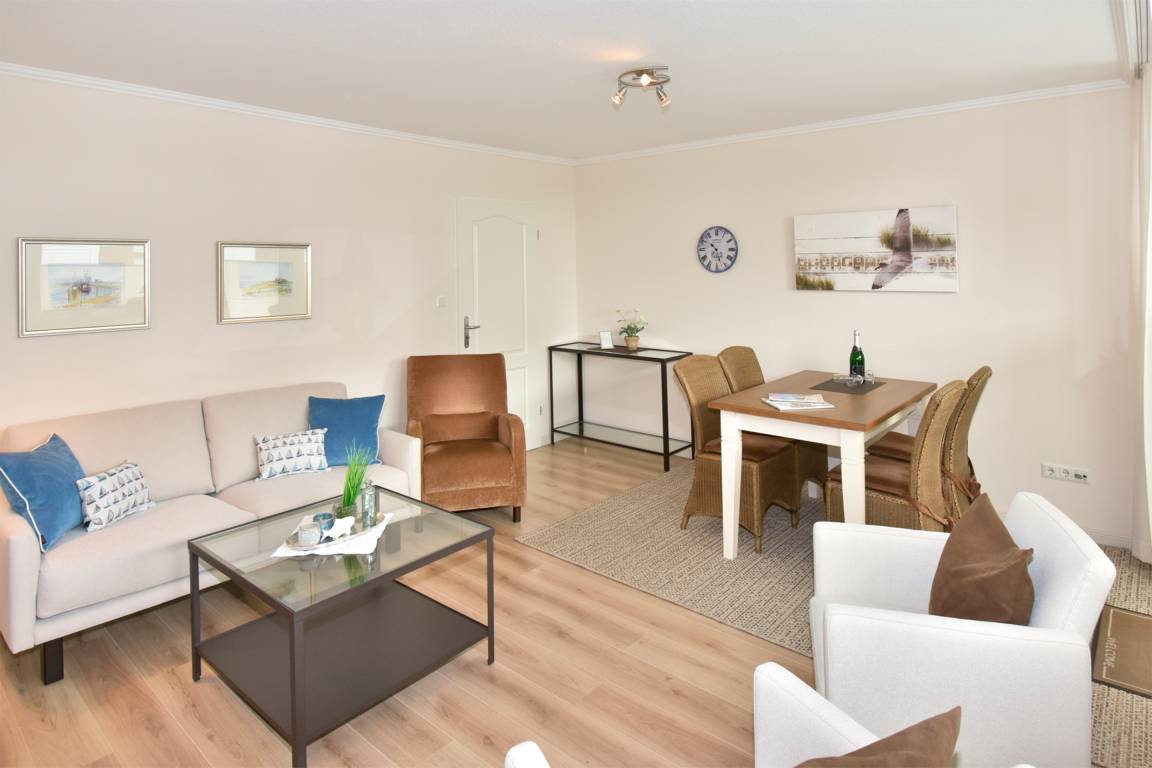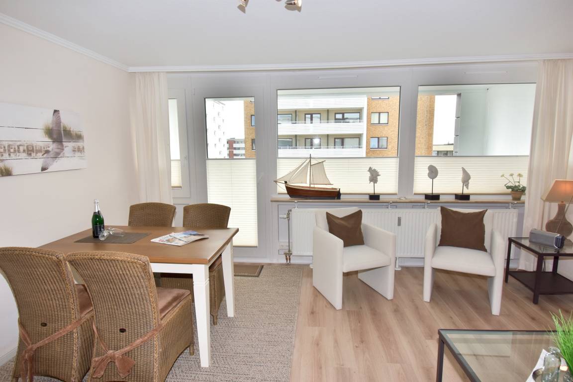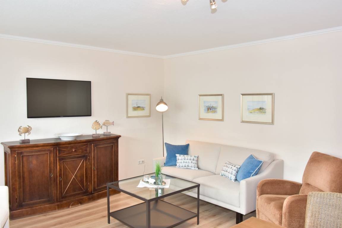 Der Wohnraum besteht aus einer bequemen Sitzgarnitur (Zweisitzer mit Sessel und Fußhocker), einem Essplatz, großer Flachbild-TV, DVD-Player, HiFi-Anlage und Telefon.