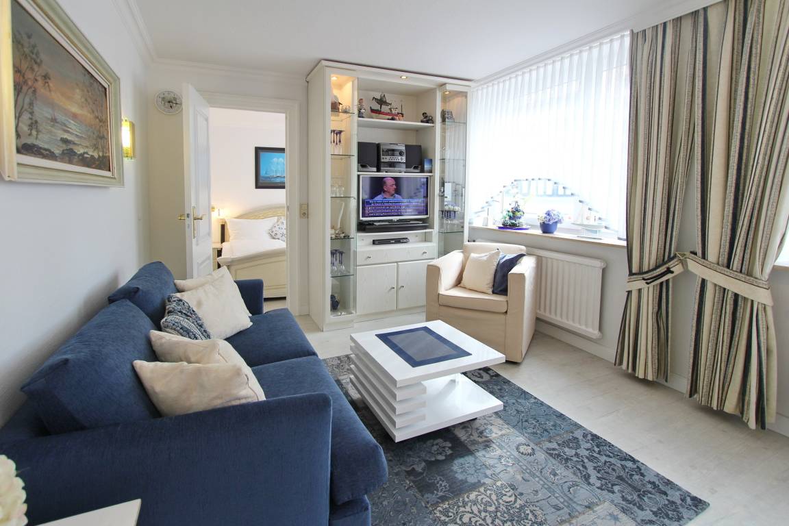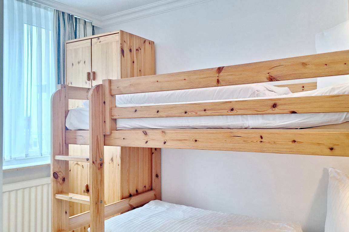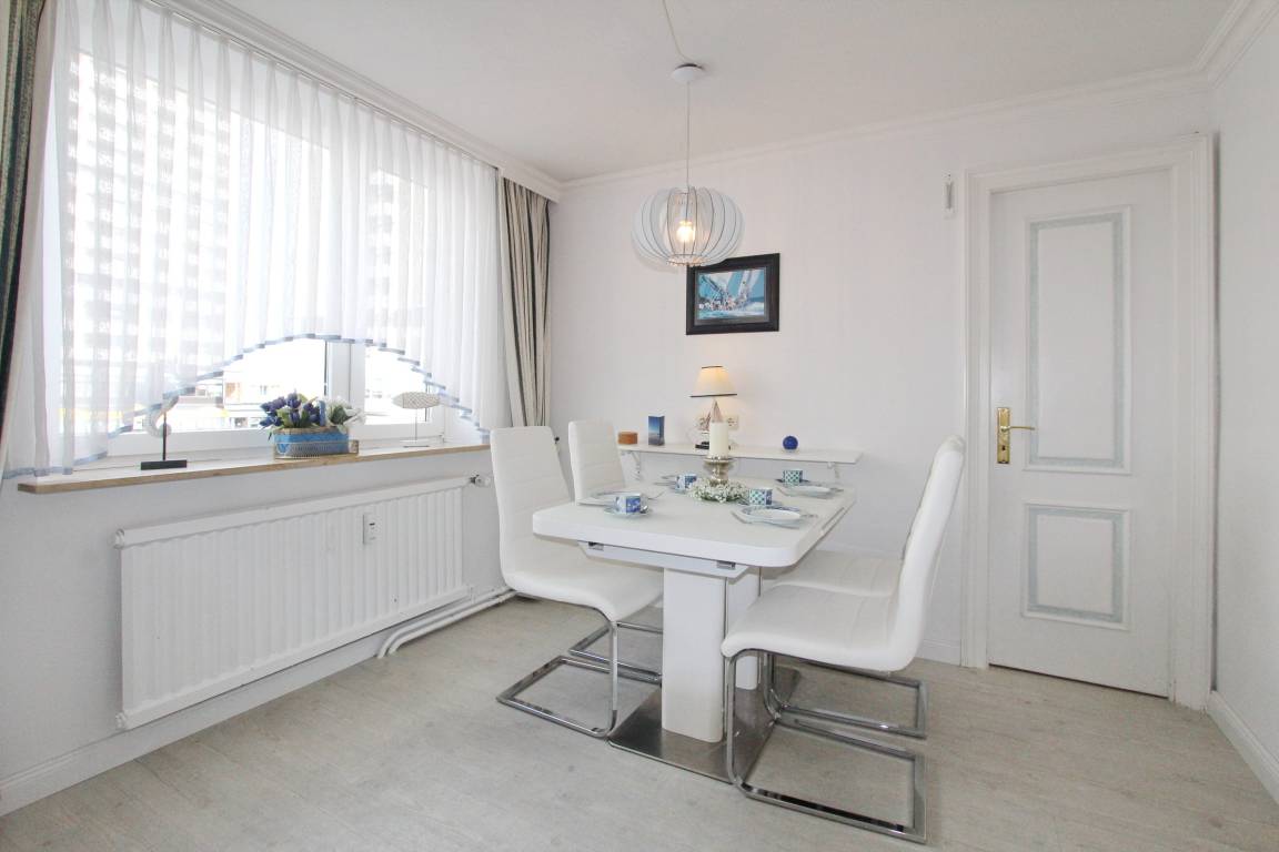 Maritim eingerichtete Dreizimmerwohnung in der 1. Etage in unmittelbarer Nähe zur Innenstadt und der Promenade von Westerland. Nur wenige Schritte trennen Sie von der Nordsee. Das Wohnzimmer verfügt über eine gemütliche Couch mit Sessel und einen Essplatz mit 4 Stühlen. Die komplette Fensterfront ist nach West ausgerichtet und lässt viel Licht in die Wohnung . Das 1. Schlafzimmer hat ein Doppelbett und einen begehbaren Kleiderschrank mit viel Stauraum. Im 2. Schlafzimmer befindet sich ein Etagenbett und ein Kleiderschrank. Die Küche ist separat und hat einen Backofen, Geschirrspüler und einen Herd mit 4 Ceranfeldkochstellen. Die umfangreiche Küchenausstattung ermöglicht es Ihnen sich selbst zu verpflegen. Das Badezimmer ist ausgestattet mit einer Dusche, einem Handtuchheizkörper und Fön. Besonders hervorzuheben ist die Waschmaschine im Bad zur Alleinnutzung. Den passwortfreien WLAN-Hotspot im Haus (WEG-AD3 - Passwortfrei - ohne Gewähr) können sie gerne kostenfrei nutzen. Die Größe dieser Nichtraucherwohnung ist ca. 50 m². Haustiere sind nicht gestattet. Der Stellplatz zur Wohnung ist separat buchbar (dieser befindet sich ca. 100m vom Objekt entfernt in der Elisabethstr./hinter Steffi Moden, Parkplatz Knoche) und kostet 10,00 Euro pro Tag.