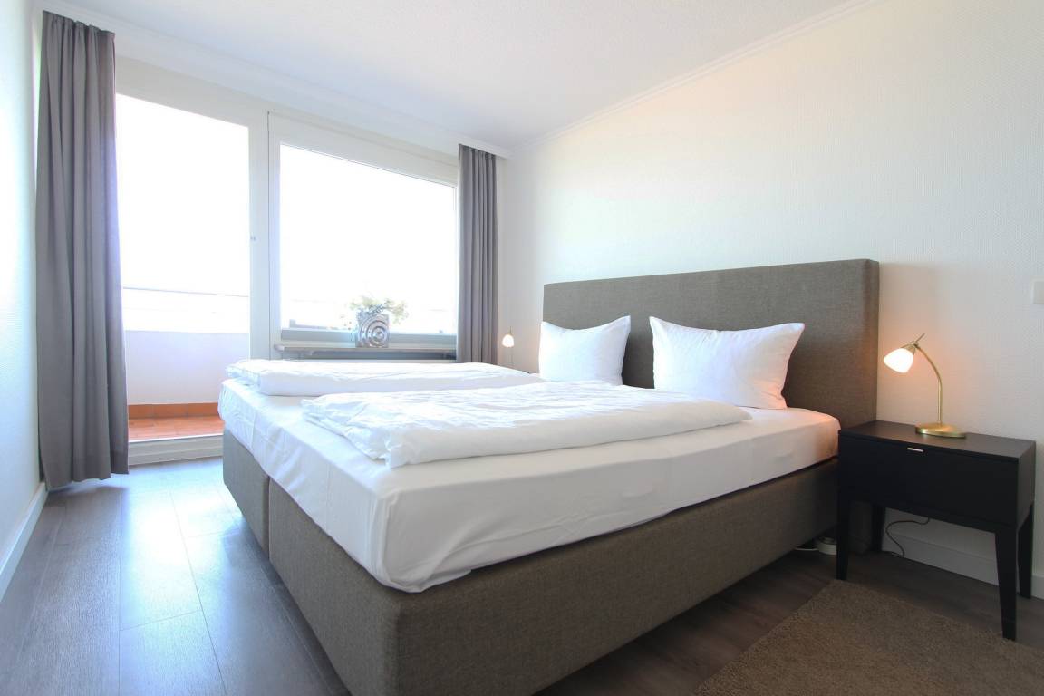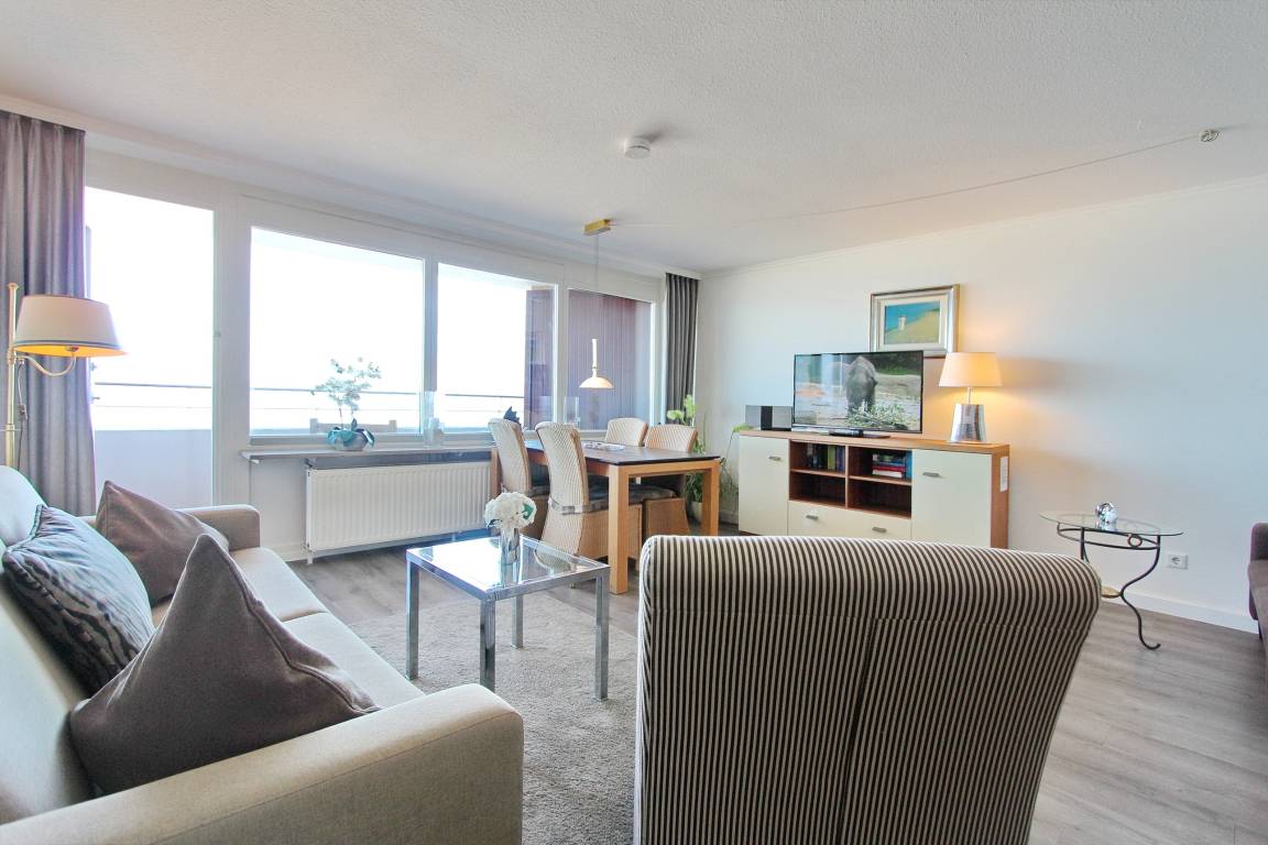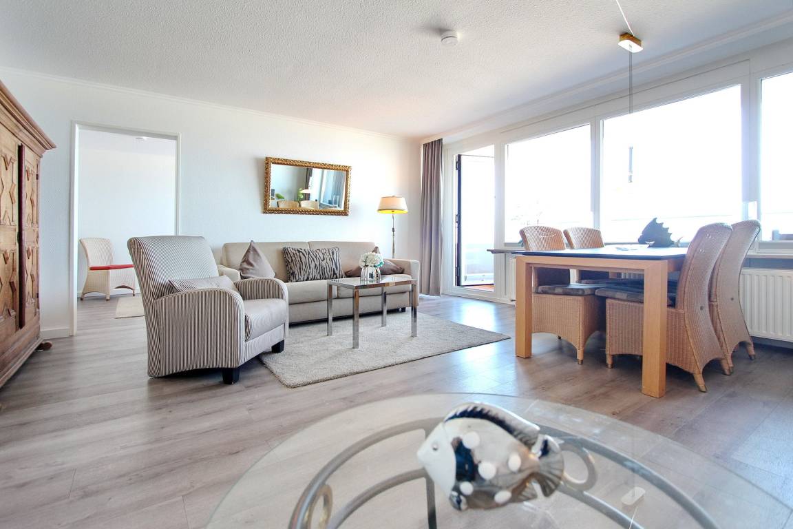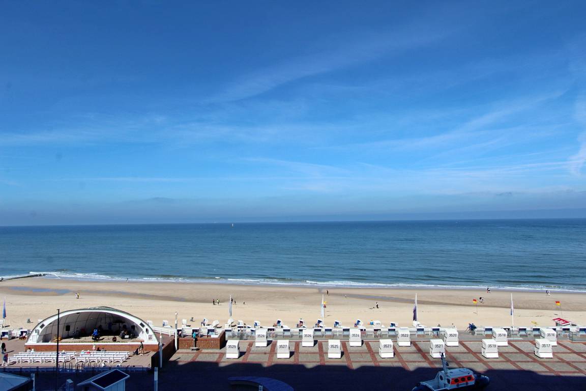 Diese große 2 Zimmer Wohnung in der 3. Etage im Haus Metropol hat einen herrlichem Blick auf den Strand und das Meer. Das Wohnzimmer hat einen vorgelagerten Westbalkon mit neuen Teakholzmöbeln und Kissen. Der Wohnraum ist eingerichtet mit einer Couch (mit Schlaffunktion), einem Sessel, einem Sideboard, einem großen, alten Holzschrank und einem Essplatz mit 4 Stühlen am Fenster. Zusätzlich gibt es eine kleine Leseecke mit Couch und Couchtisch. Im Schlafzimmer gibt es ein feststehendes Doppelbett, eine Kommode und einen eigenen Westbalkon. Ein Kleiderschrank mit reichlich Stauraum befindet sich in einem separaten Zimmer. Das Badezimmer hat eine Dusche mit niedrigem Einstieg einen Handtuchtrockner, Fön, Kosmetikspiegel, Duschhocker und einen mobilen Haltegriff. In der Küche gibt es einen Backofen, Geschirrspüler, eine zusätzliche Nespressomaschine und ein Ceranfeld mit 4 Herdplatten. Stilvoll decken Sie den Tisch mit Geschirr von Seltmann Weiden. Zur technischen Ausstattung dieser Wohnung gehört ein Flachbildfernseher von Panasonic mit integriertem Radio, eine Panasonic Stereoanlage und ein Telefon mit Flatrate ins dt. Festnetz. Ein freies WLAN Netzwerk (WEG Haus Metropol - Passwortfrei - ohne Gewähr) steht ihnen kostenfrei zur Verfügung. Wohnungsgröße: ca. 67 m².