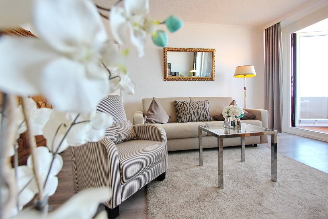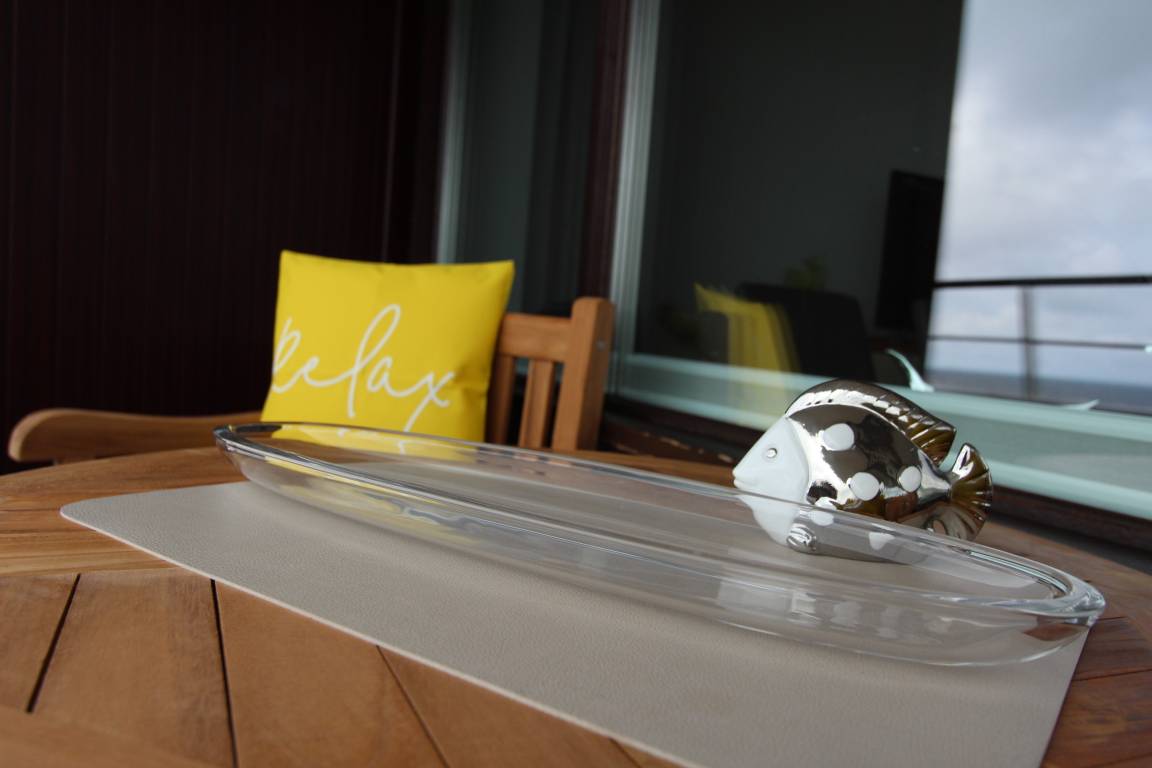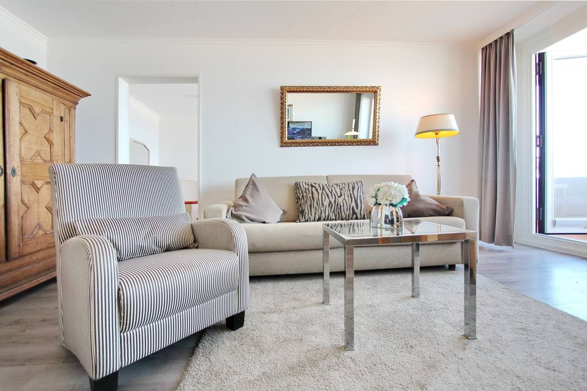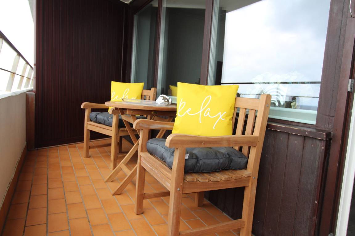 Diese große 2 Zimmer Wohnung in der 3. Etage im Haus Metropol hat einen herrlichem Blick auf den Strand und das Meer. Das Wohnzimmer hat einen vorgelagerten Westbalkon mit neuen Teakholzmöbeln und Kissen. Der Wohnraum ist eingerichtet mit einer Couch (mit Schlaffunktion), einem Sessel, einem Sideboard, einem großen, alten Holzschrank und einem Essplatz mit 4 Stühlen am Fenster. Zusätzlich gibt es eine kleine Leseecke mit Couch und Couchtisch. Im Schlafzimmer gibt es ein feststehendes Doppelbett, eine Kommode und einen eigenen Westbalkon. Ein Kleiderschrank mit reichlich Stauraum befindet sich in einem separaten Zimmer. Das Badezimmer hat eine Dusche mit niedrigem Einstieg einen Handtuchtrockner, Fön, Kosmetikspiegel, Duschhocker und einen mobilen Haltegriff. In der Küche gibt es einen Backofen, Geschirrspüler, eine zusätzliche Nespressomaschine und ein Ceranfeld mit 4 Herdplatten. Stilvoll decken Sie den Tisch mit Geschirr von Seltmann Weiden. Zur technischen Ausstattung dieser Wohnung gehört ein Flachbildfernseher von Panasonic mit integriertem Radio, eine Panasonic Stereoanlage und ein Telefon mit Flatrate ins dt. Festnetz. Ein freies WLAN Netzwerk (WEG Haus Metropol - Passwortfrei - ohne Gewähr) steht ihnen kostenfrei zur Verfügung. Wohnungsgröße: ca. 67 m².