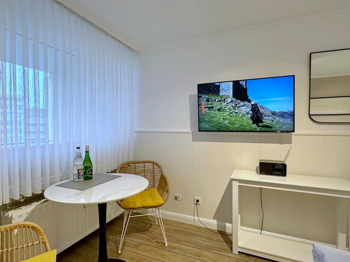 Sie wohnen in einer modernen 1-Zimmer-Ferienwohnung mit 23 m² im 1.OG vom Haus "Metropol" und haben einen möblierten Ostbalkon. Die Ferienwohnung ist hochwertig möbliert und für 2 Personen ausgestattet. Sie wohnen in direkter Lage am Strand und sind nur wenige Schritte von der Fußgängerzone entfernt. Das Wohn-/ Schlafzimmer mit Doppelbett (140*200) hat einen Essplatz am Fenster, Flat-TV, Radio und WLAN (ohne Gewähr). Die moderne Küchenzeile mit Geschirrspüler und Mikrowelle ist im Flurbereich und für 2 Personen voll ausgestattet. Anliegend ist das Duschbad mit WC. Tierhaltung ist nach Anmeldung erlaubt. Bettwäsche und Handtücher sind zur Anreise aufgezogen. Ein PKW-Stellplatz kann kostenpflichtig zugebucht werden.